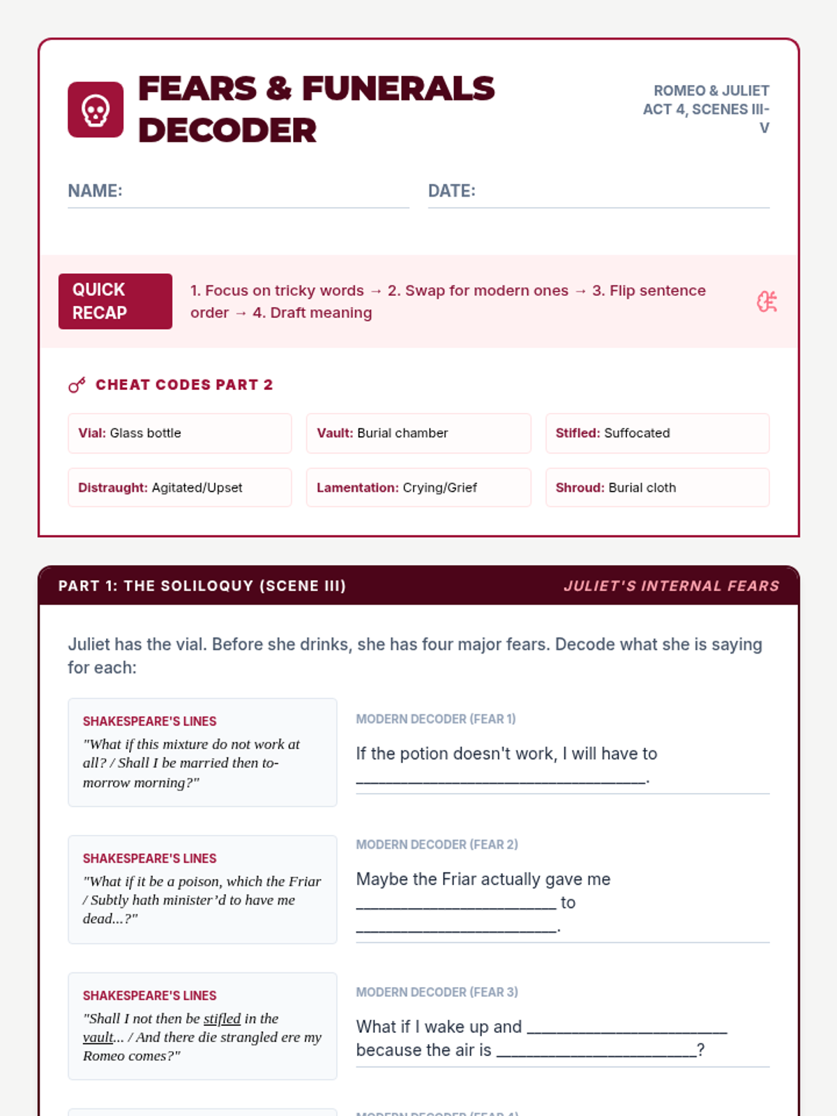 Students will learn the 'Decoder Strategy' for paraphrasing and apply it to the secret plan developed between Juliet and Friar Laurence, as well as Juliet's deceptive apology to her father.