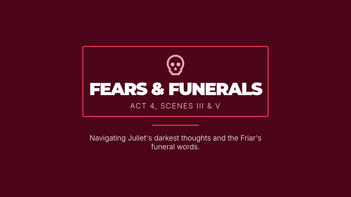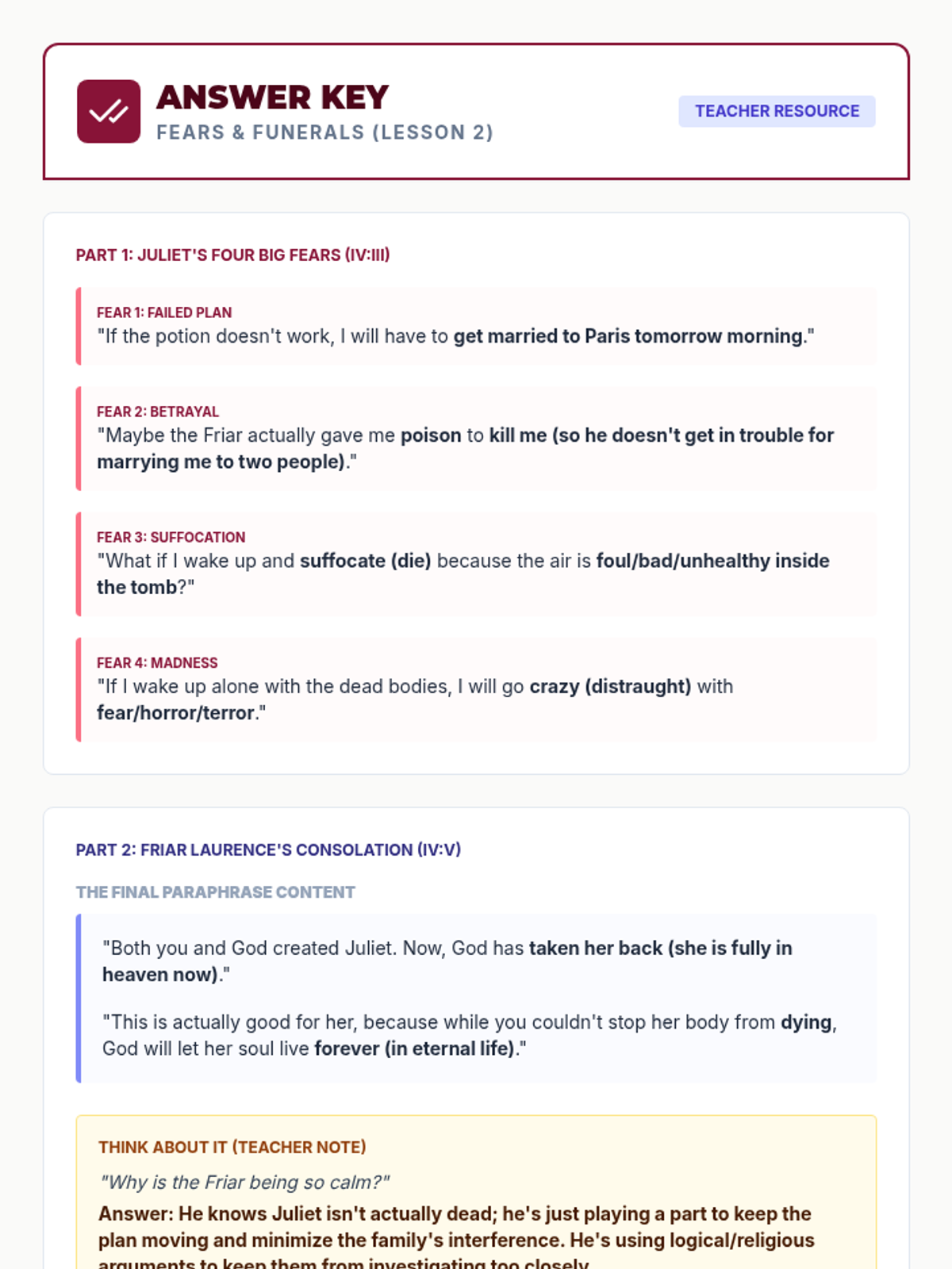 Students will analyze Juliet's internal fears before taking the potion and the Friar's words of comfort to the Capulets, using complex imagery to practice high-level paraphrasing.