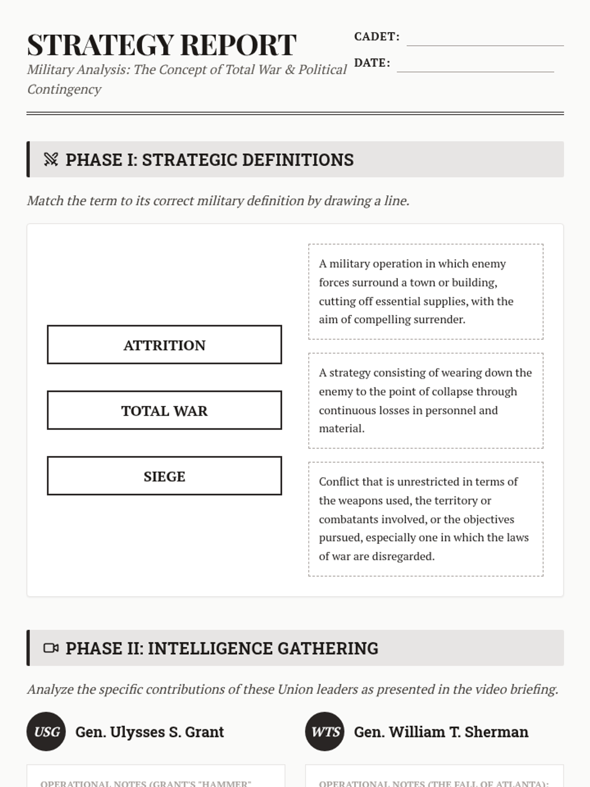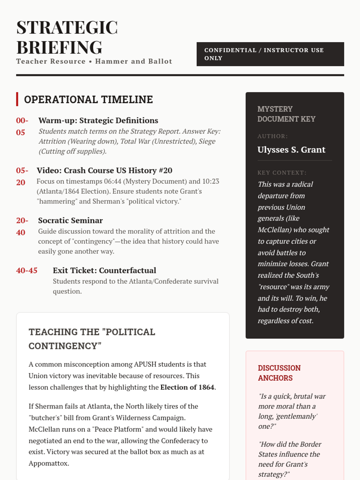 A high-school level investigation into the military strategy of attrition and the political turning points of 1864, focusing on Ulysses S. Grant's 'hammer' strategy and William T. Sherman's capture of Atlanta.
