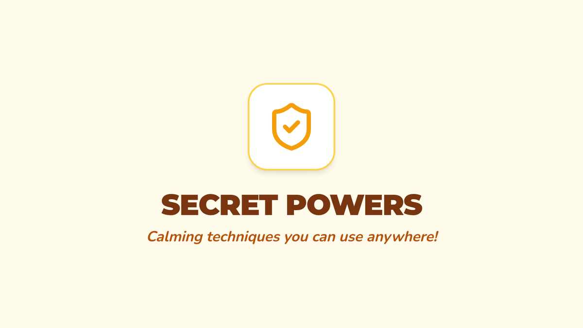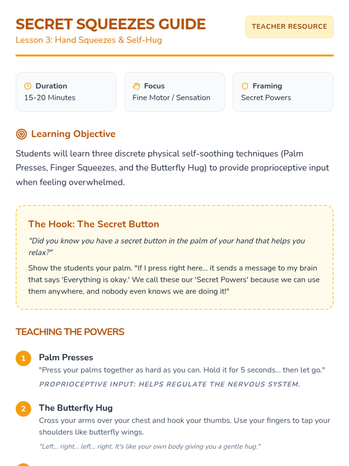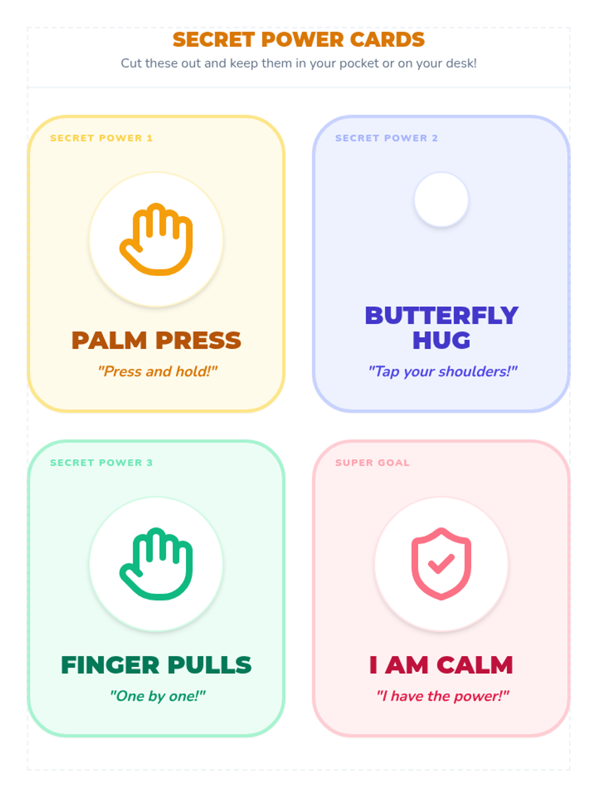 Students are taught discrete physical interventions like palm presses, finger pulls, and the 'butterfly hug.' These strategies are framed as 'secret powers' they can use while sitting on the carpet or at a desk.