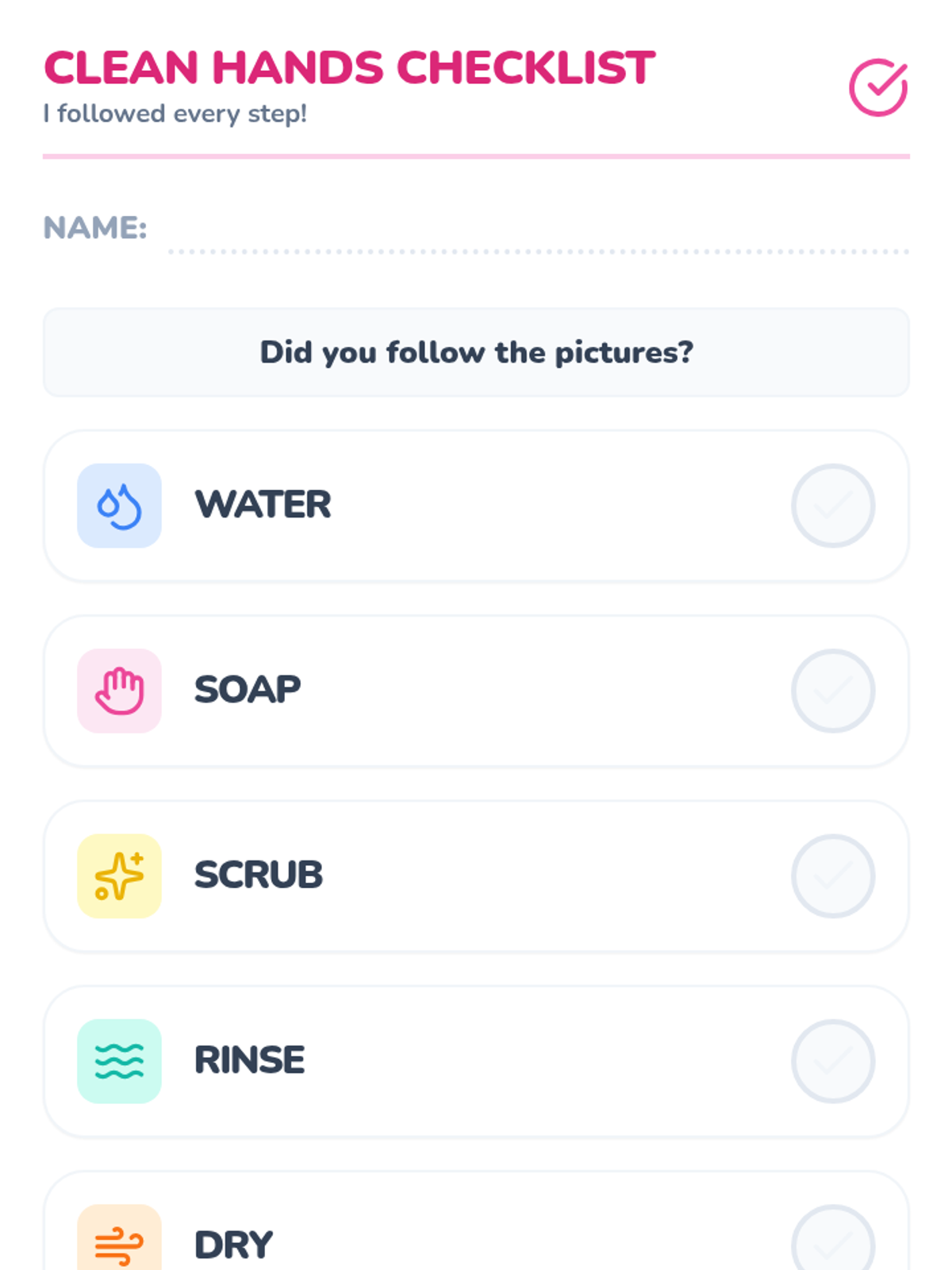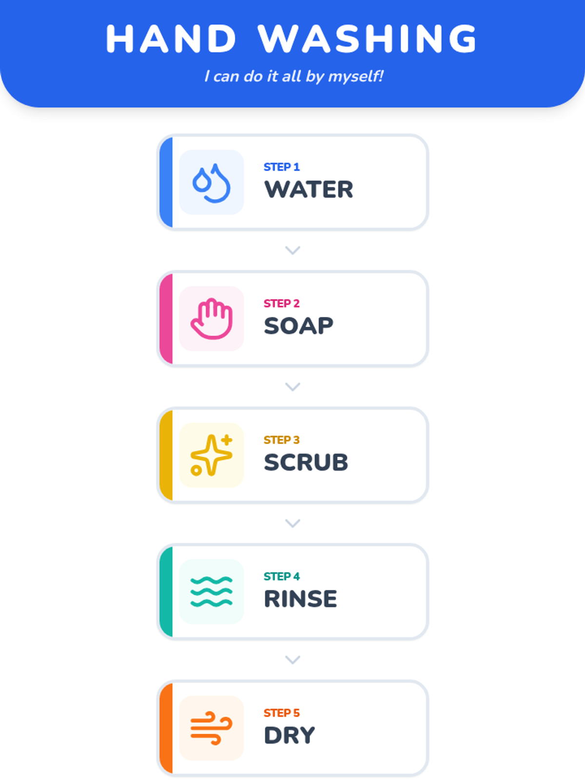 Students use a vertical visual strip to navigate the multi-step process of washing their hands independently.