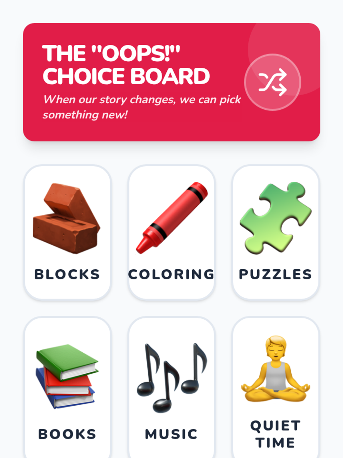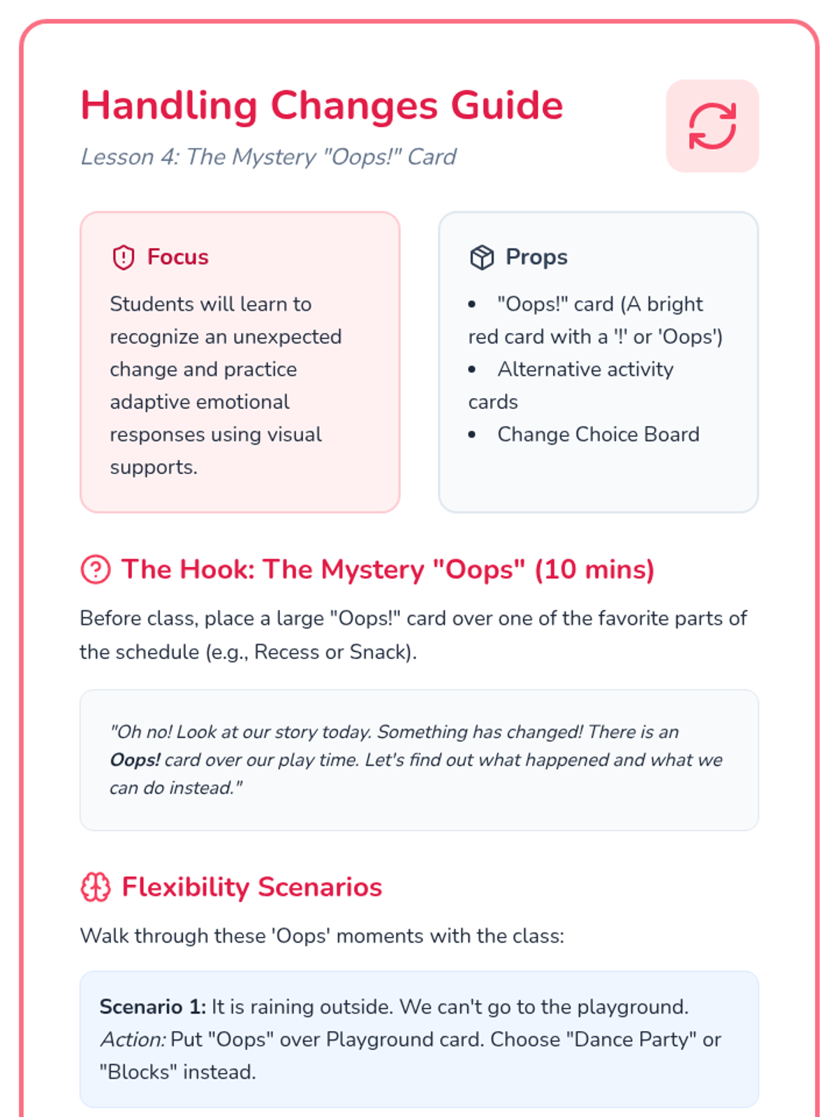 Teaches flexibility and problem-solving when daily routines change unexpectedly using 'Oops' cards.