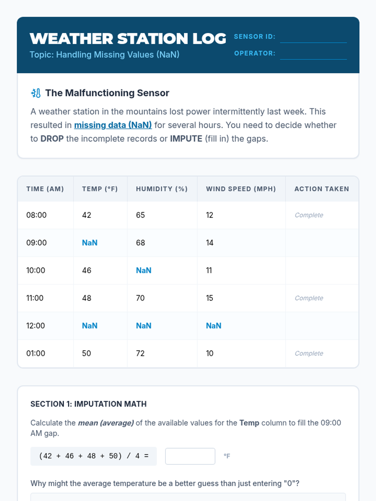 An investigation into techniques for dealing with null or NaN values, comparing the impacts of dropping data versus imputation.