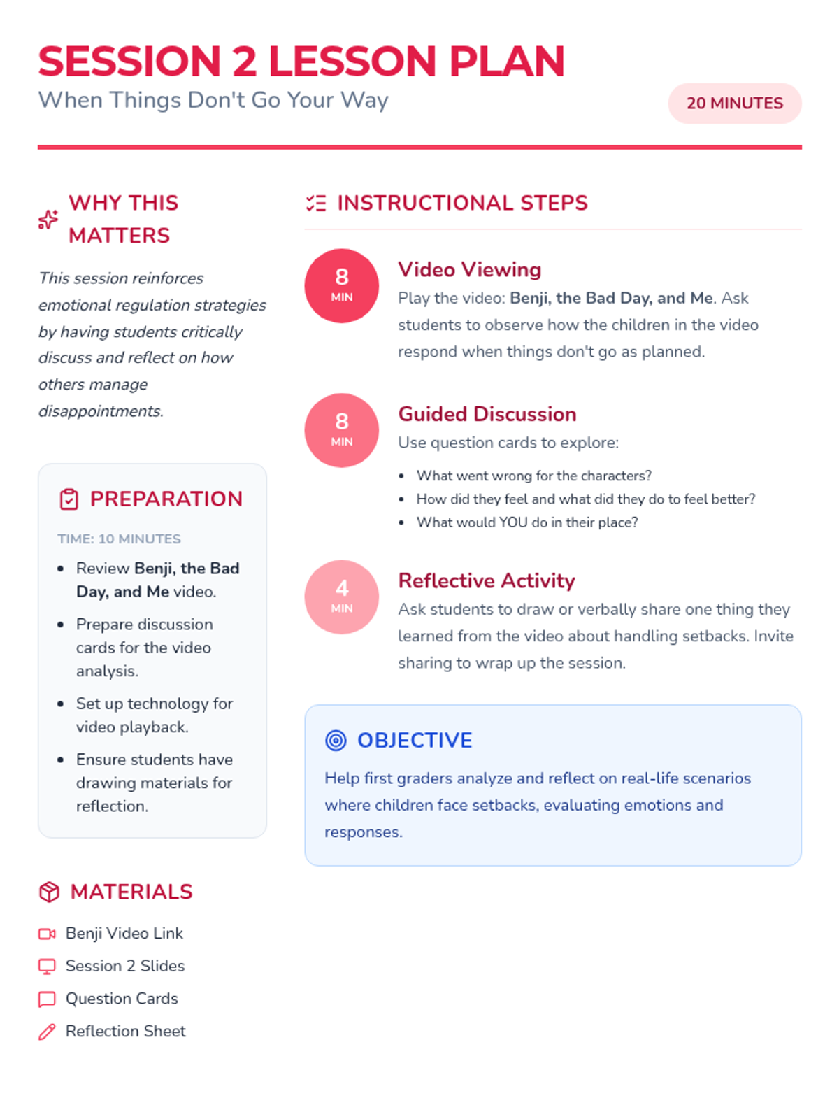 Students watch a story about handling a 'bad day' and reflect on strategies to manage setbacks and disappointments positively.