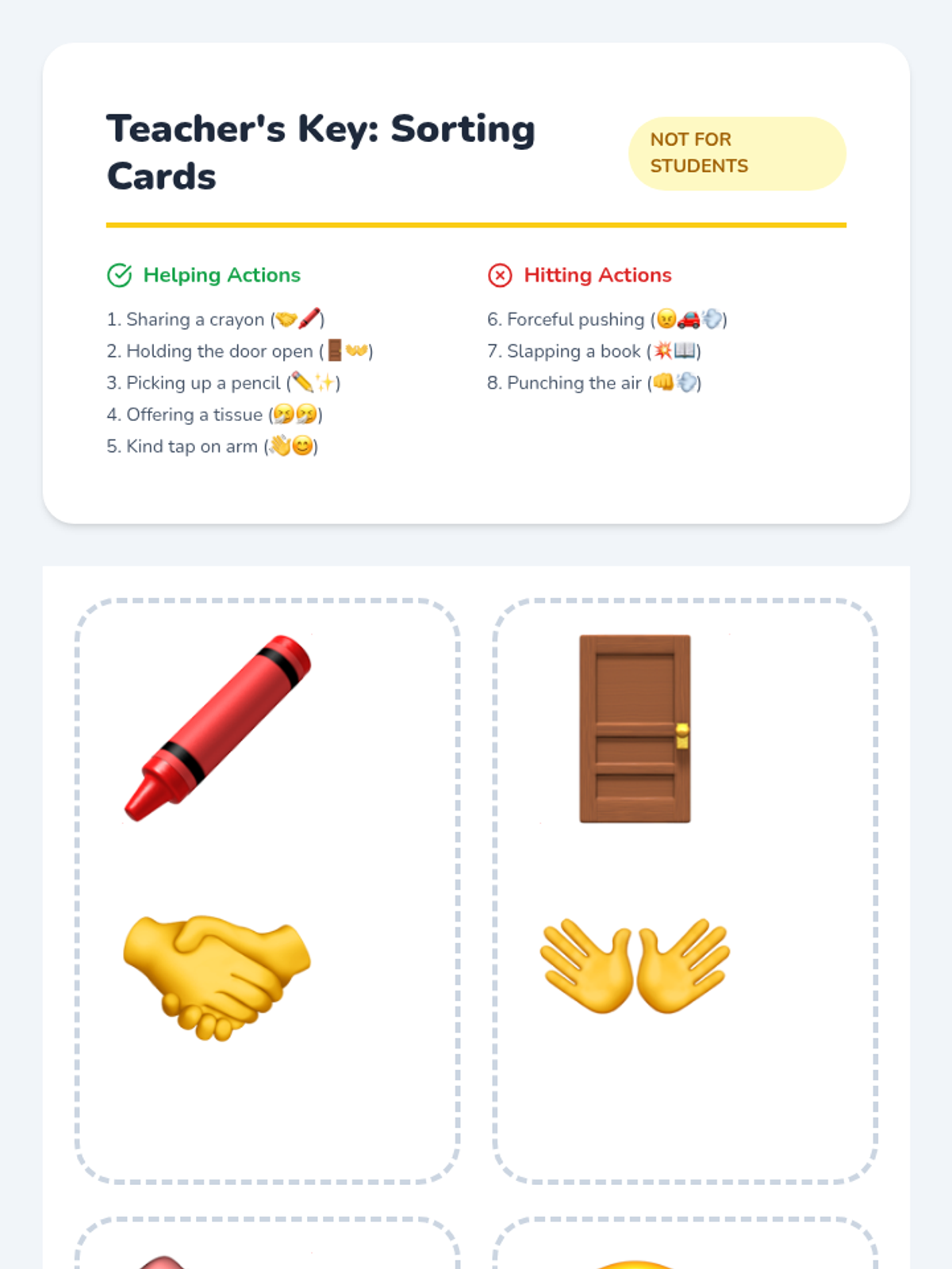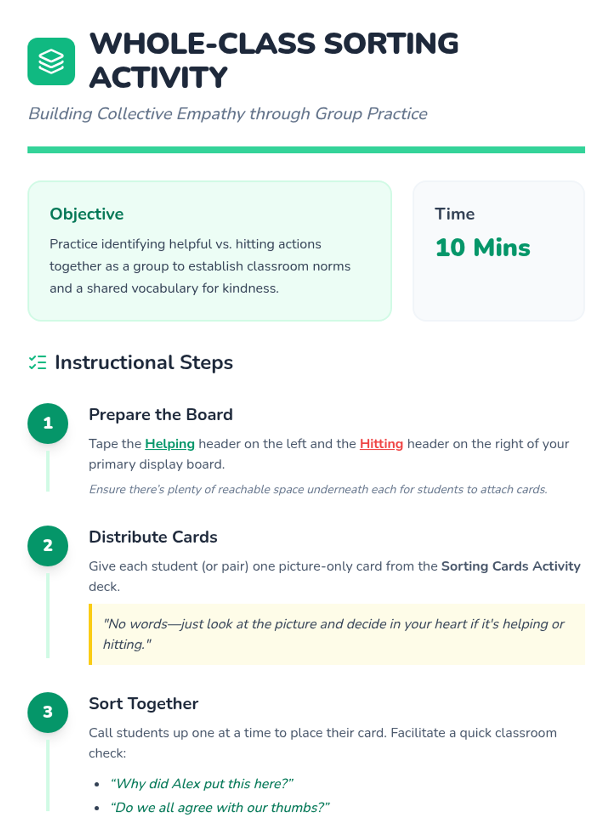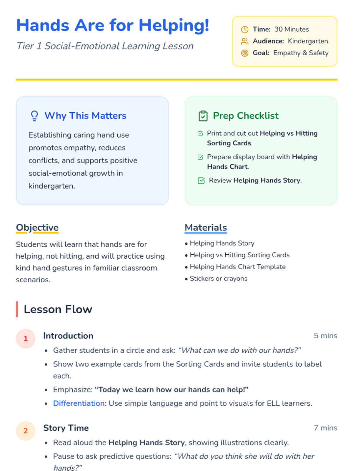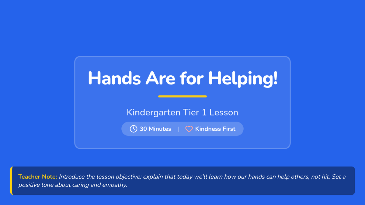 A 30-minute Tier 1 kindergarten lesson focusing on social-emotional learning by teaching students that hands are for helping, not hitting through stories, sorting, and role-play.