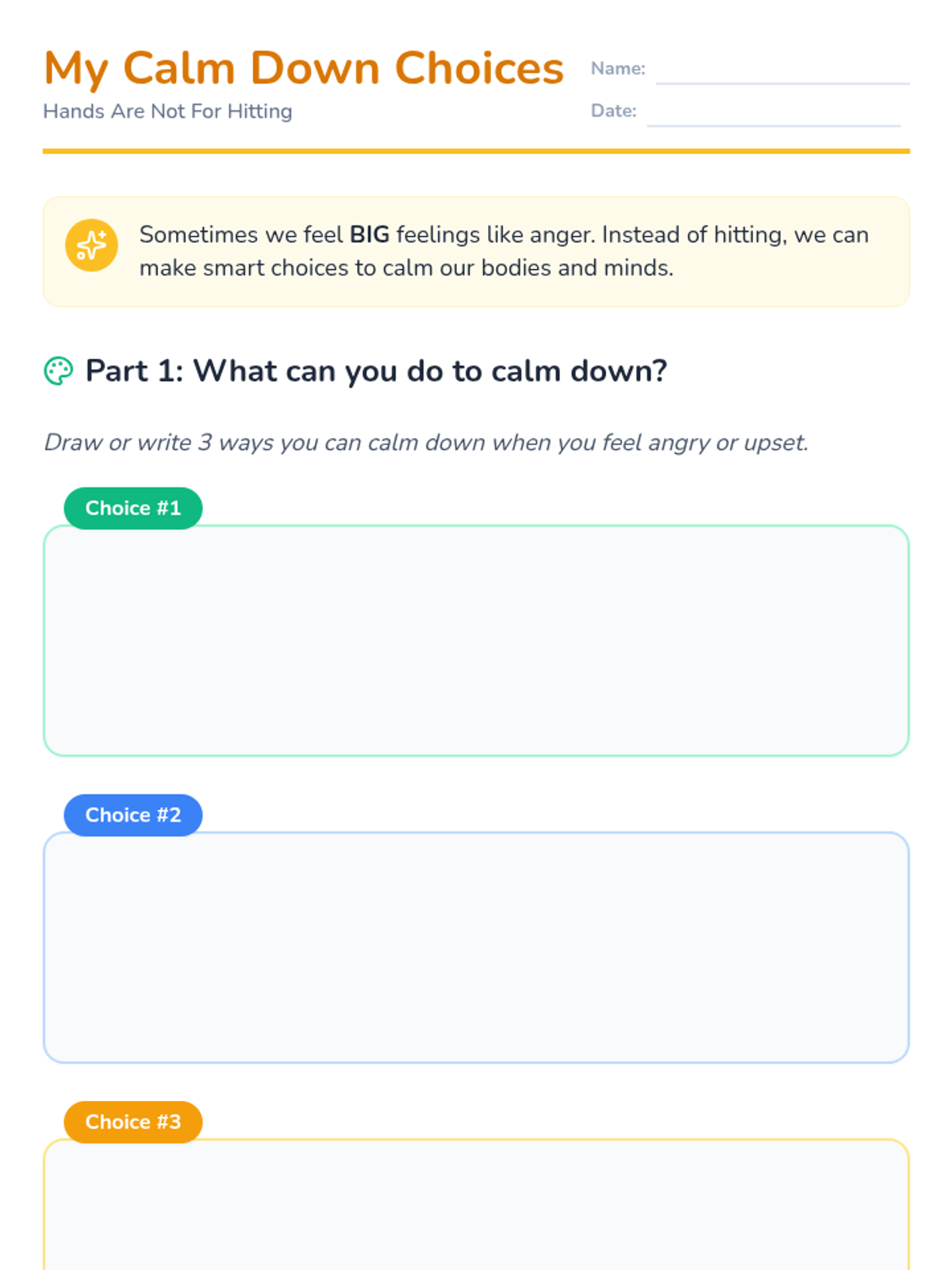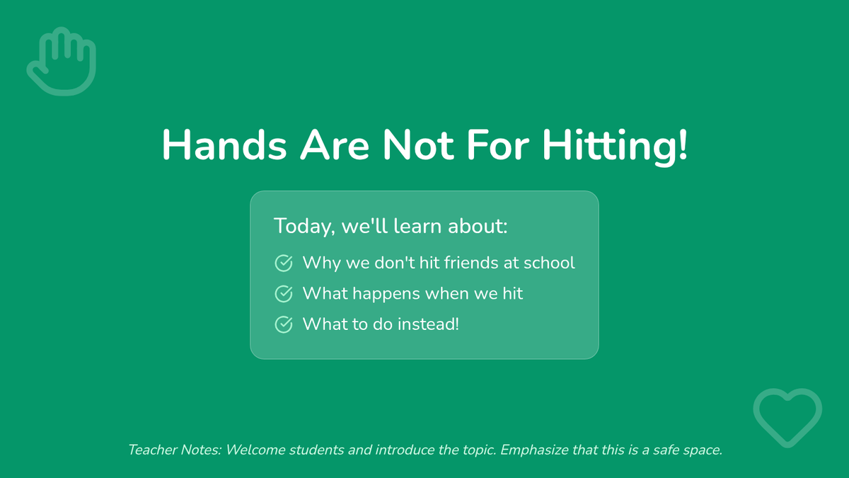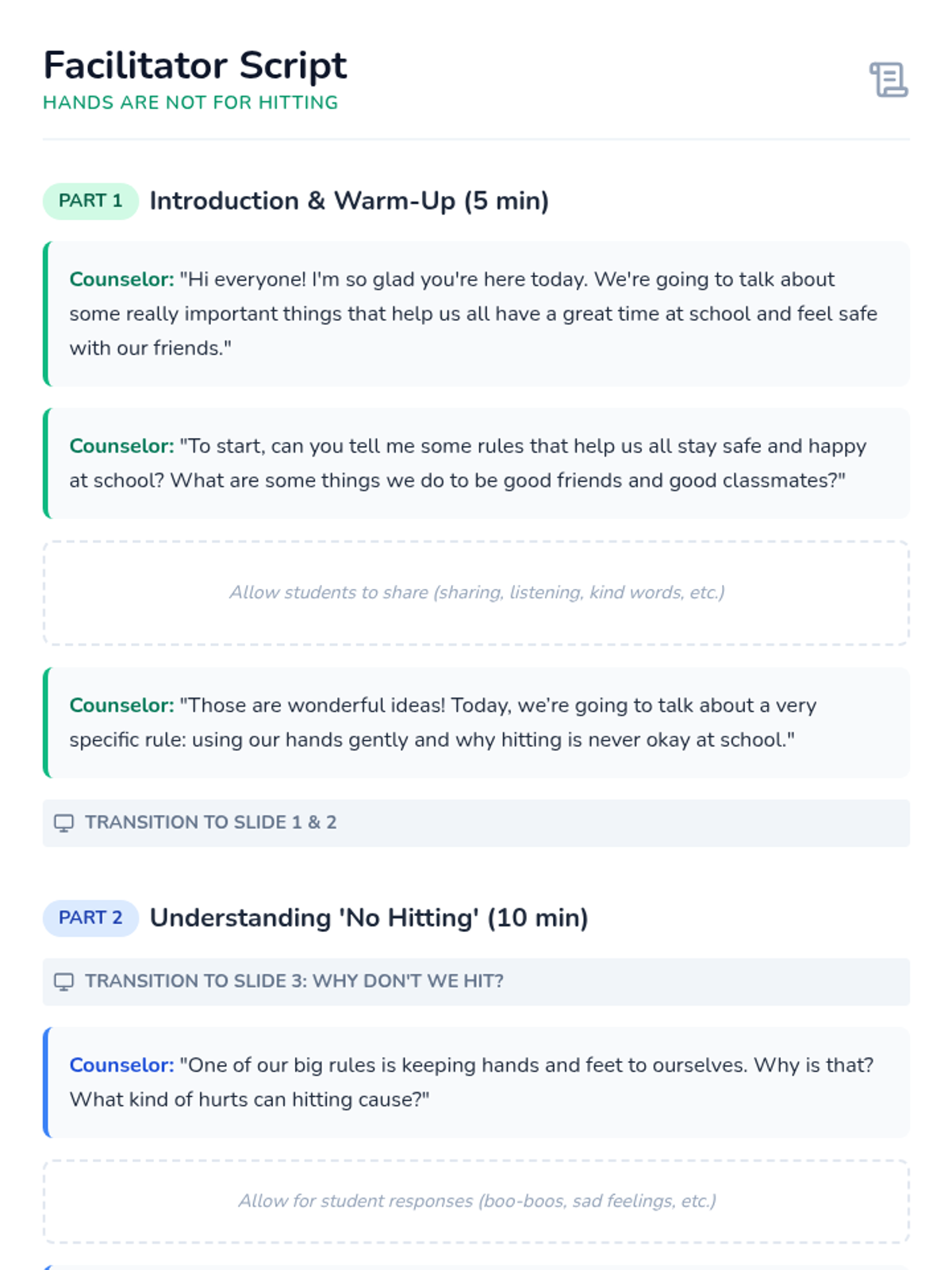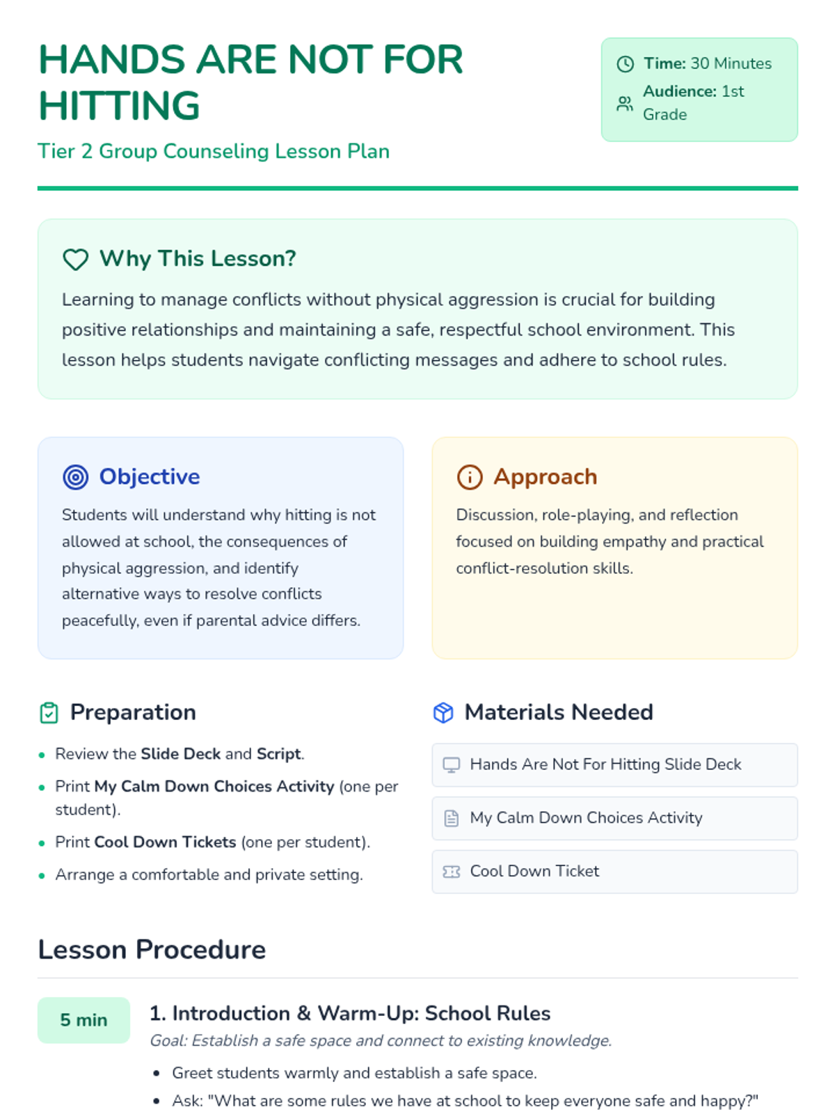 A Tier 2 group counseling lesson for 1st-grade students to understand why hitting is not allowed at school, how to manage conflicts peacefully, and the difference between school rules and home advice.