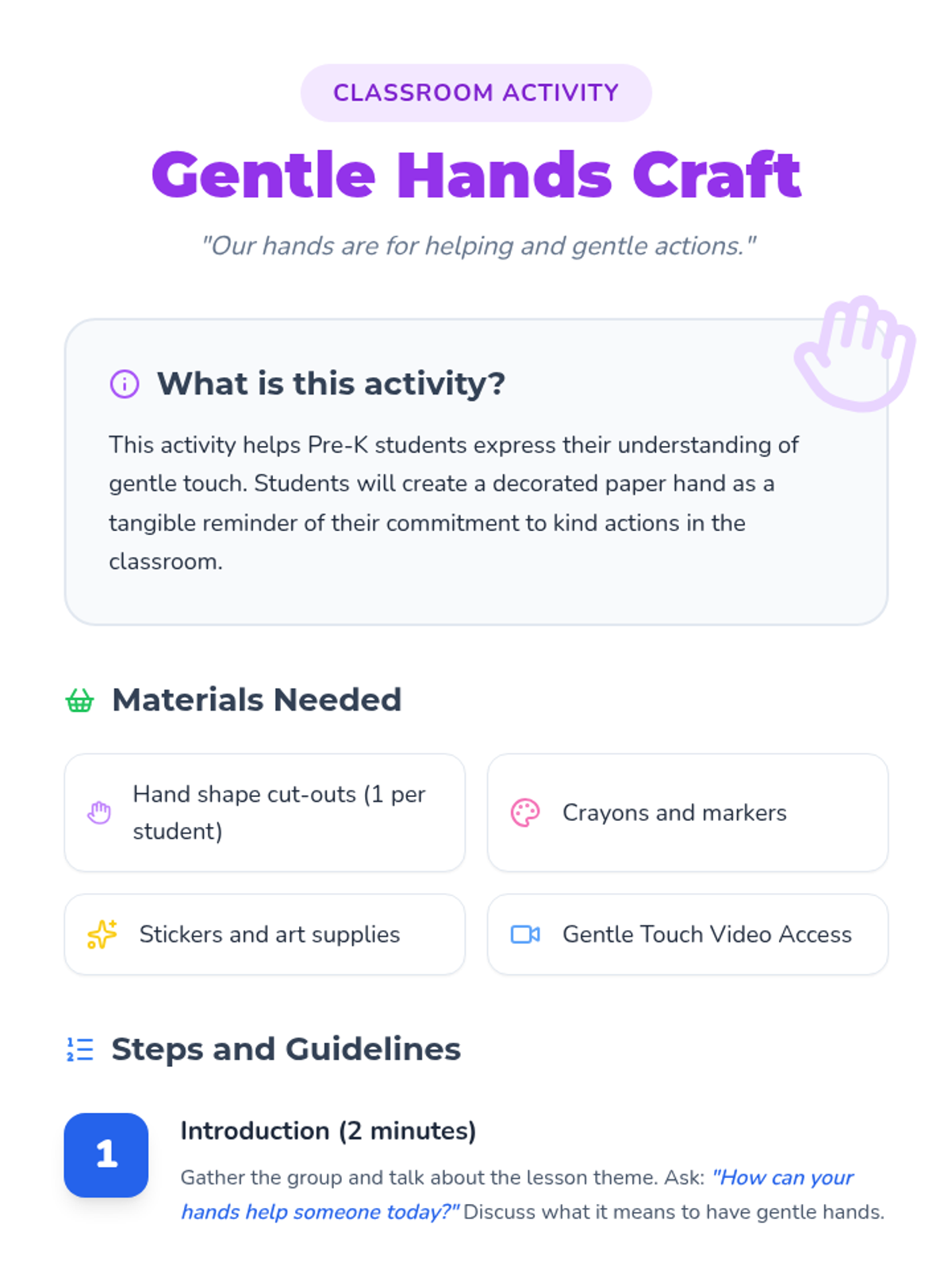 This lesson teaches Pre-K students that hands are for helping and kind actions, not hitting. Through a story, discussion, and a hands-on craft, students learn to express feelings positively and build a safe classroom community.
