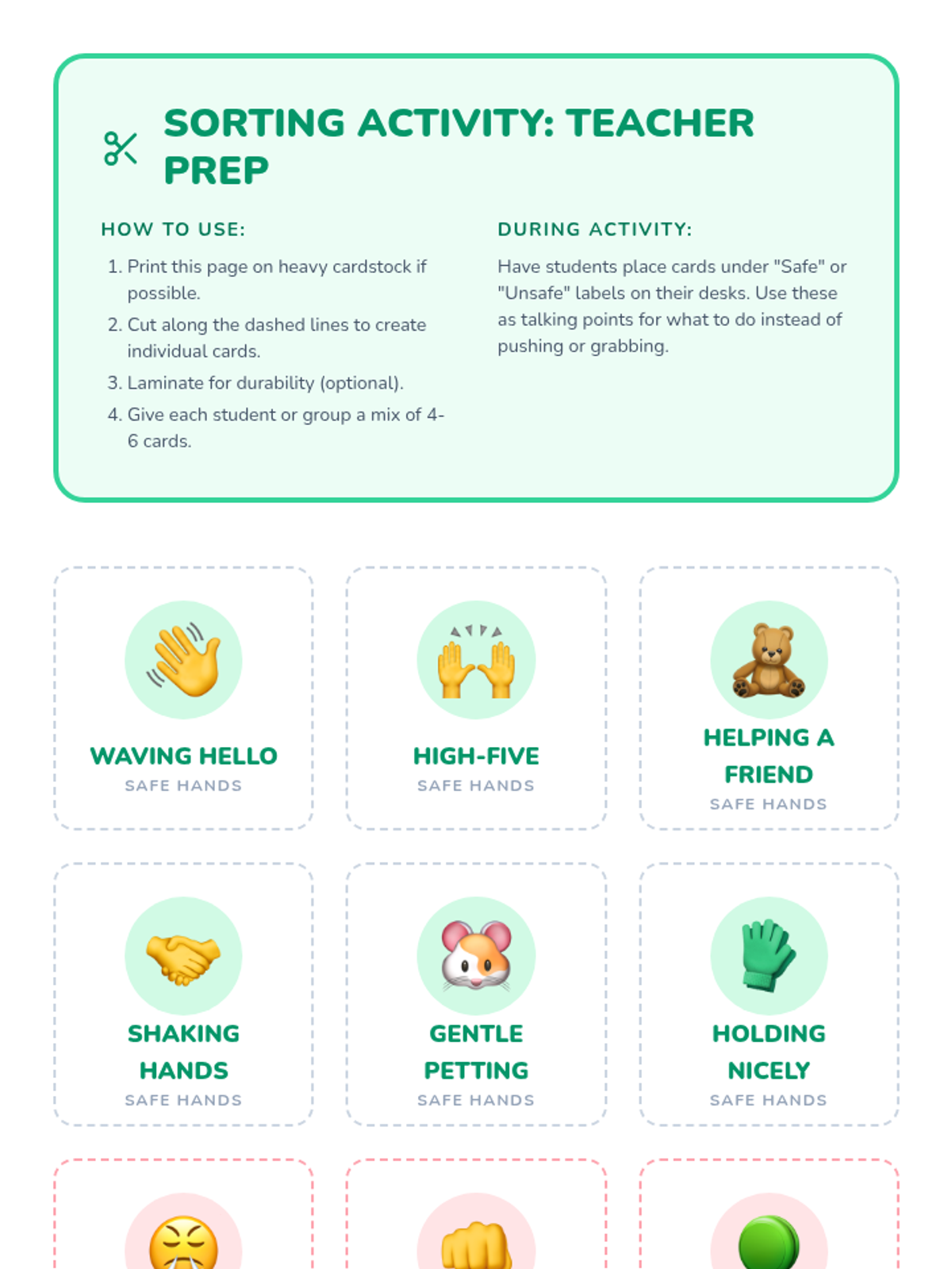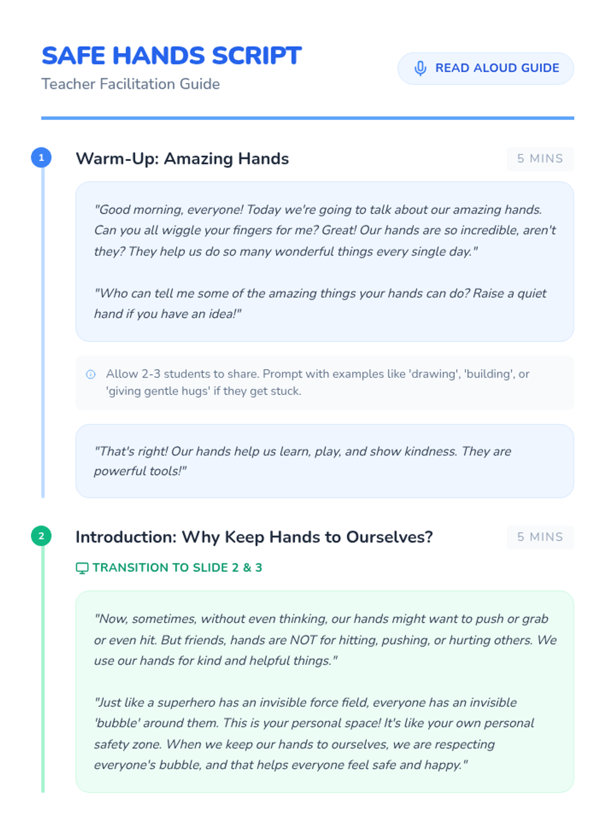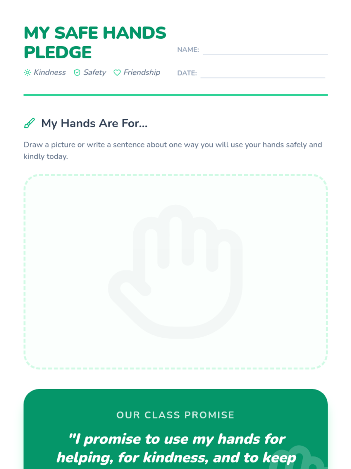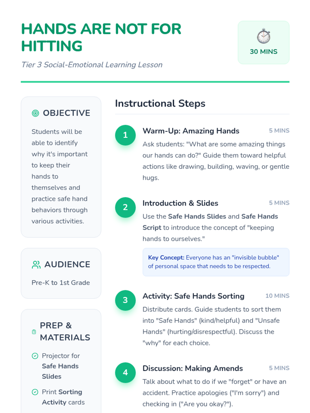 A Tier 3 social-emotional learning lesson for Pre-K and 1st-grade students focused on personal space, safe physical interactions, and the concept that hands are for helping, not hurting.