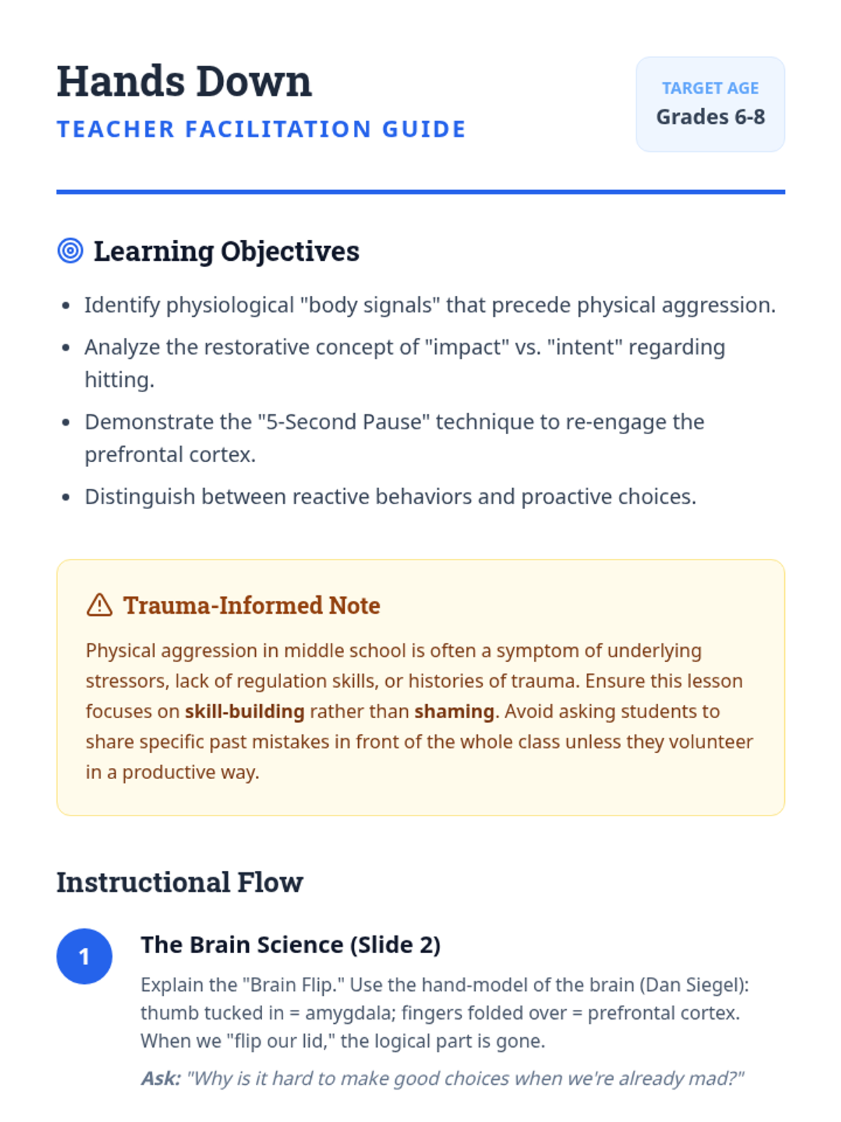 This lesson focuses on self-regulation and empathy, helping middle school students understand why they might resort to physical aggression and providing them with concrete tools to choose alternative behaviors. Students will explore the impact of hitting on their community and practice 'The Pause' technique.