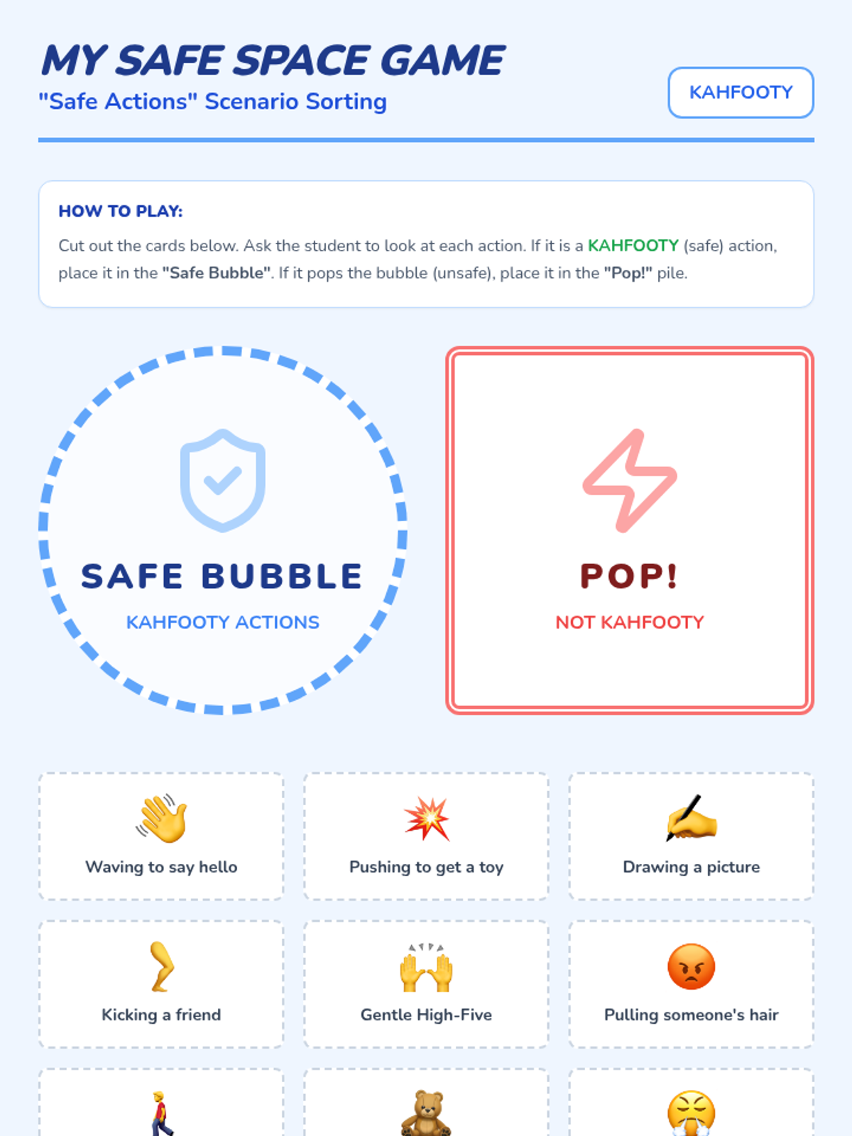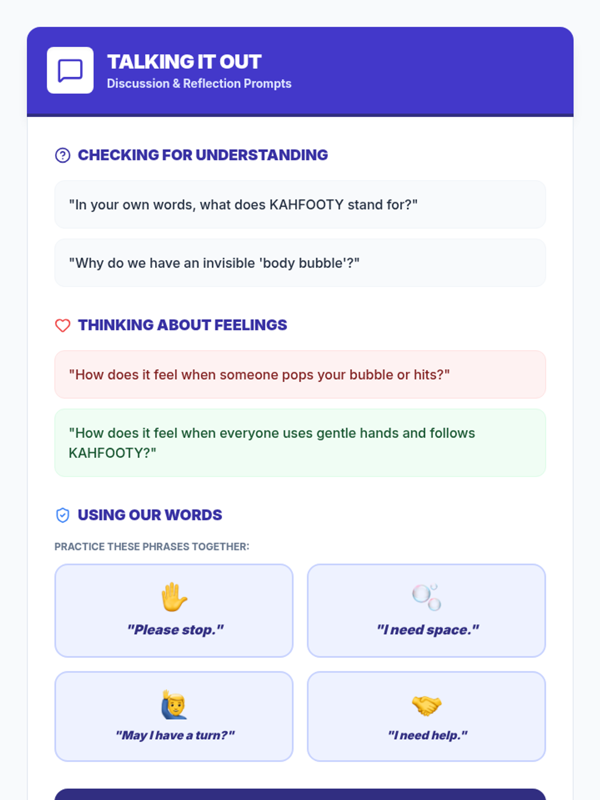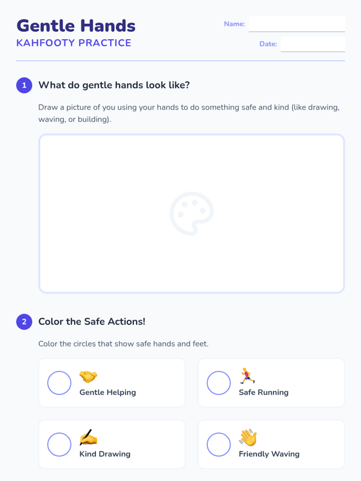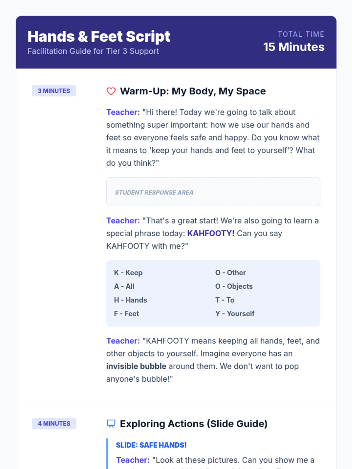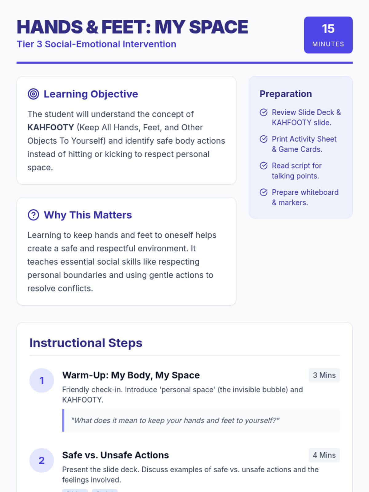 A Tier 3 intervention lesson for kindergarteners to learn and practice KAHFOOTY (Keep All Hands, Feet, and Other Objects To Yourself), focusing on personal space and gentle actions.