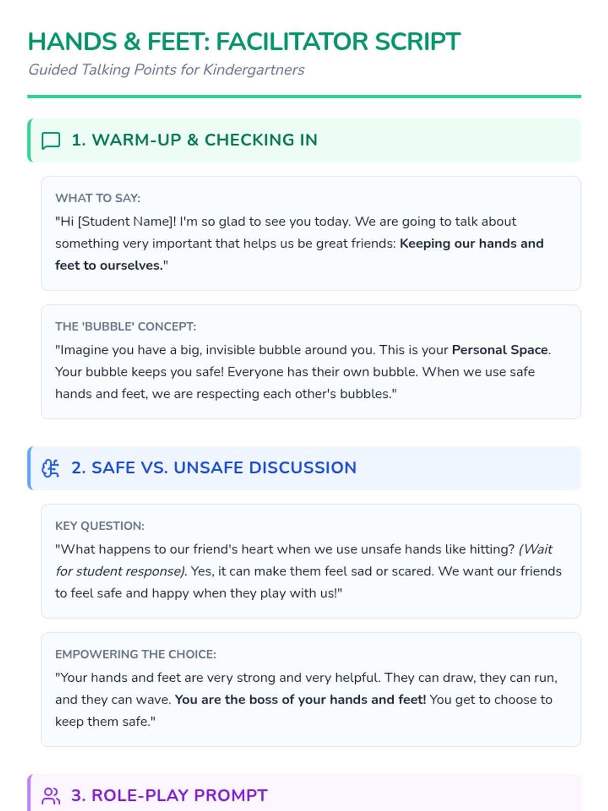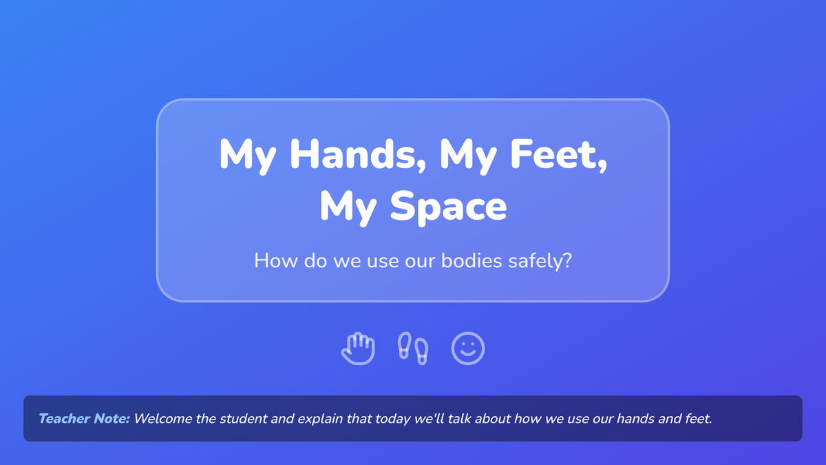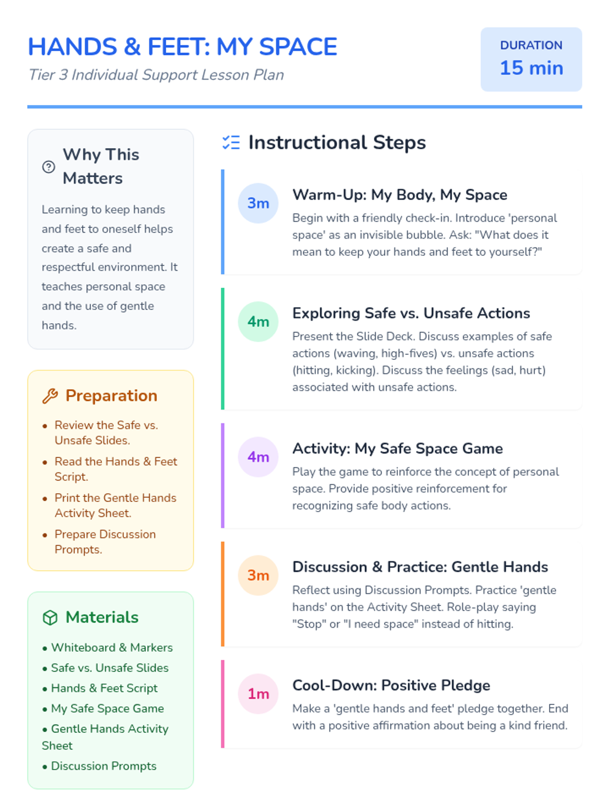 This individual Tier 3 lesson helps a kindergartener understand and practice keeping their hands and feet to themselves. Through a 15-minute session, students learn about personal space, distinguish between safe and unsafe actions, and practice gentle interactions.