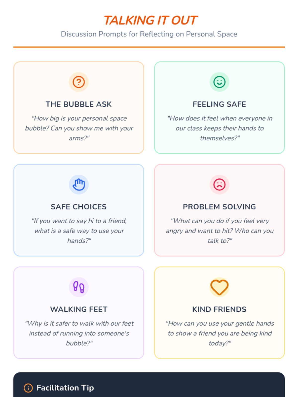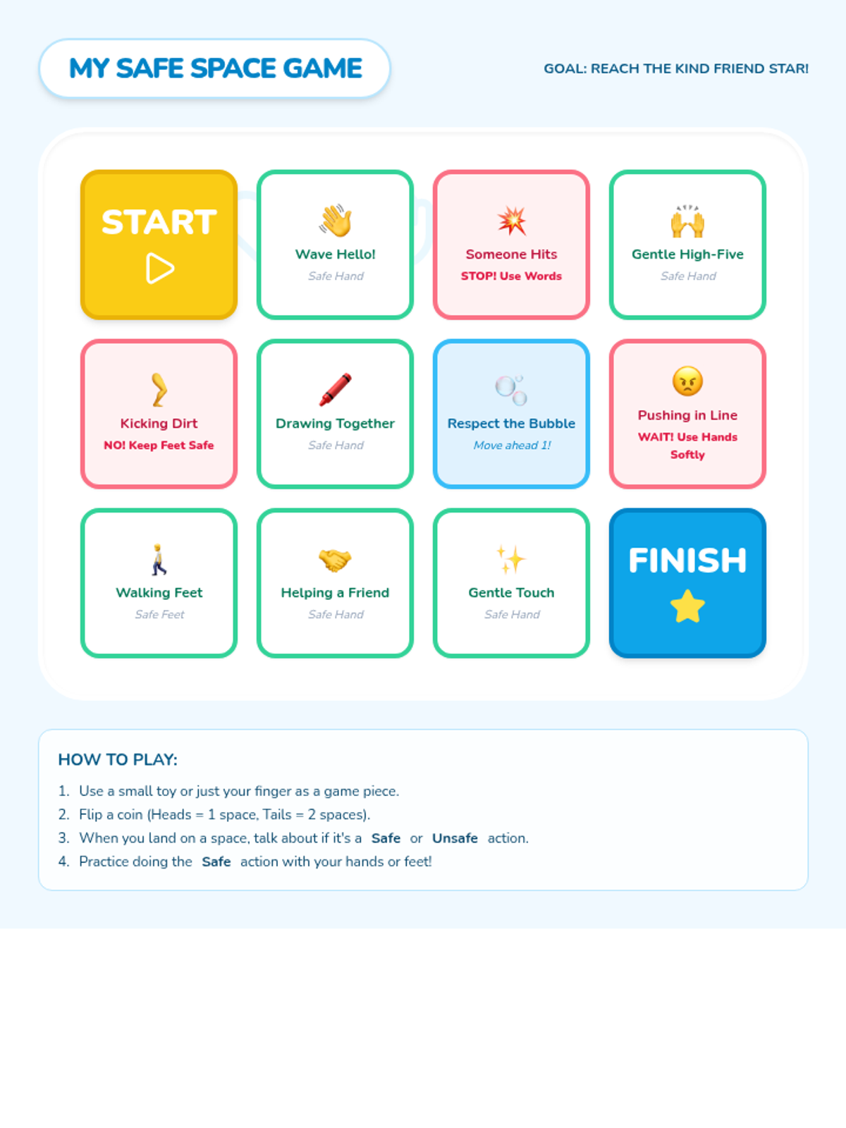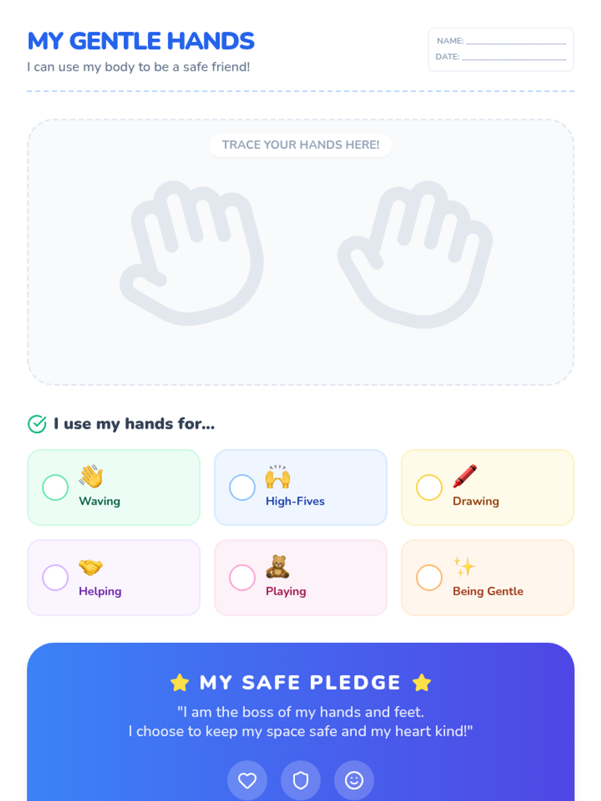 This individual Tier 3 lesson helps a kindergartener understand and practice keeping their hands and feet to themselves. Through a 15-minute session, students learn about personal space, distinguish between safe and unsafe actions, and practice gentle interactions.