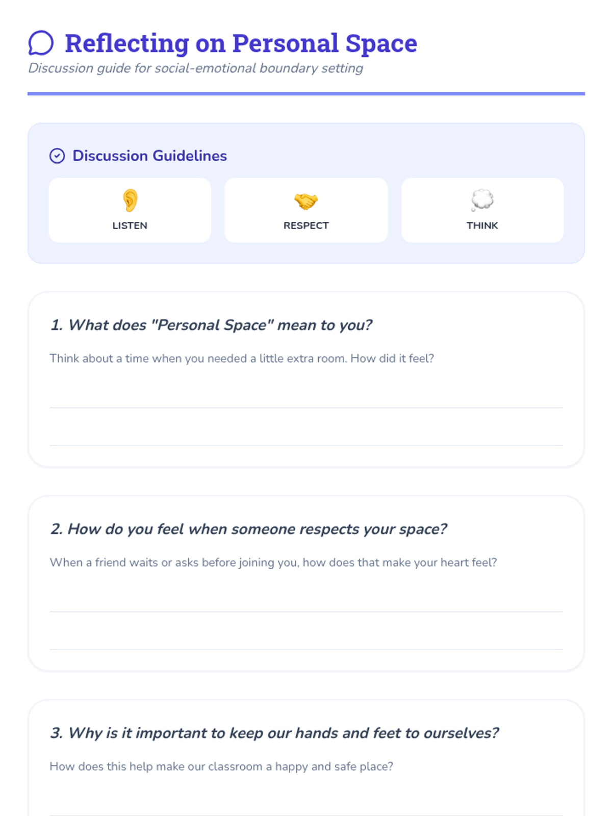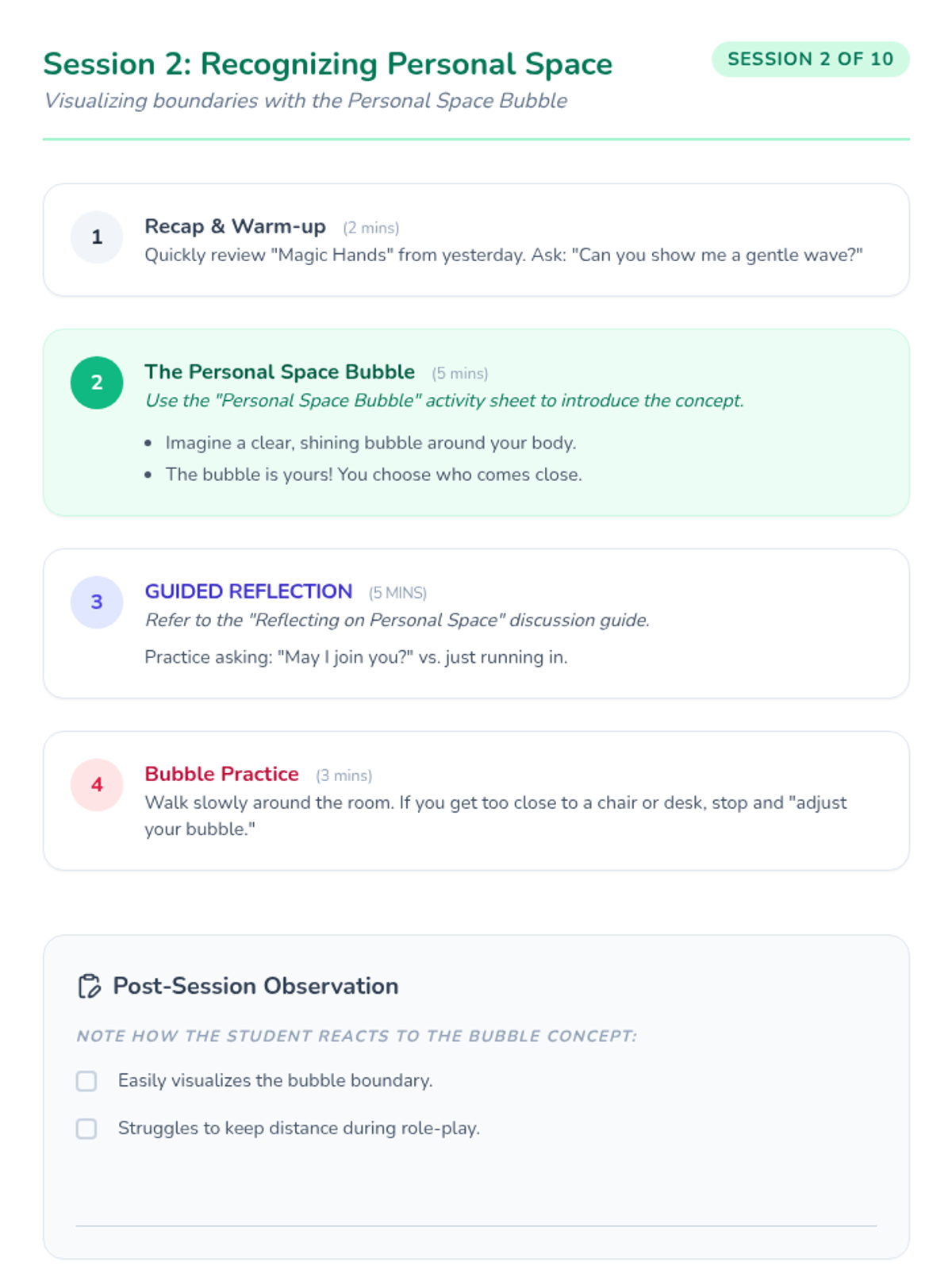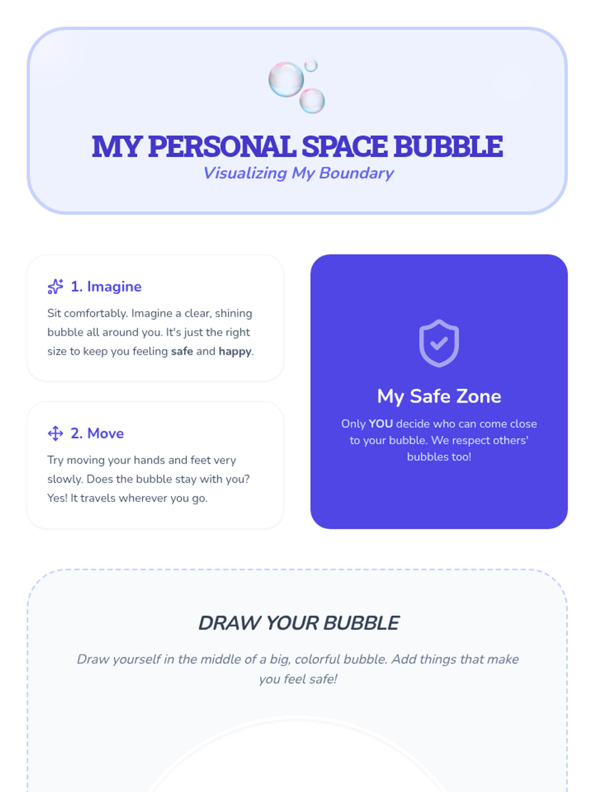 Explores the concept of a 'Personal Space Bubble' through discussion and visualization to help the student understand physical boundaries.