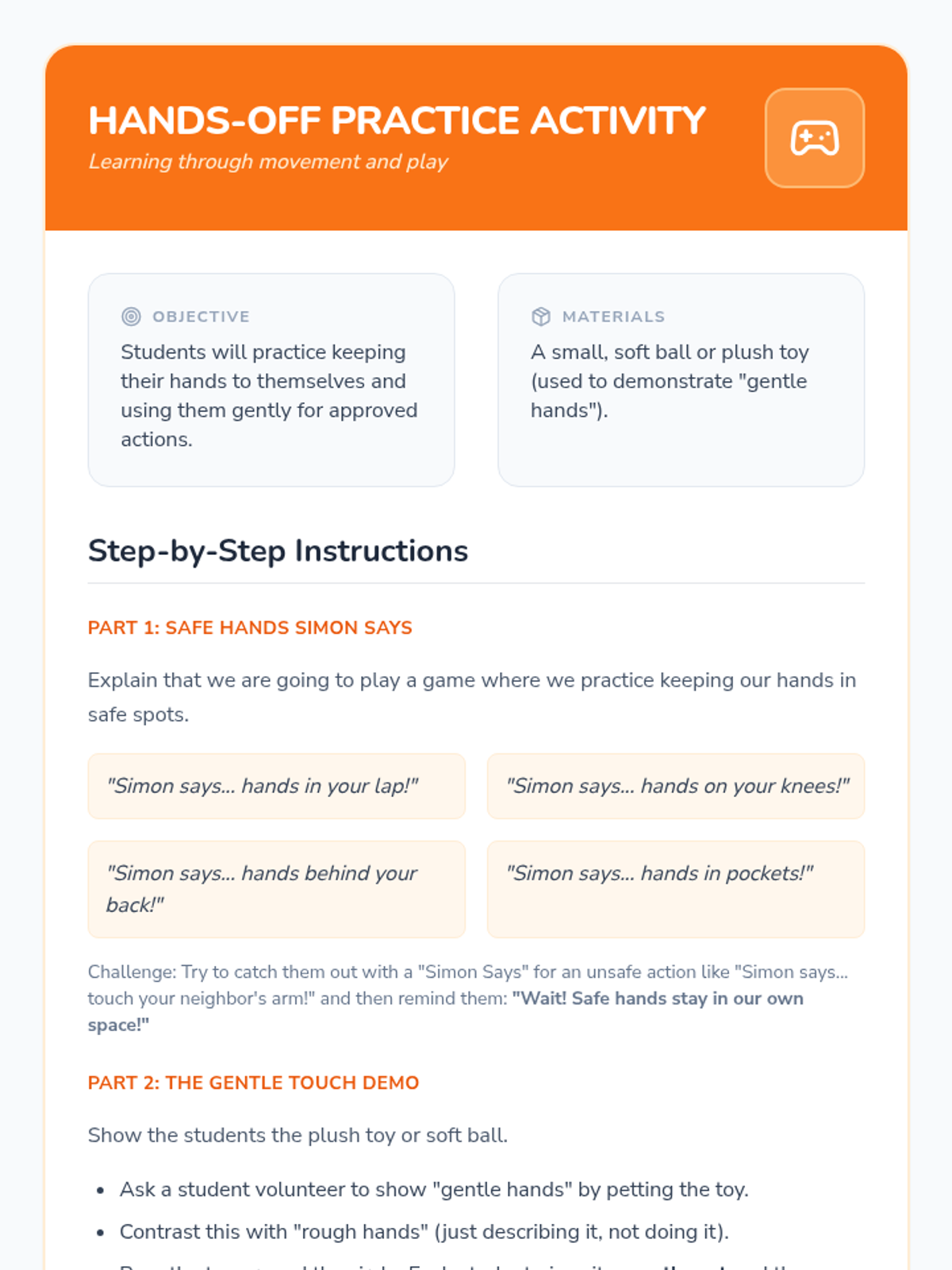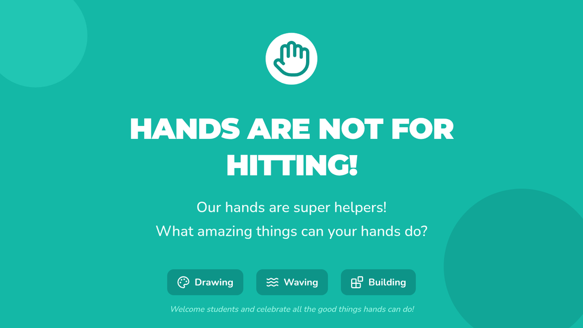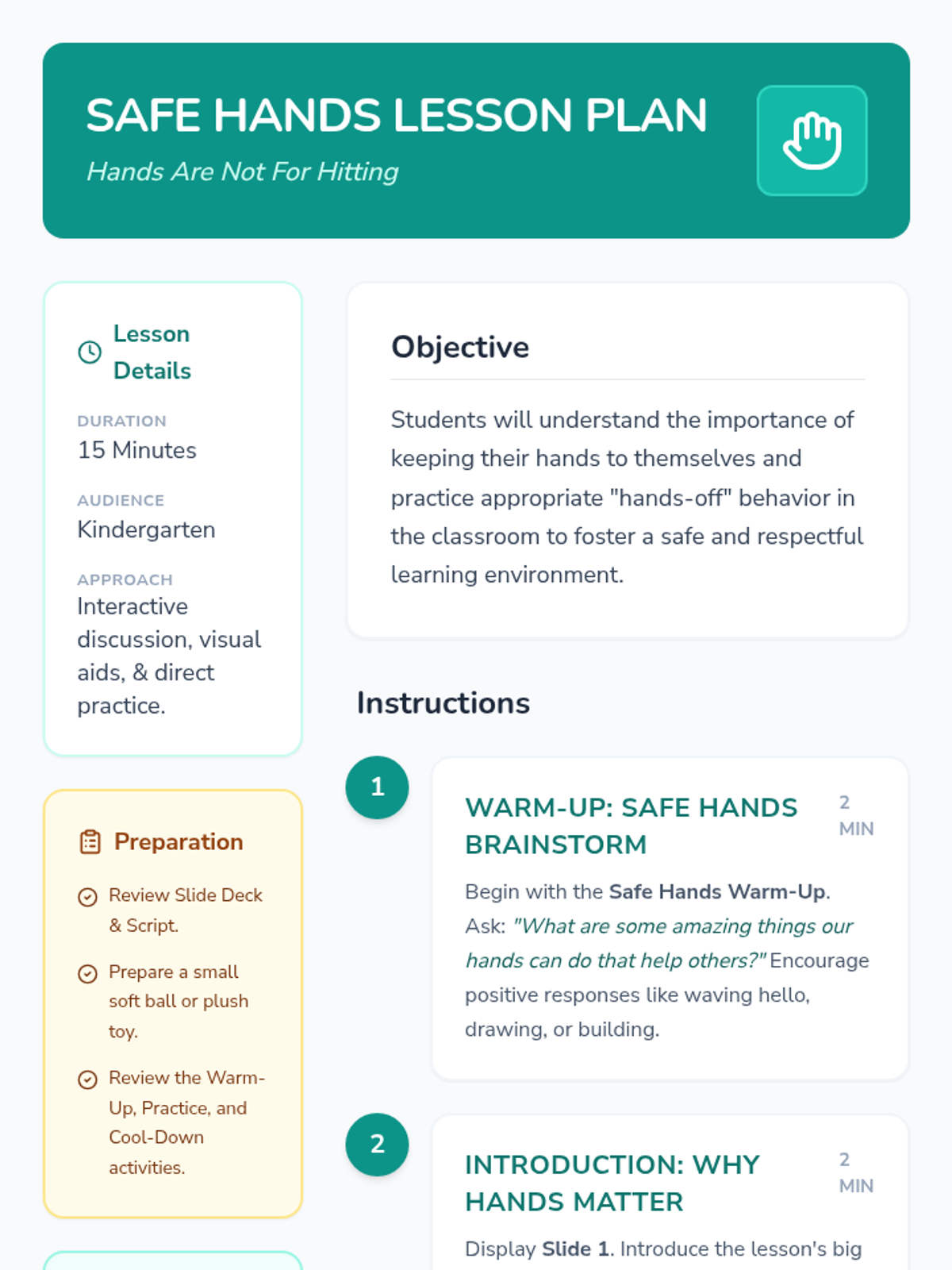 This lesson helps Kindergarten students understand the importance of keeping their hands to themselves to ensure a safe and happy classroom environment. It uses interactive discussions, practice, and a positive affirmation to build safe hand habits.
