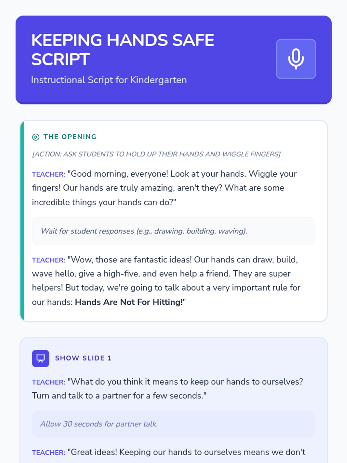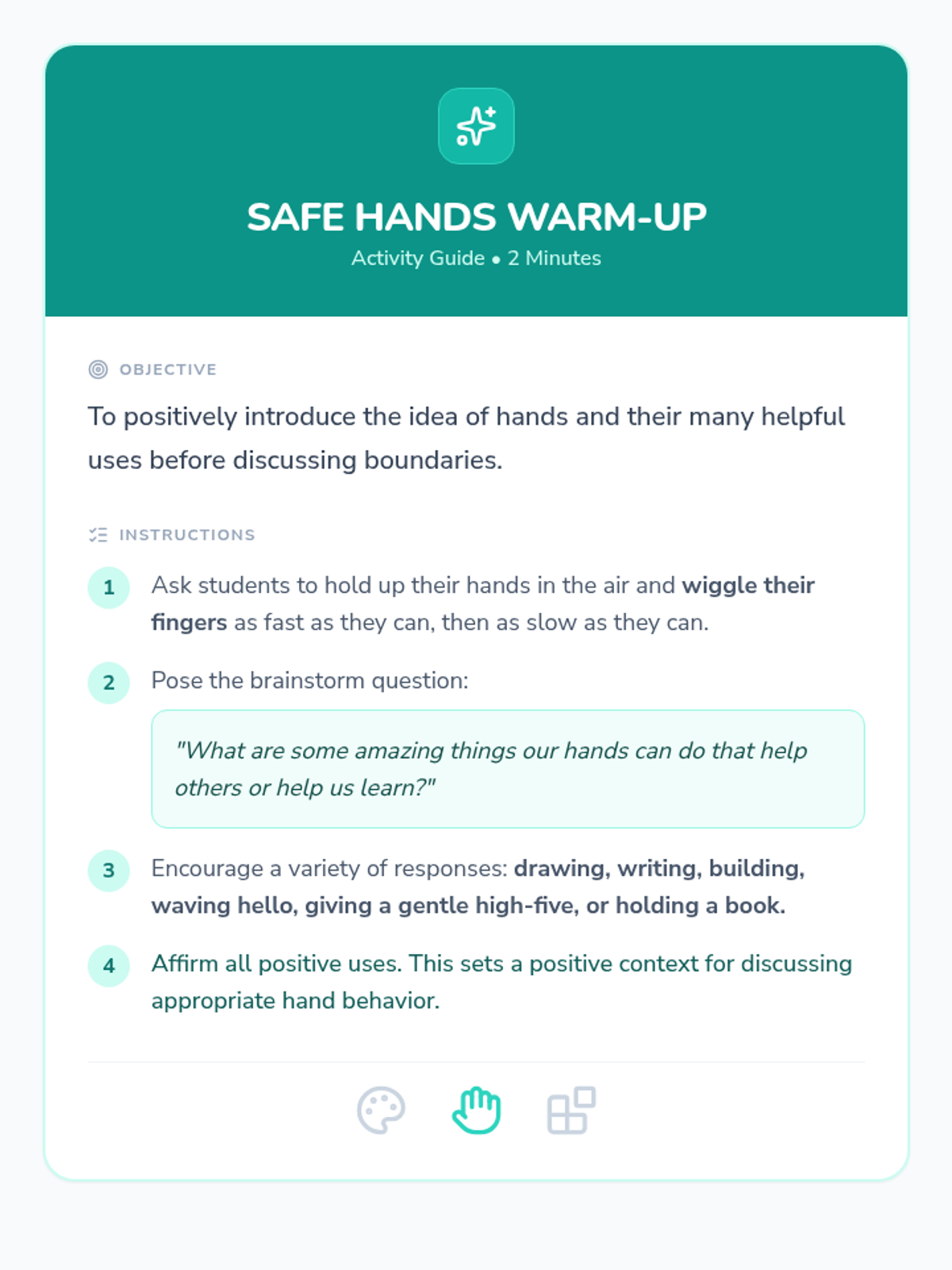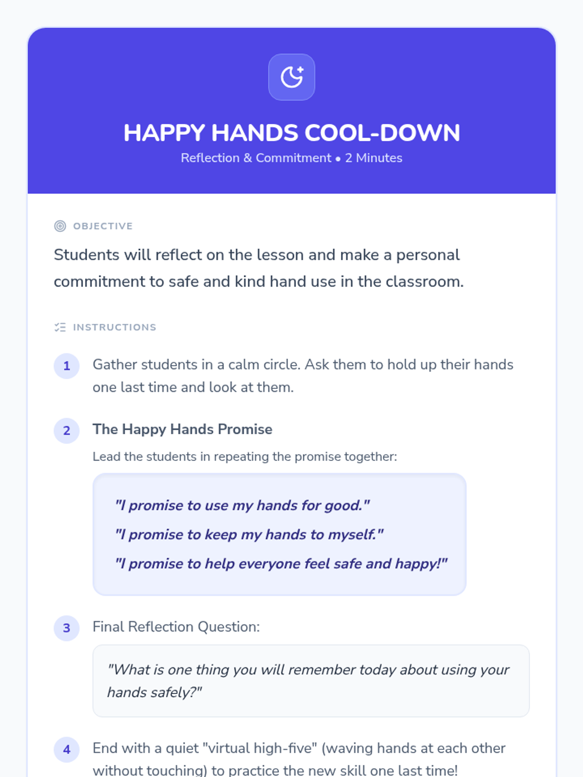 This lesson helps Kindergarten students understand the importance of keeping their hands to themselves to ensure a safe and happy classroom environment. It uses interactive discussions, practice, and a positive affirmation to build safe hand habits.