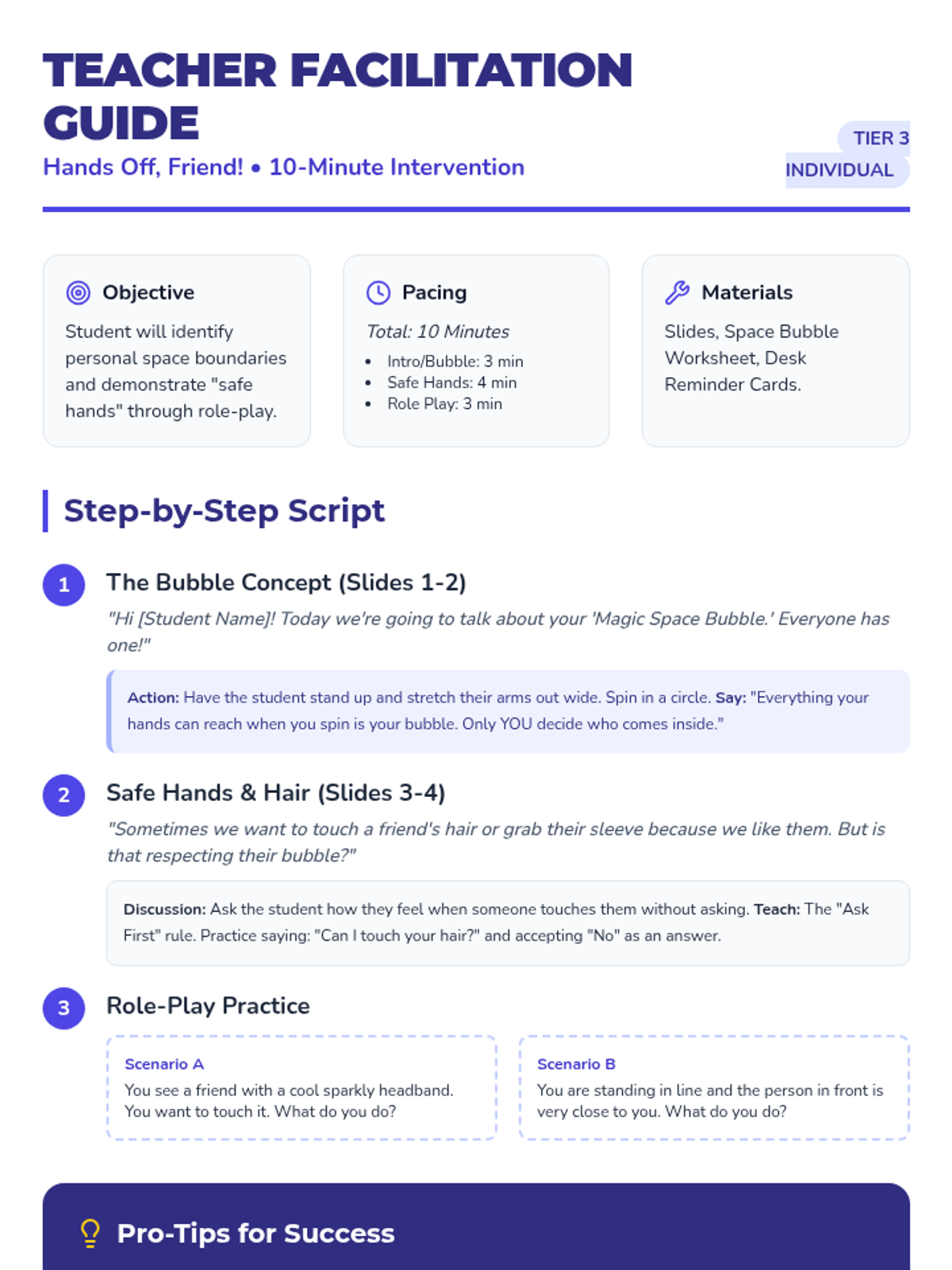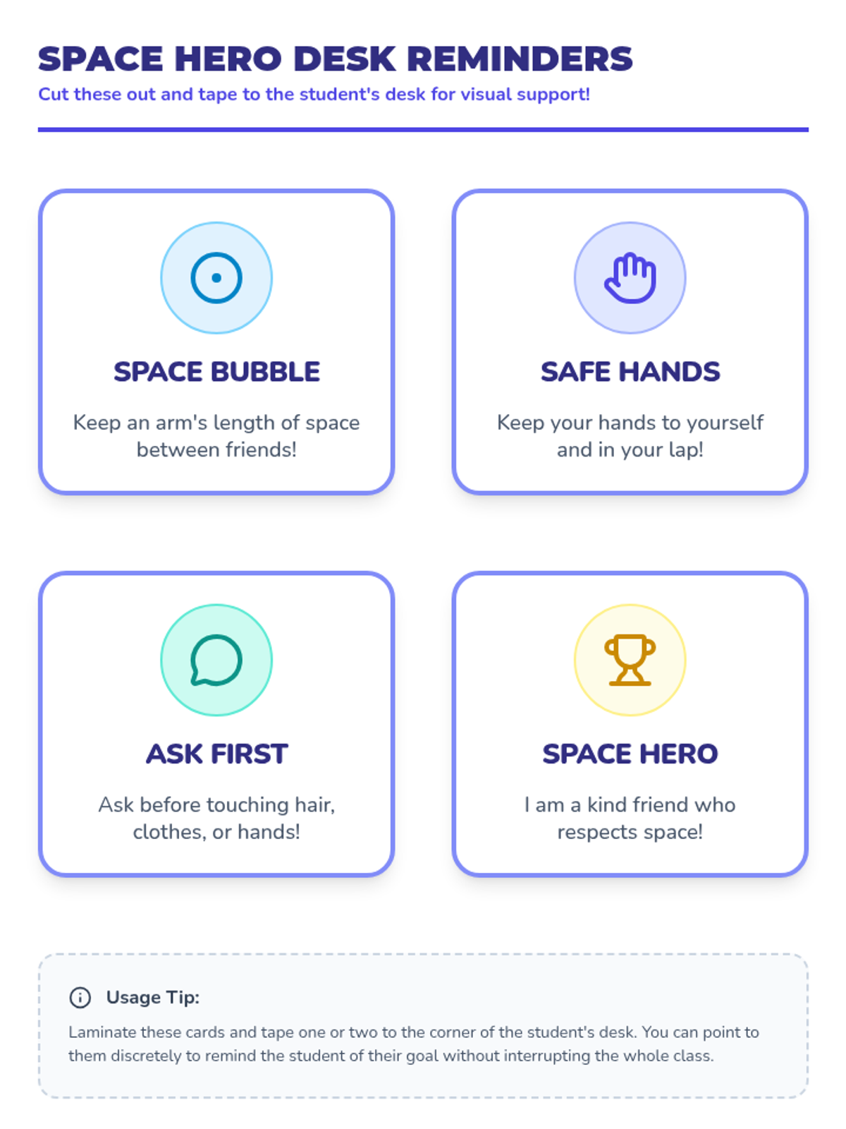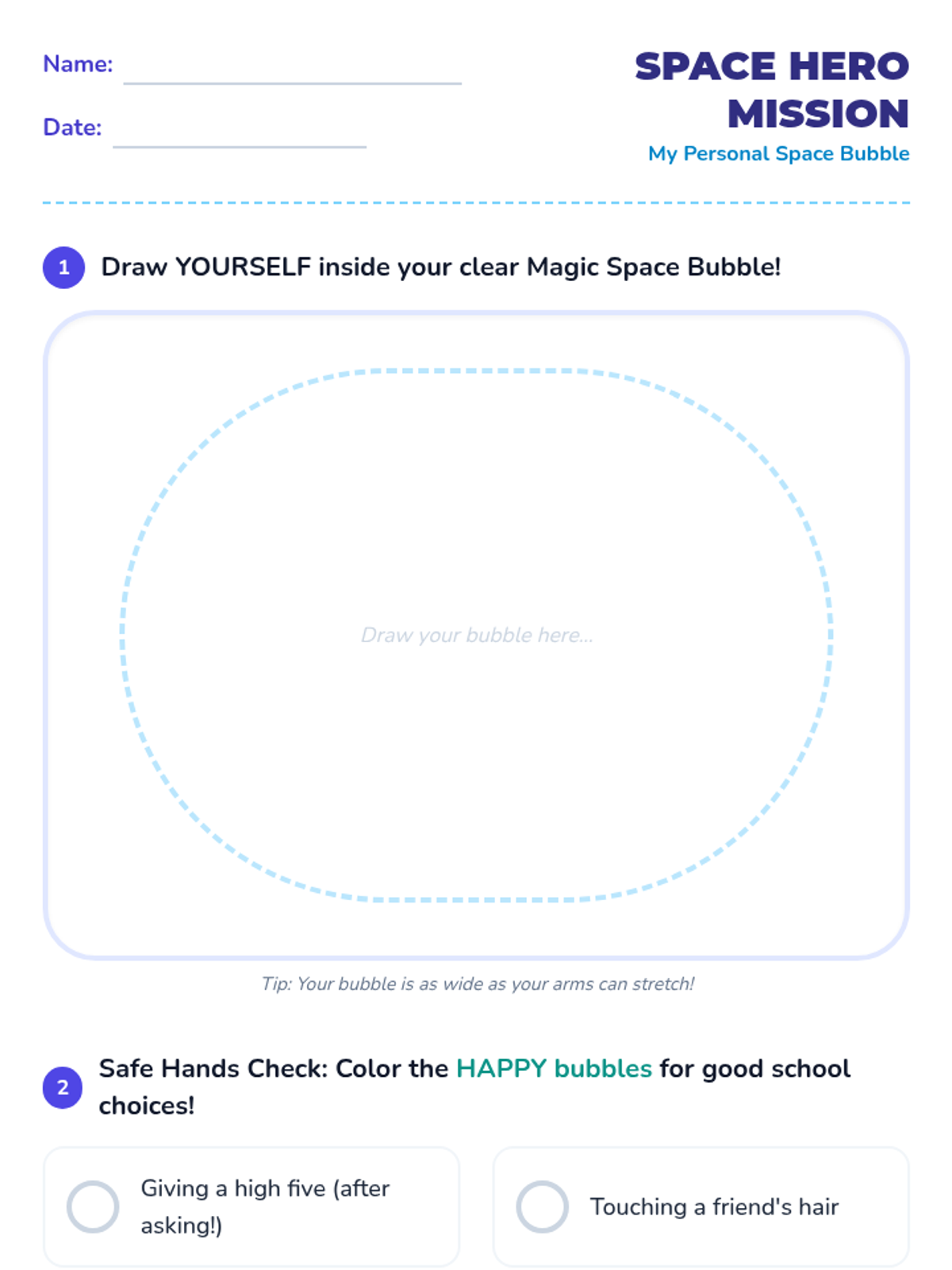 A 10-minute individual intervention for 2nd grade focusing on personal space, 'space bubbles', and safe hands to foster a respectful learning environment.