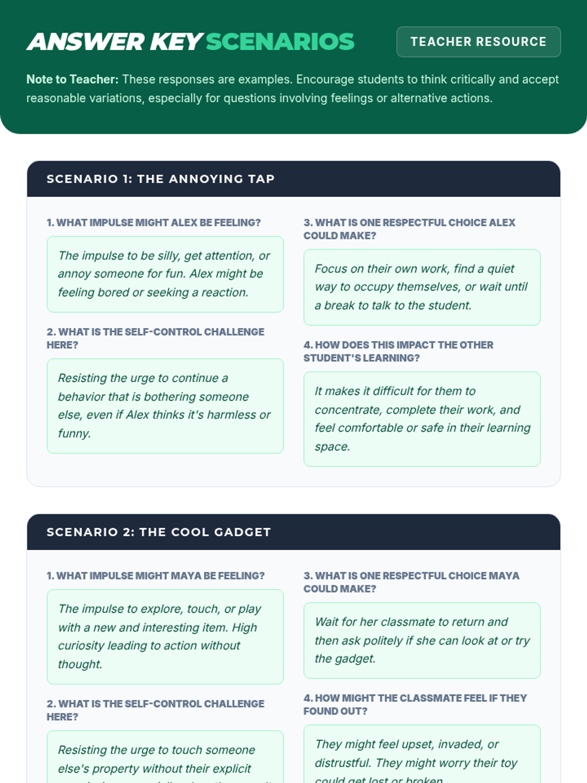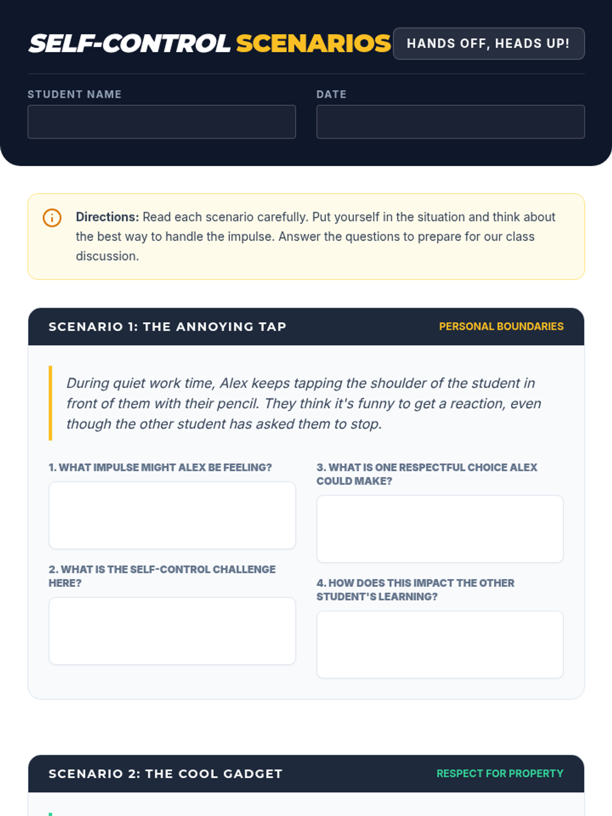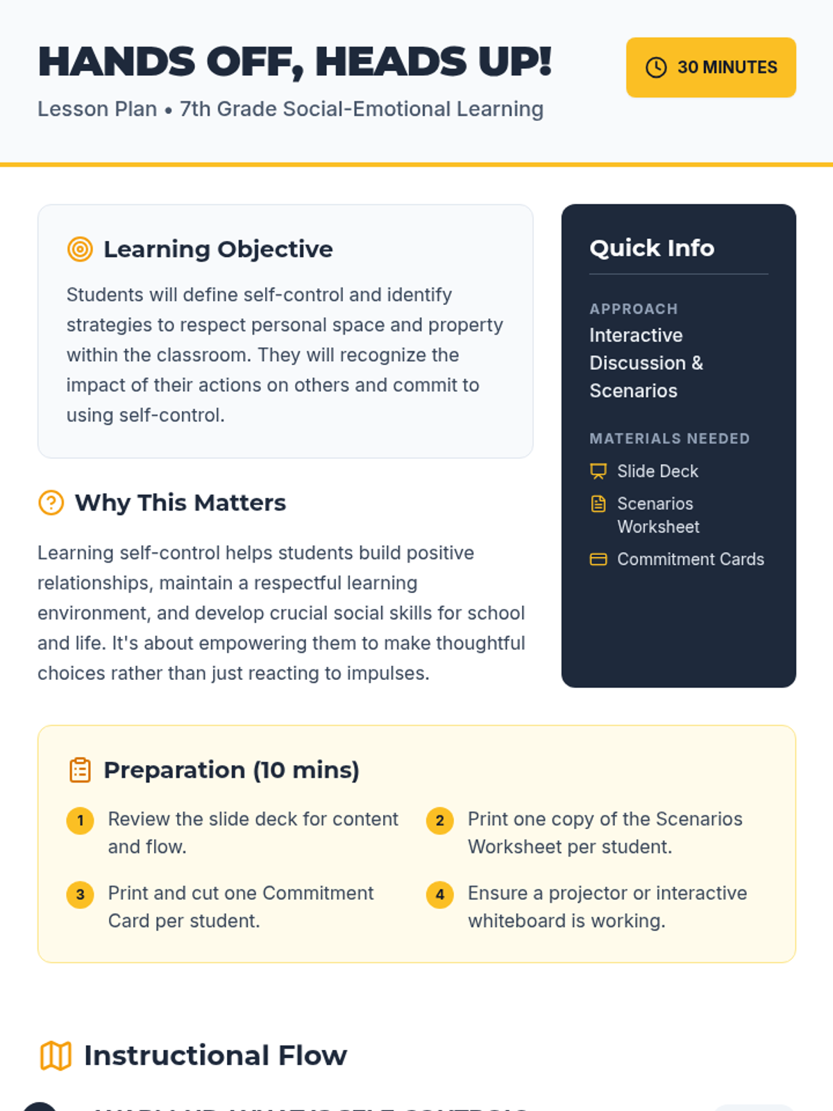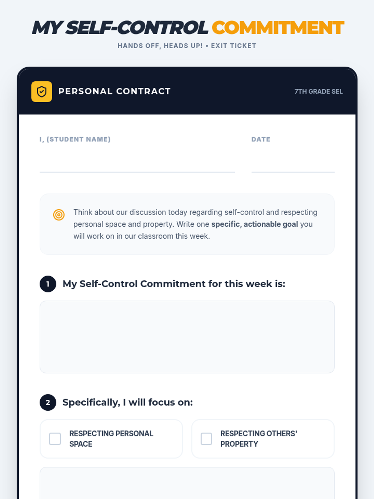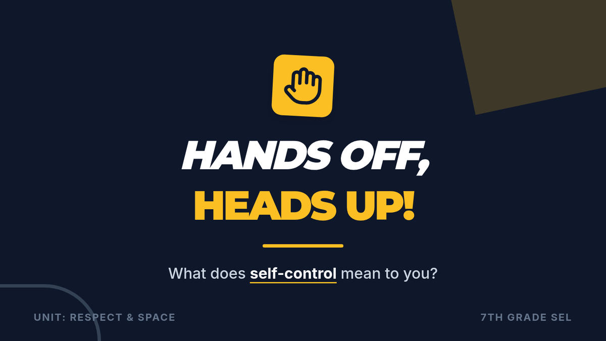 A 30-minute lesson for 7th graders focused on developing self-control and respecting personal space and property within the classroom.