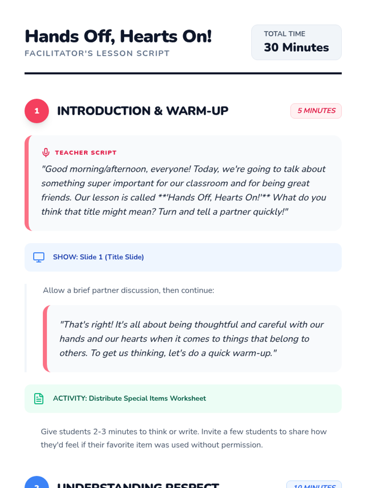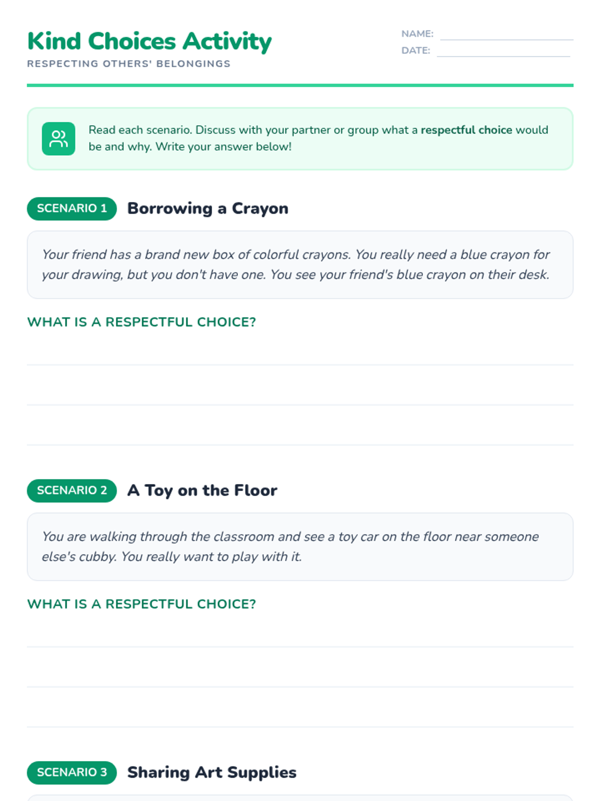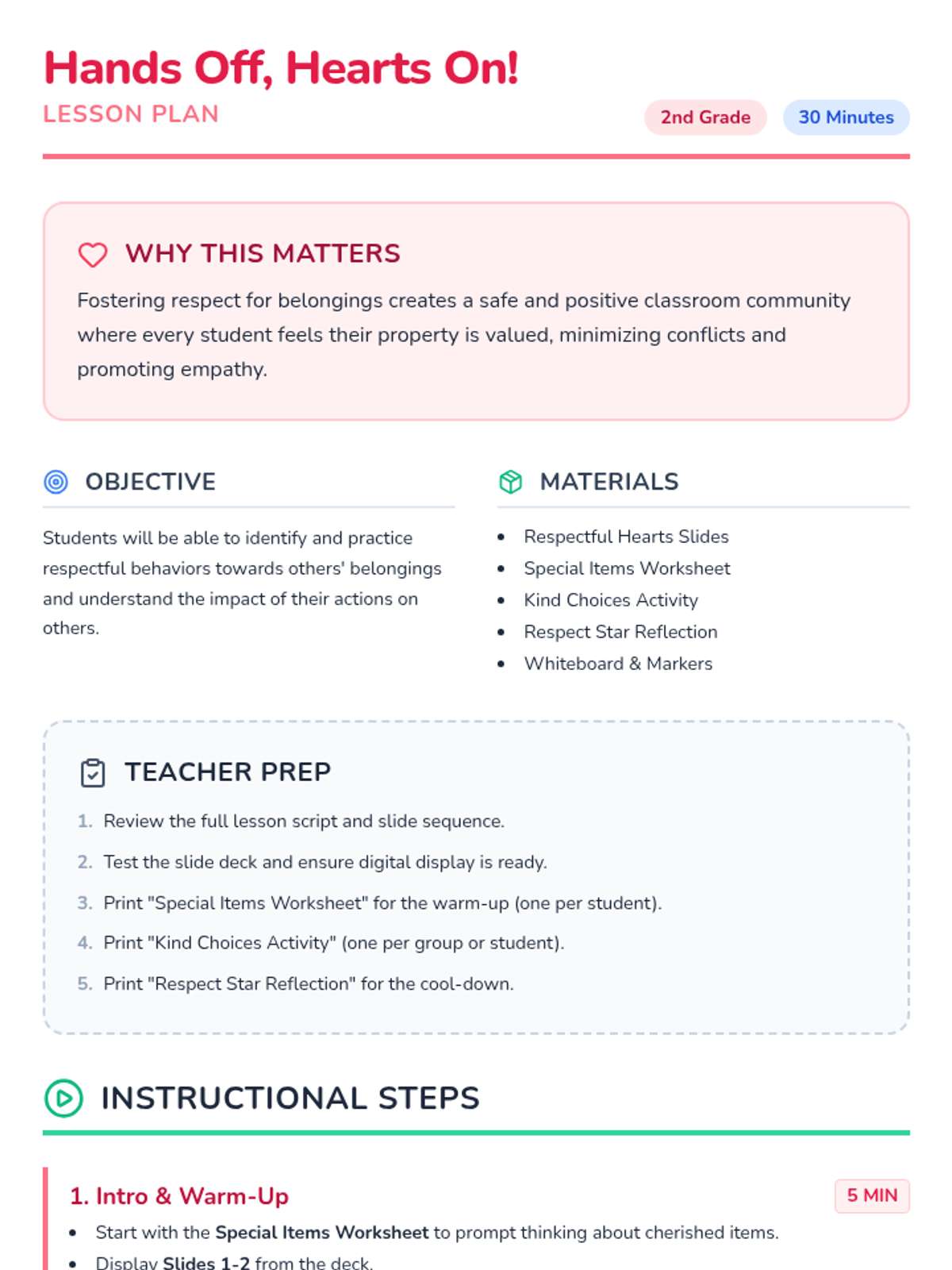 A 30-minute lesson for 2nd graders on respecting others' belongings, fostering empathy, and building a positive classroom community.
