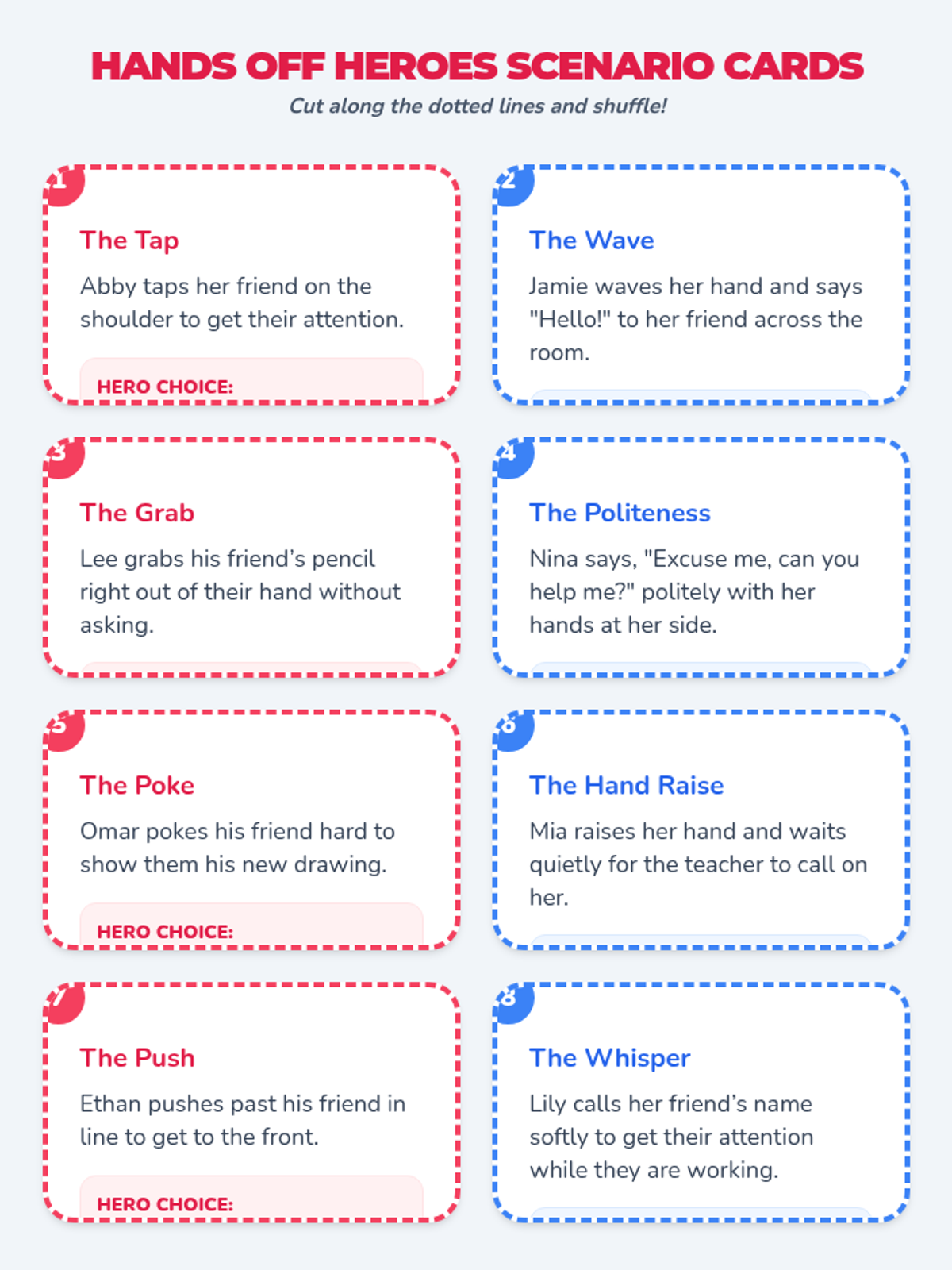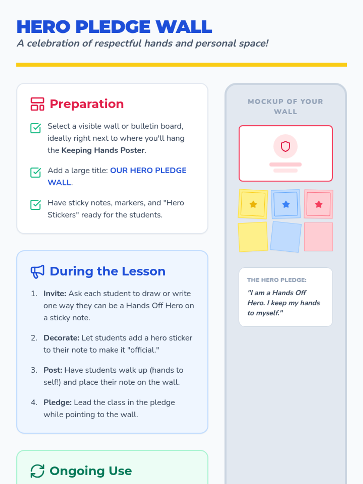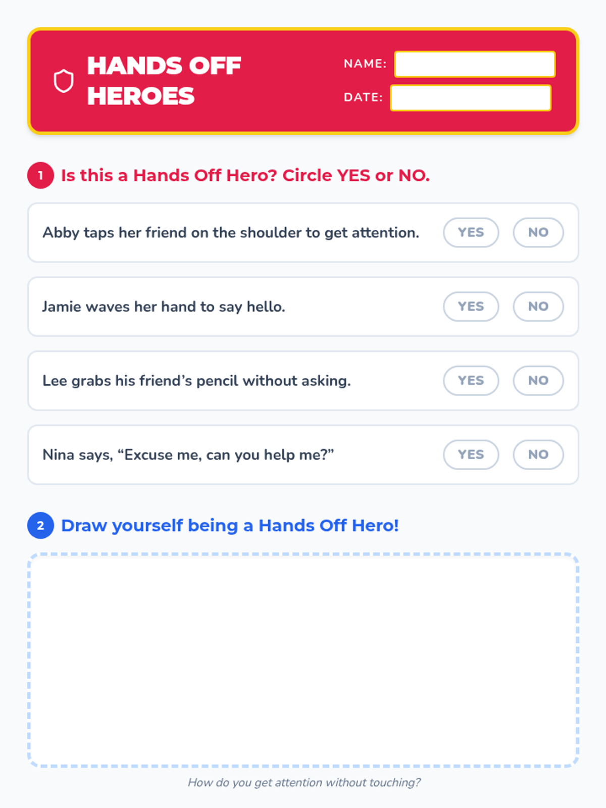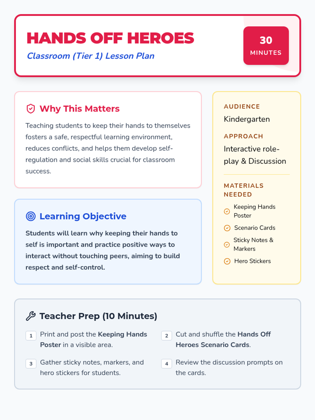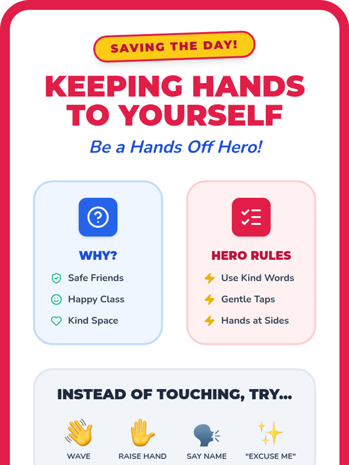 A 30-minute kindergarten lesson that teaches students why and how to keep their hands to themselves using interactive role-play, hero scenarios, and a classroom pledge.