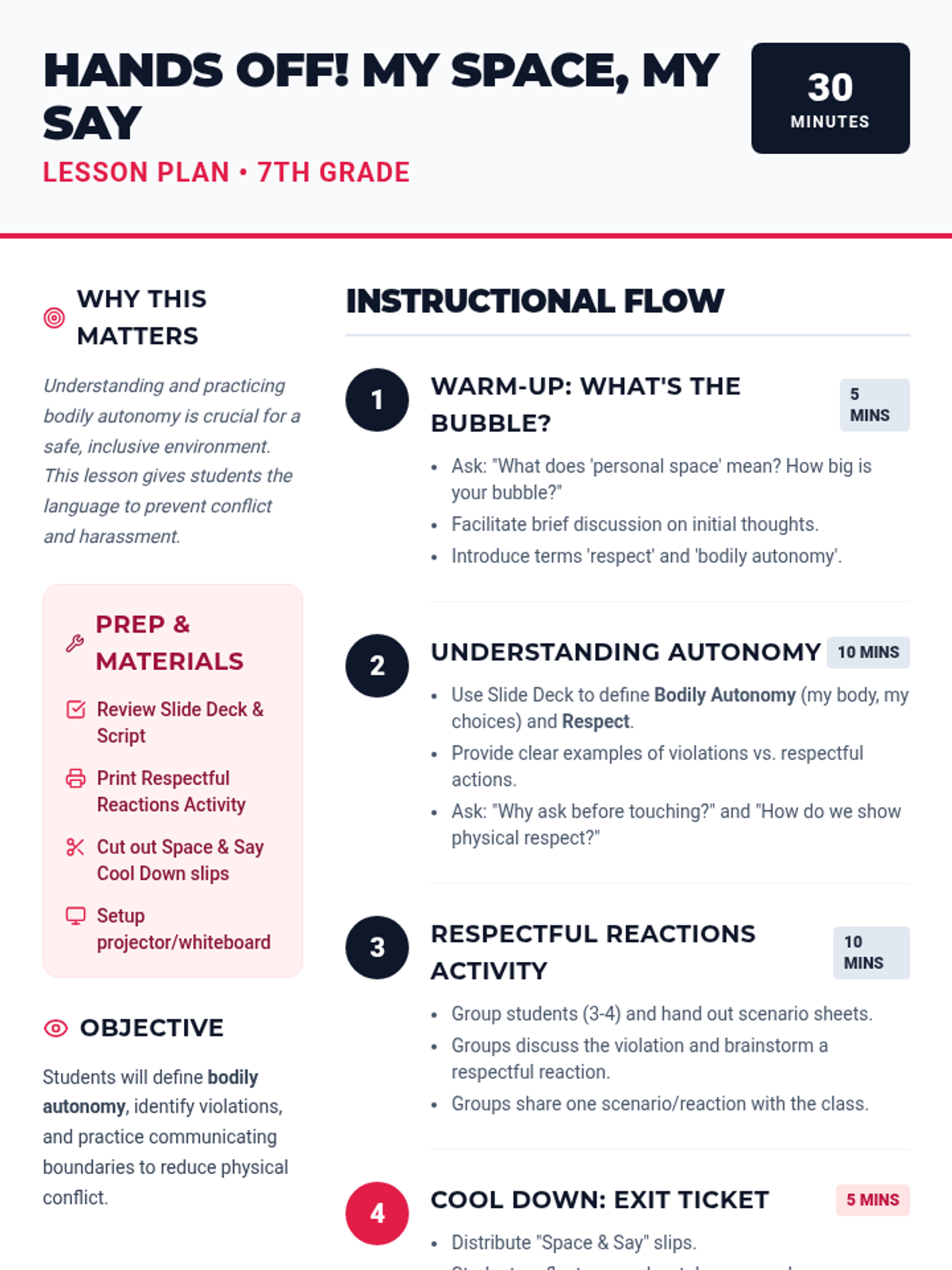 This 30-minute lesson for 7th-grade boys teaches bodily autonomy and respect to foster a safer classroom environment and reduce physical conflict. Students define personal boundaries, analyze real-world scenarios, and practice communicating their needs effectively.