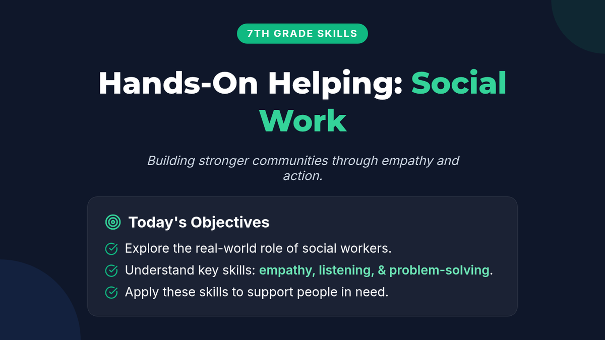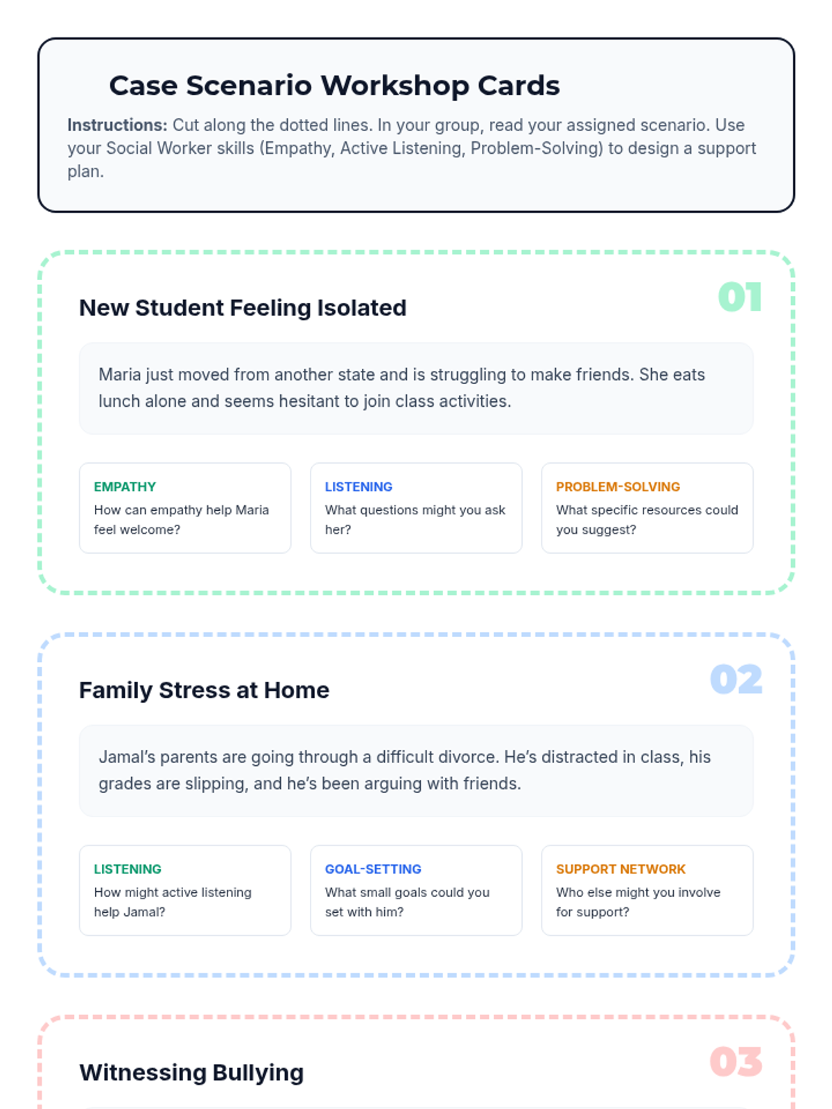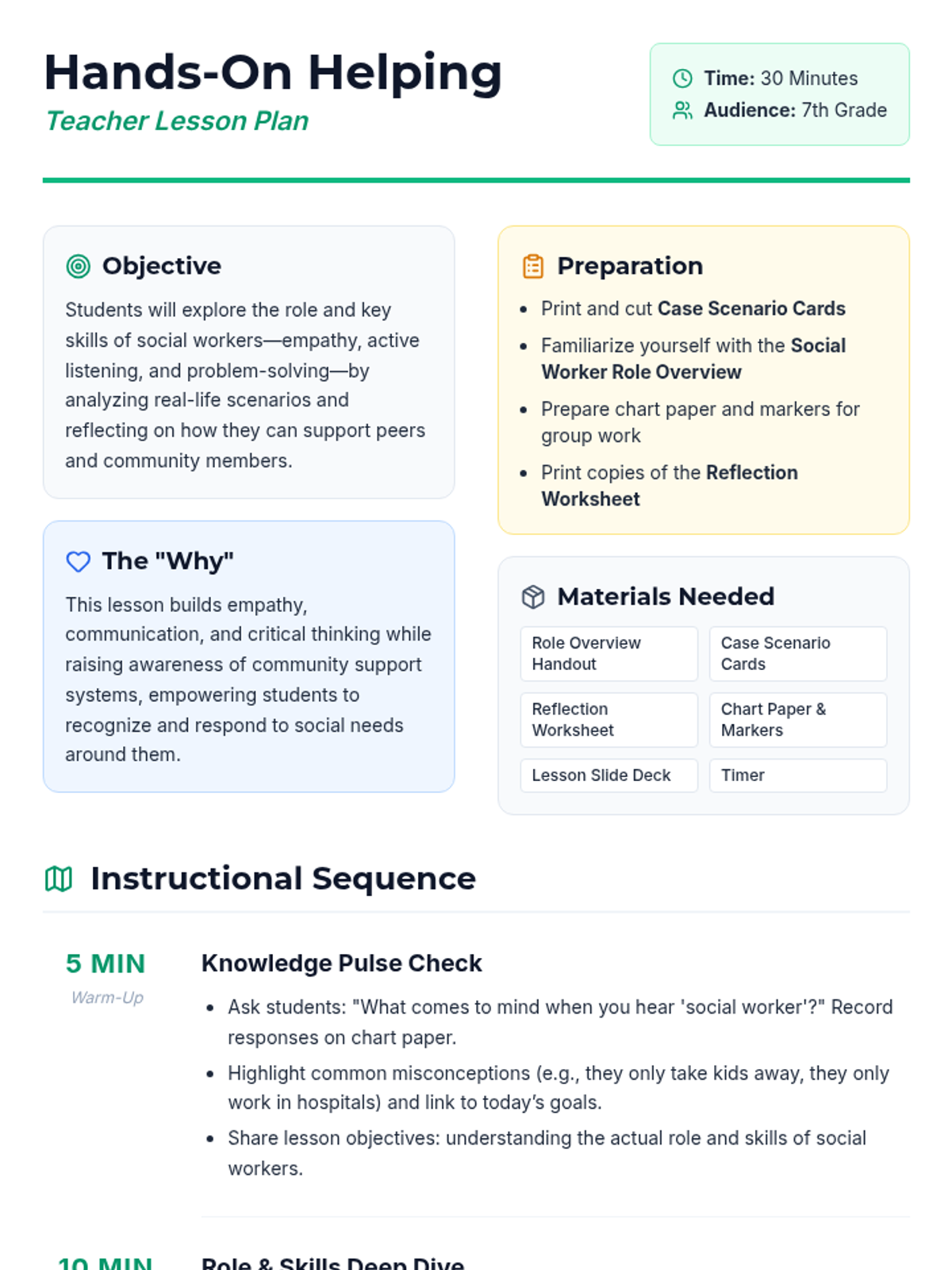 A 30-minute 7th-grade lesson where students explore social work roles and practice empathy, active listening, and problem-solving through real-world scenarios.