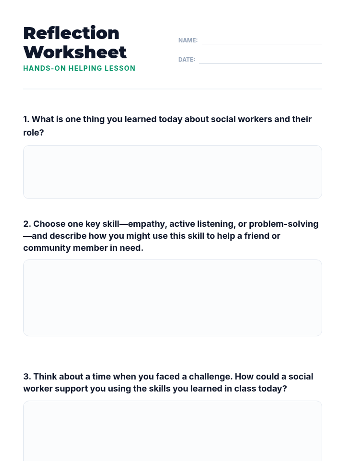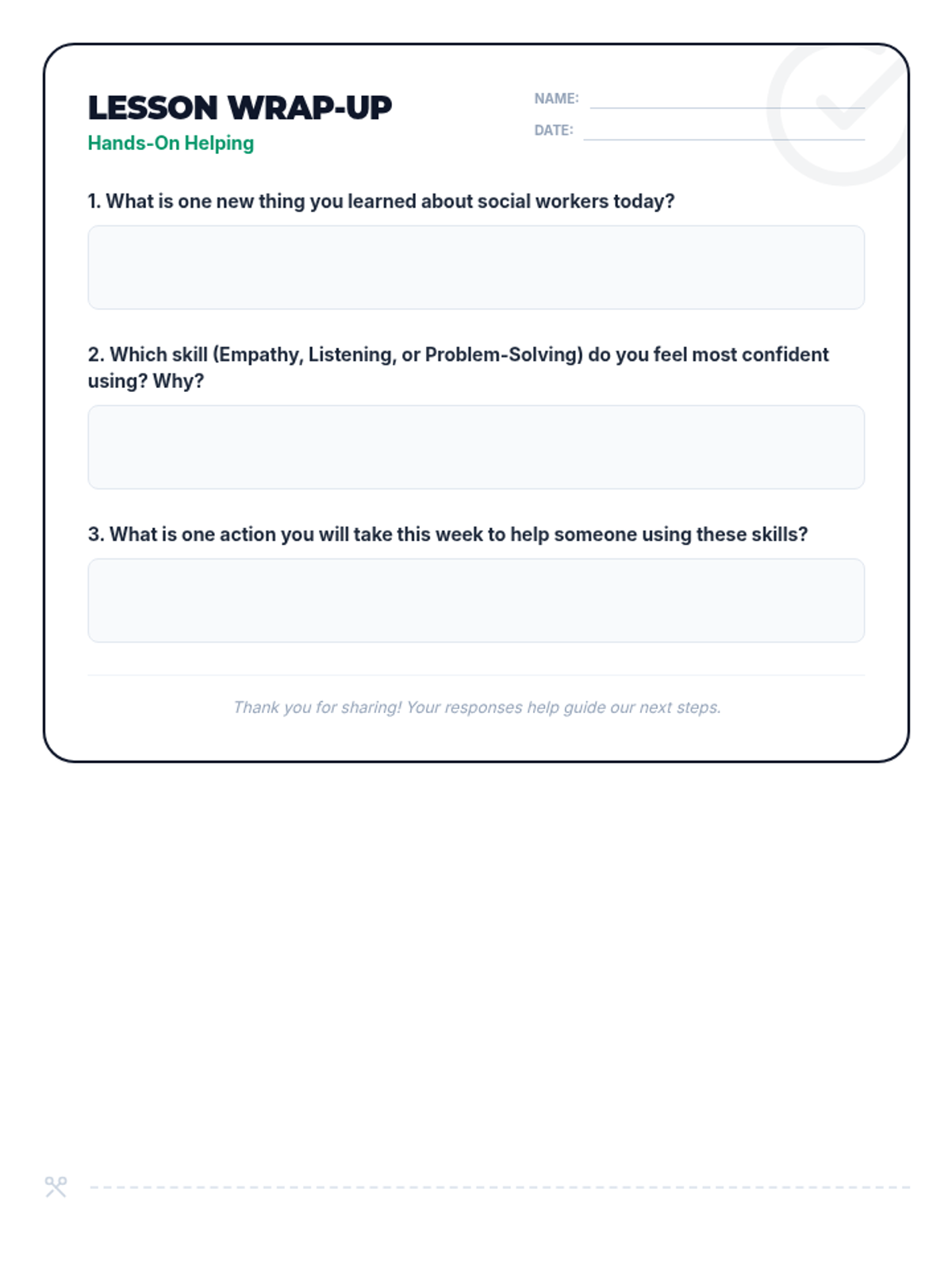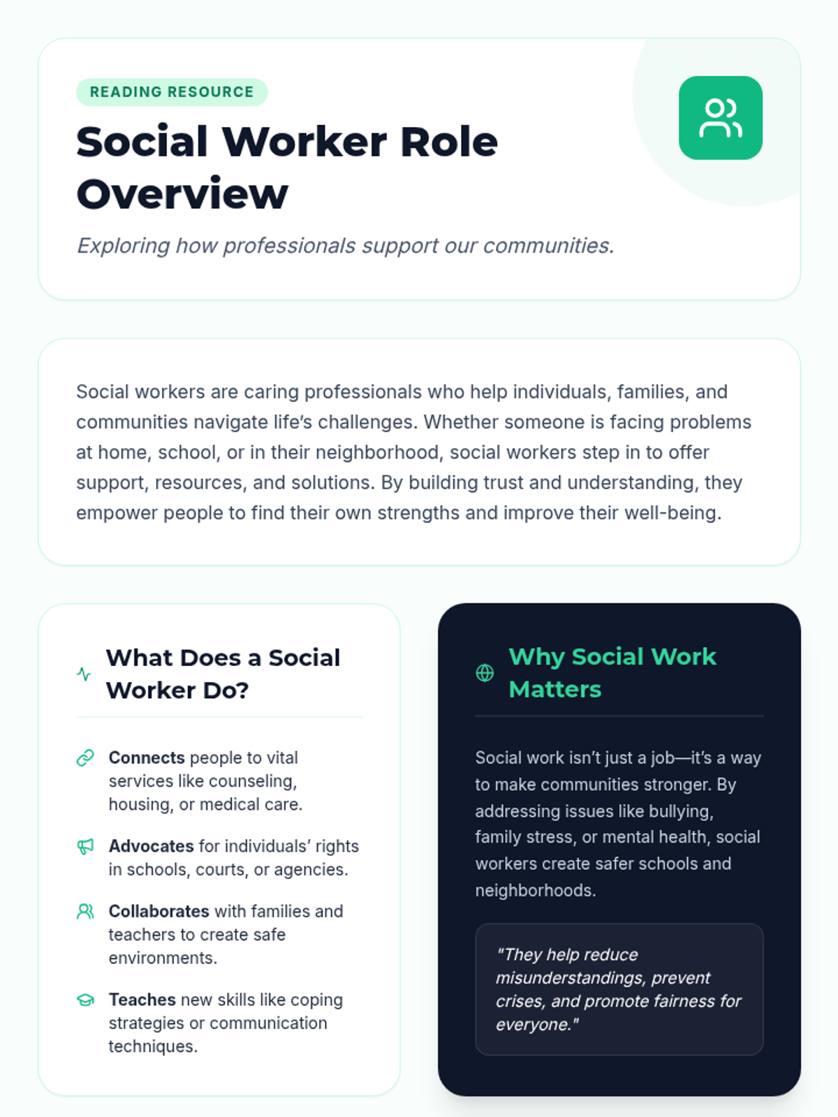 A 30-minute 7th-grade lesson where students explore social work roles and practice empathy, active listening, and problem-solving through real-world scenarios.