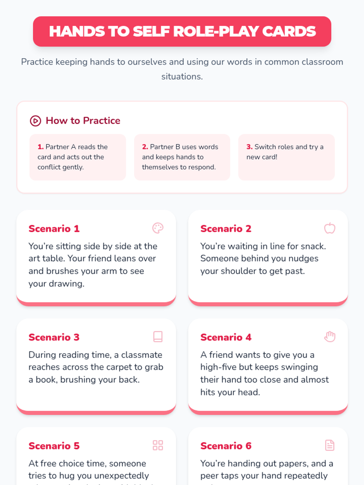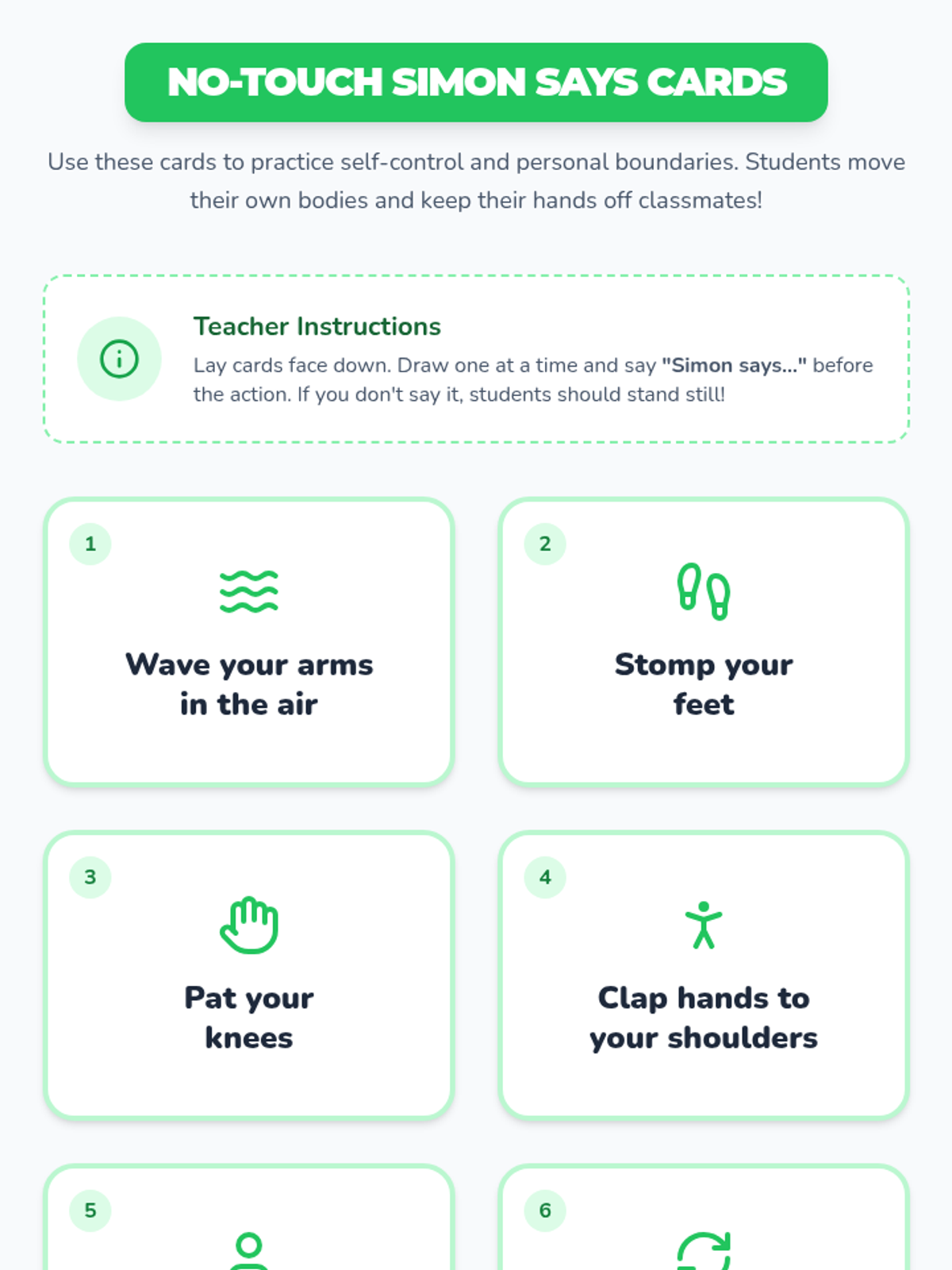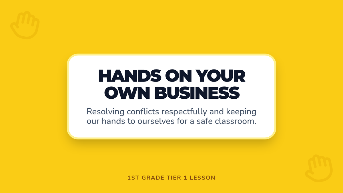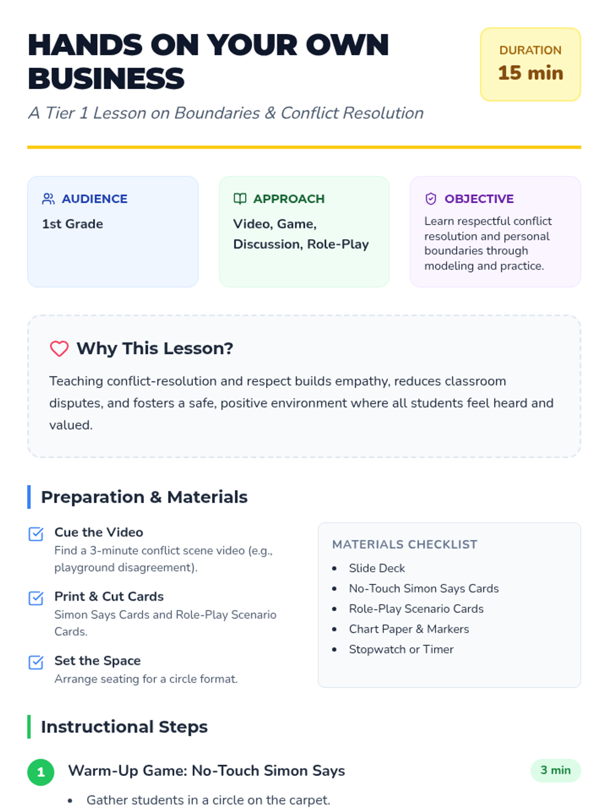A 15-minute Tier 1 lesson for 1st graders focused on personal boundaries, conflict resolution, and self-control through interactive games and role-play.