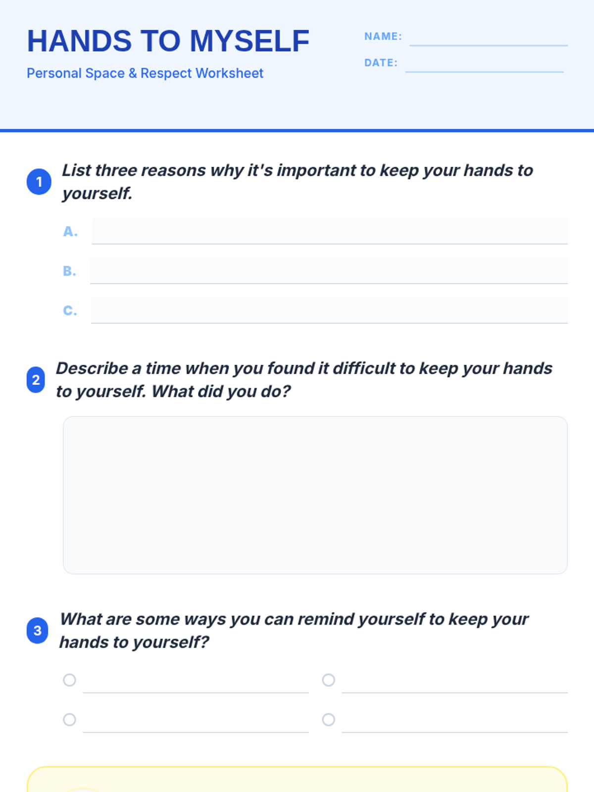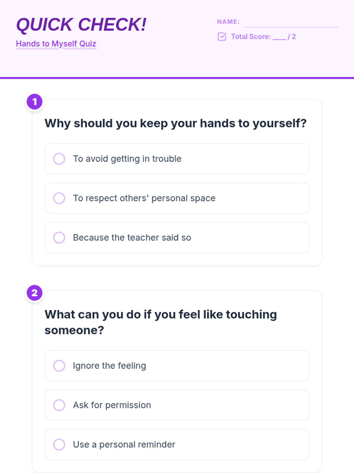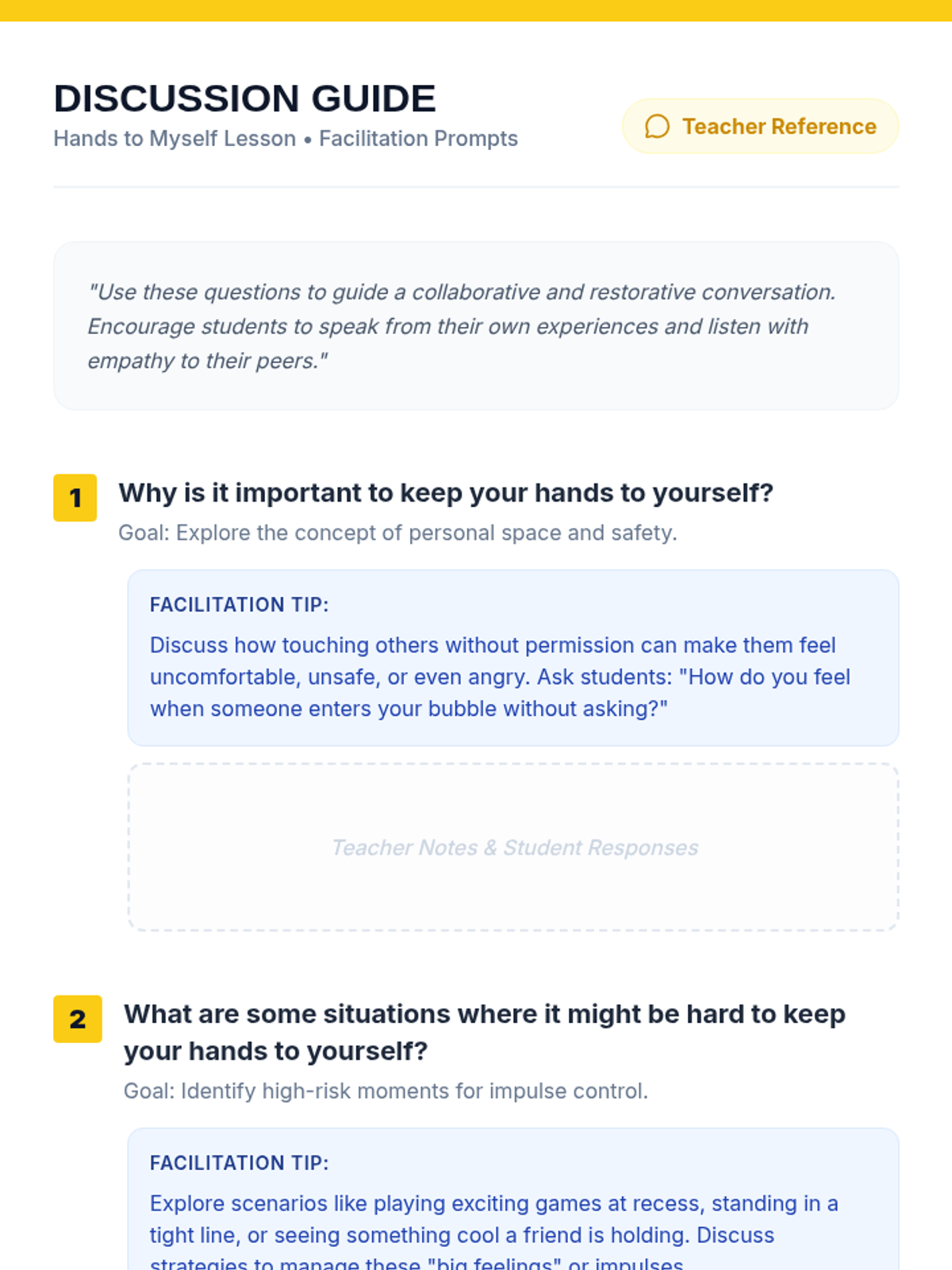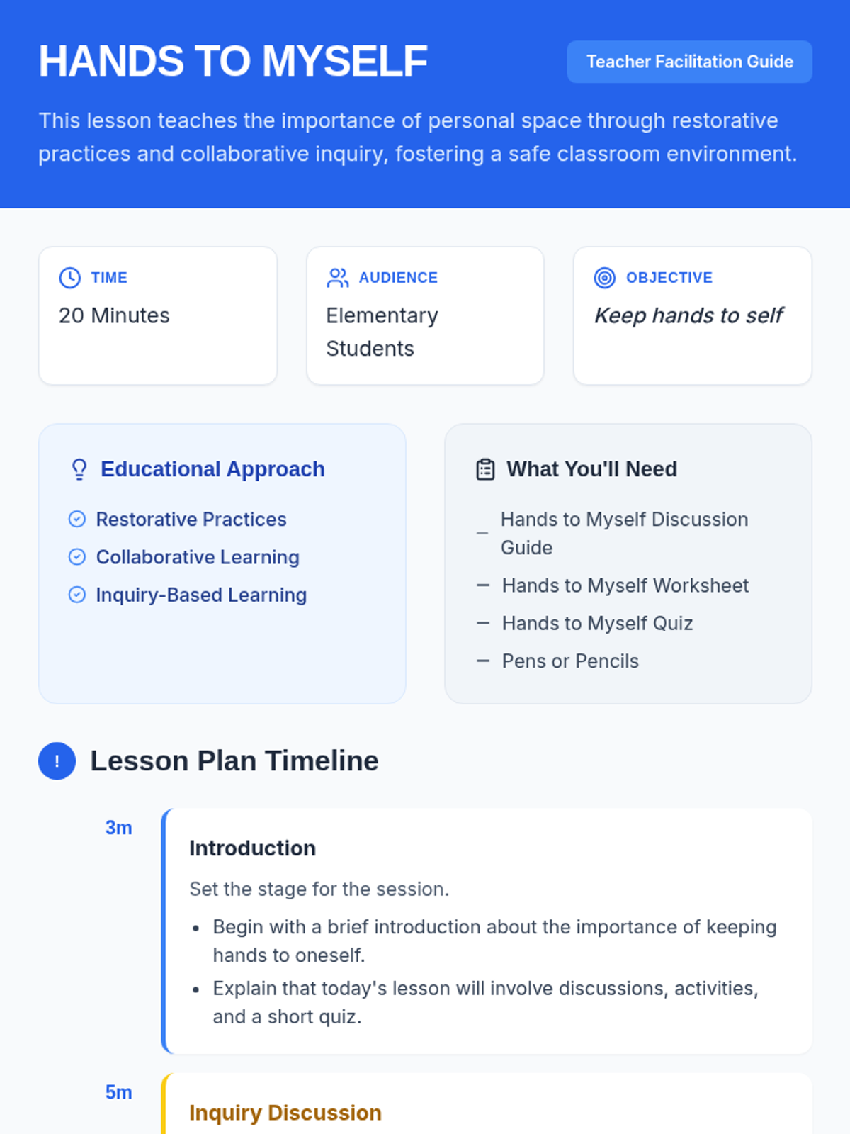 A 20-minute elementary lesson focused on the importance of personal space and the 'hands to myself' rule using restorative and collaborative approaches.