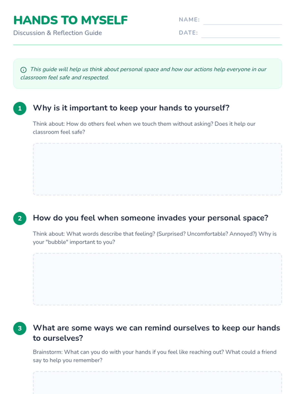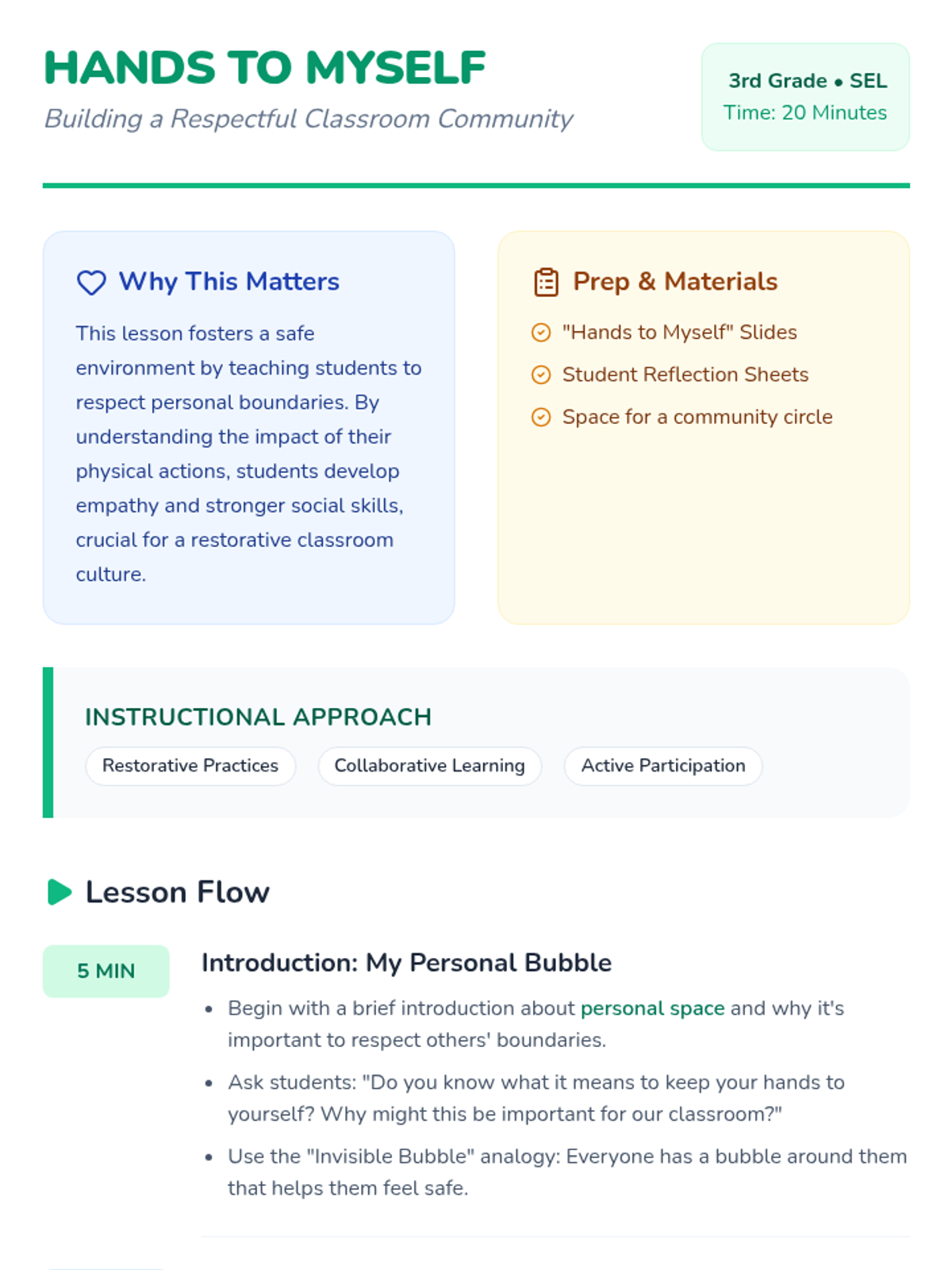 A restorative practice lesson for 3rd graders on respecting personal boundaries and keeping hands to oneself through collaborative discussion.