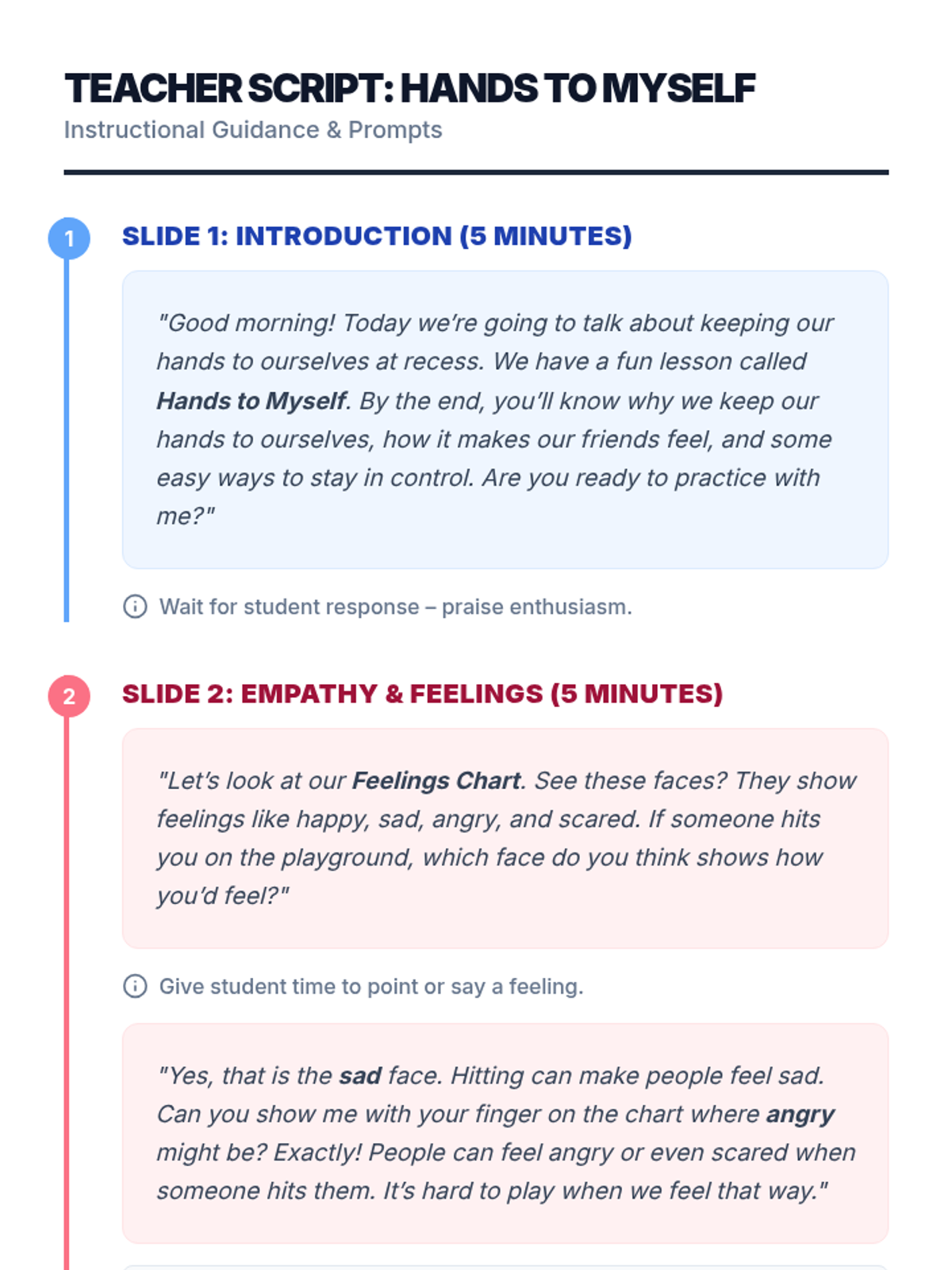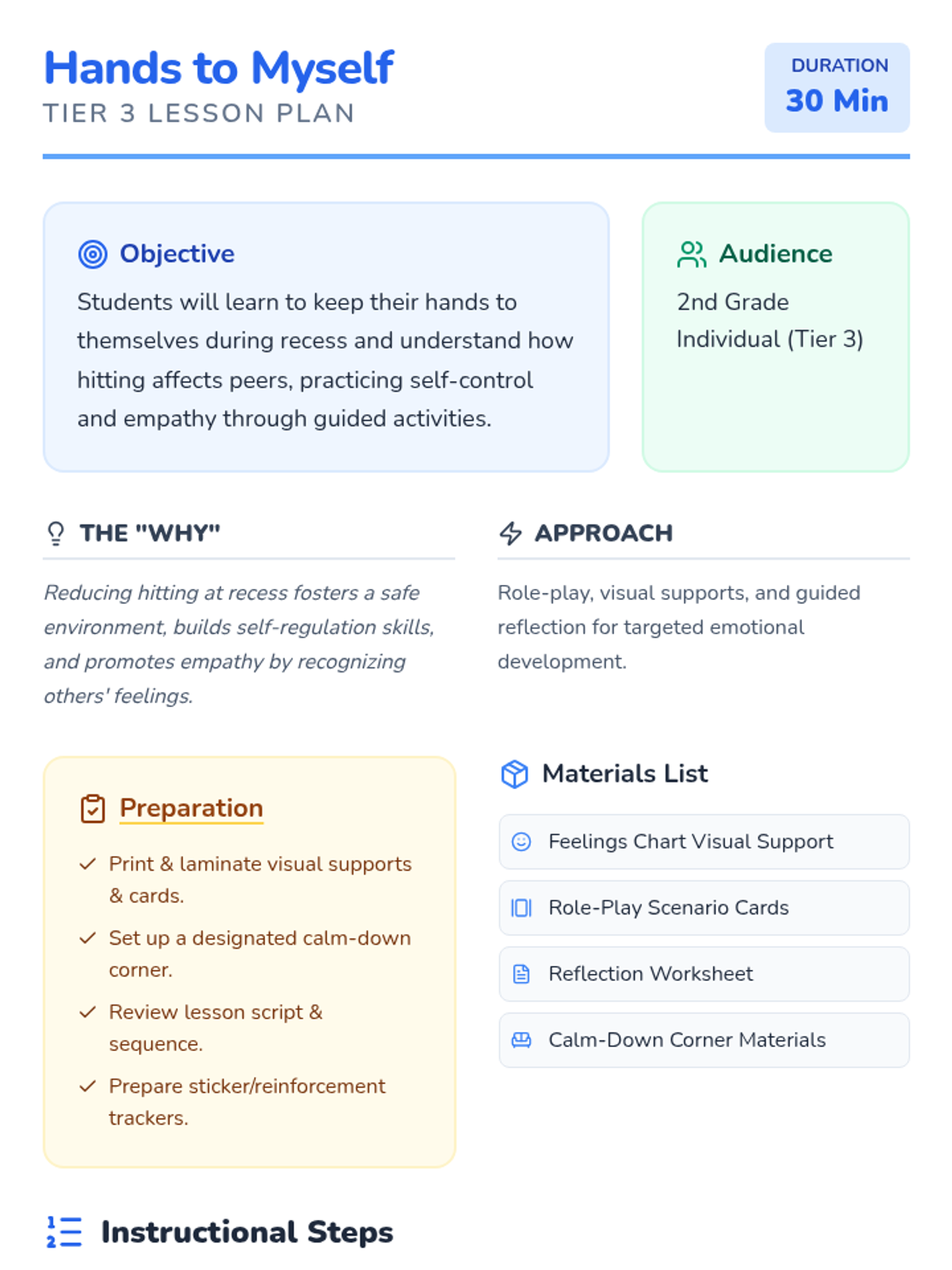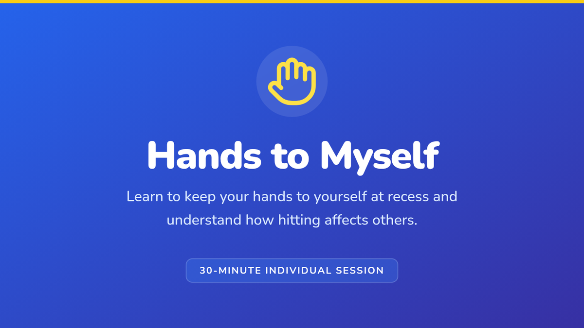 An individual 30-minute Tier 3 session for a 2nd grader focused on keeping hands to themselves during recess and understanding how hitting affects others. This targeted lesson uses role-play, reflection, and visual supports to build self-control and empathy.