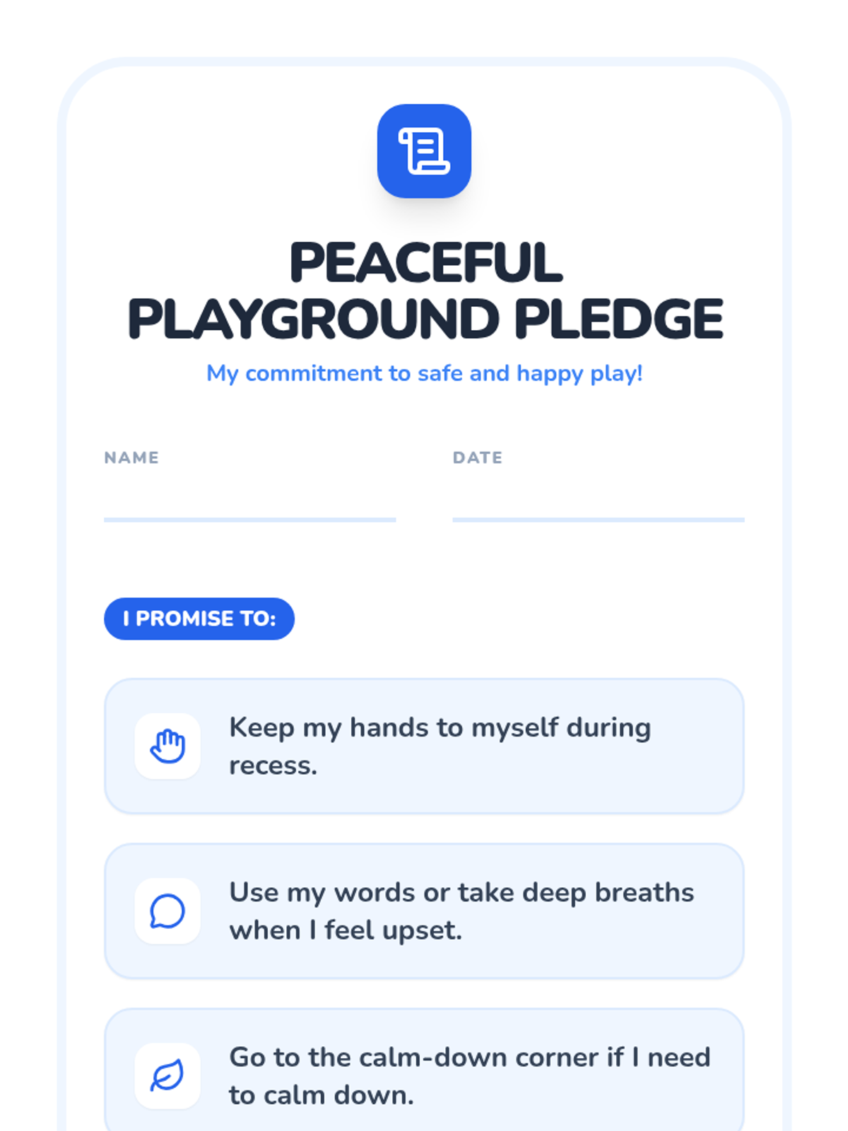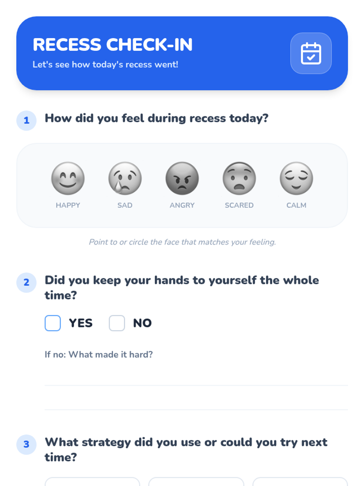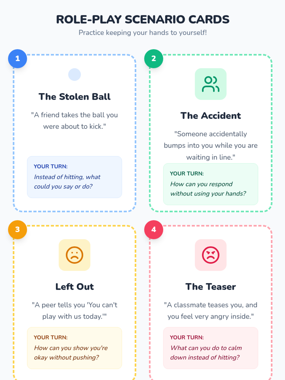 An individual 30-minute Tier 3 session for a 2nd grader focused on keeping hands to themselves during recess and understanding how hitting affects others. This targeted lesson uses role-play, reflection, and visual supports to build self-control and empathy.