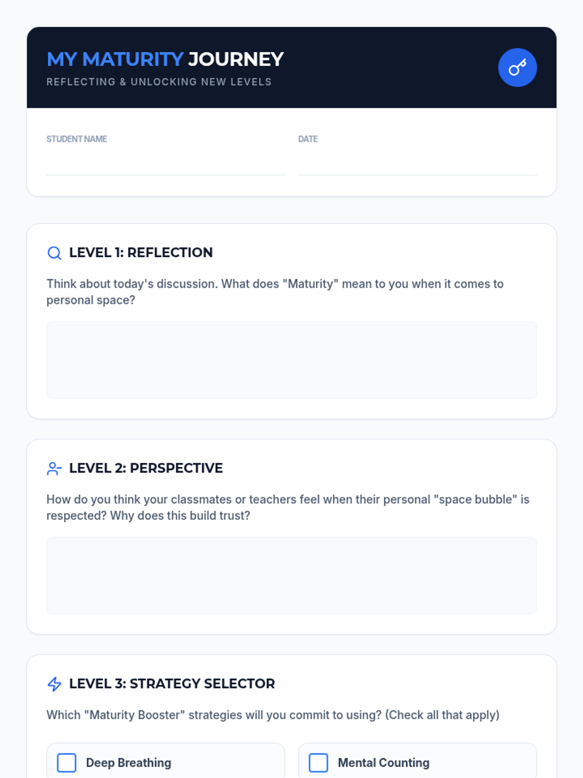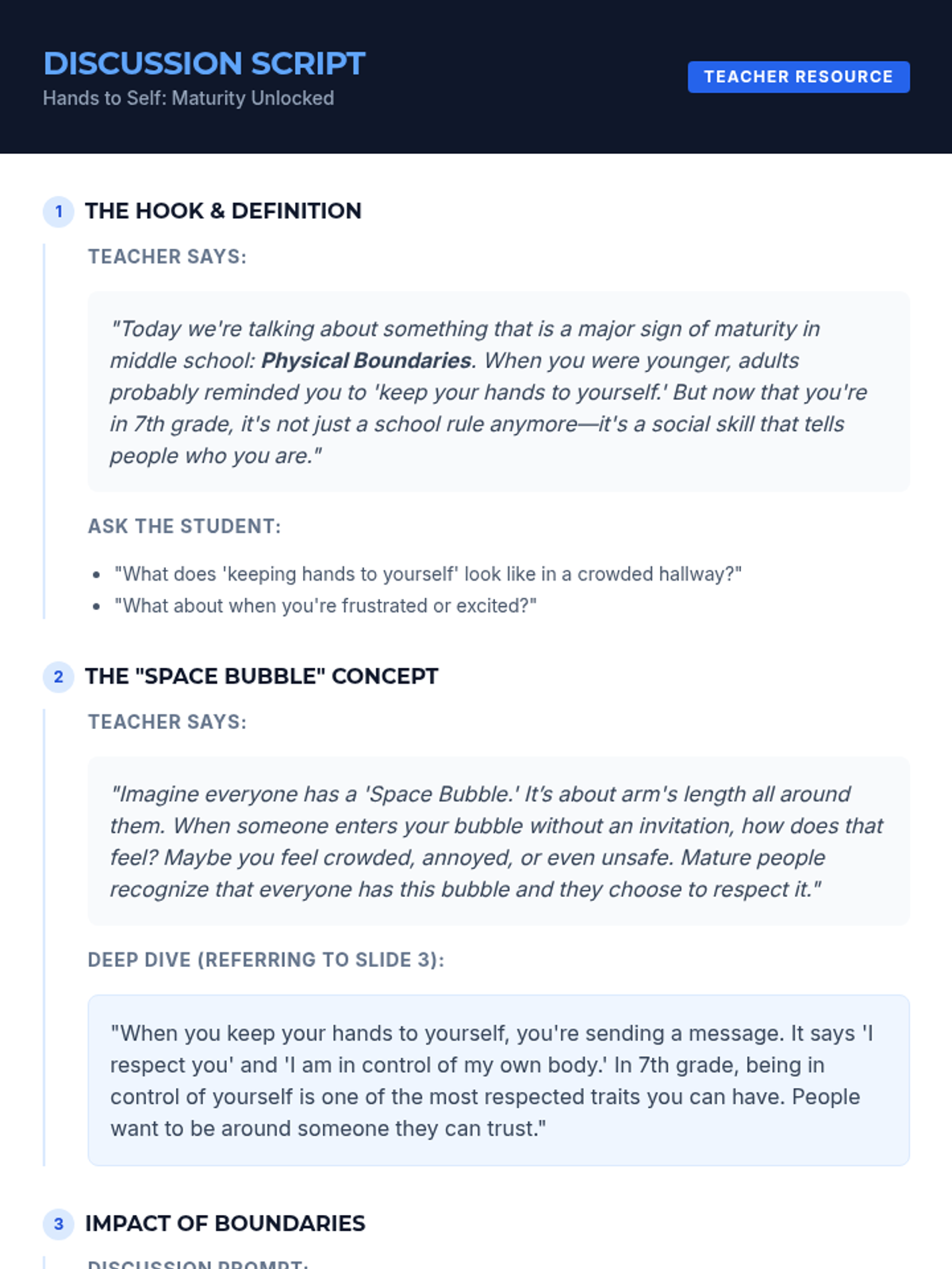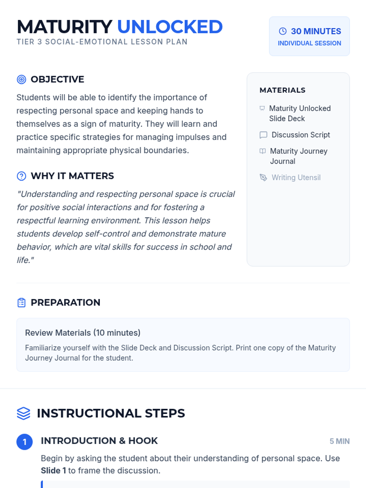A 30-minute Tier 3 intervention for 7th-grade students focused on personal space, impulse control, and demonstrating maturity through physical boundaries.