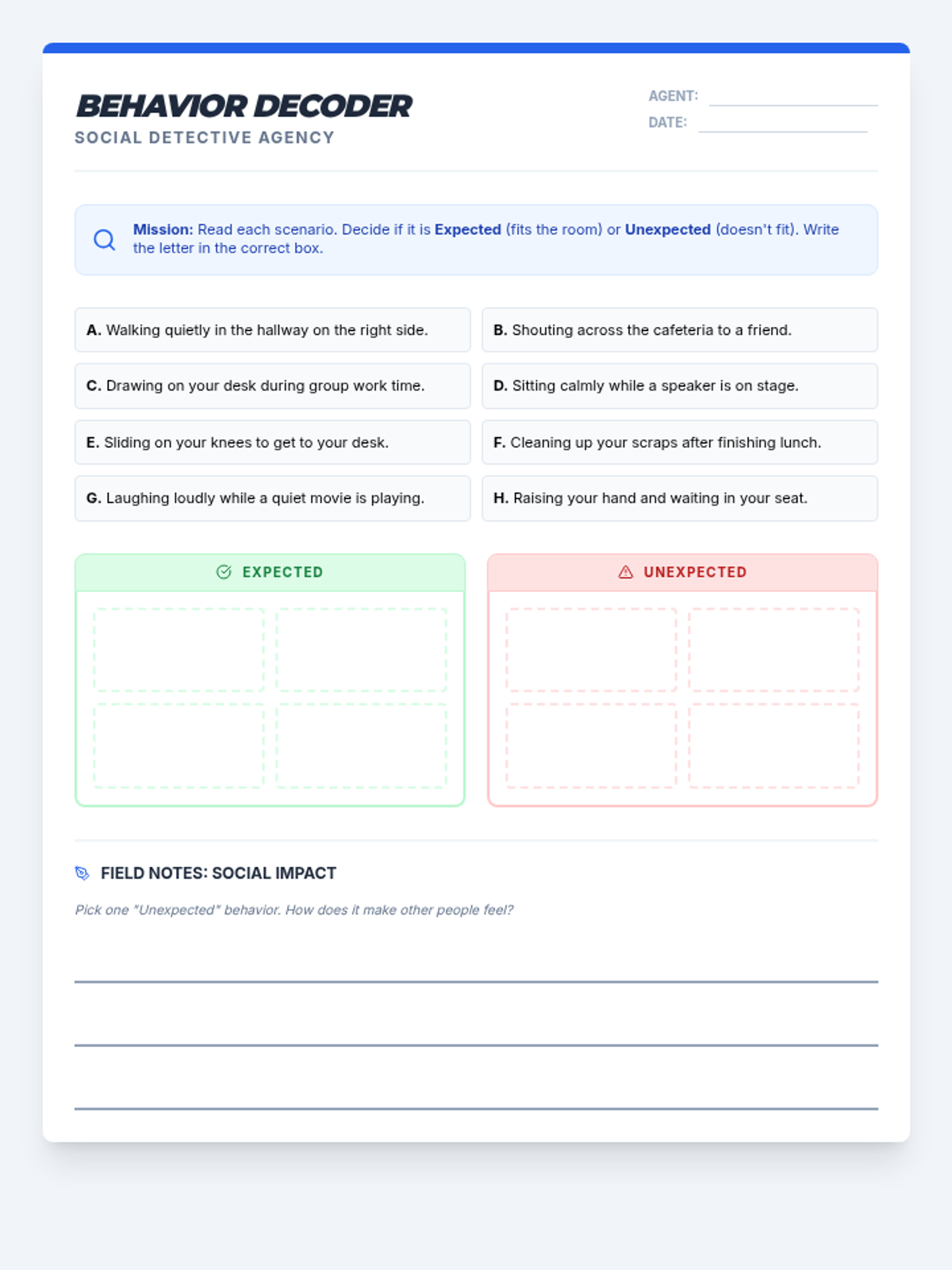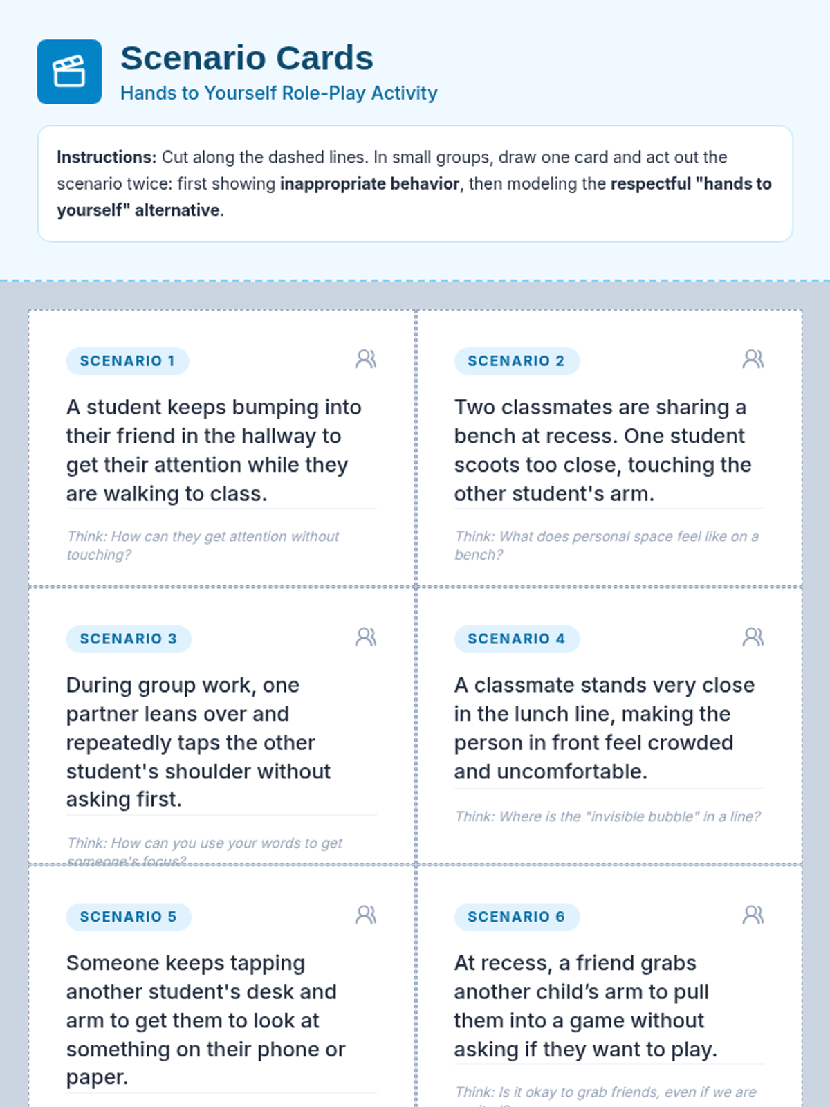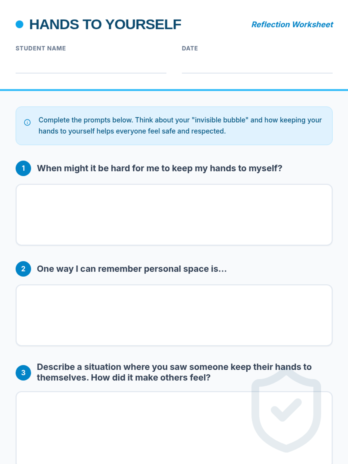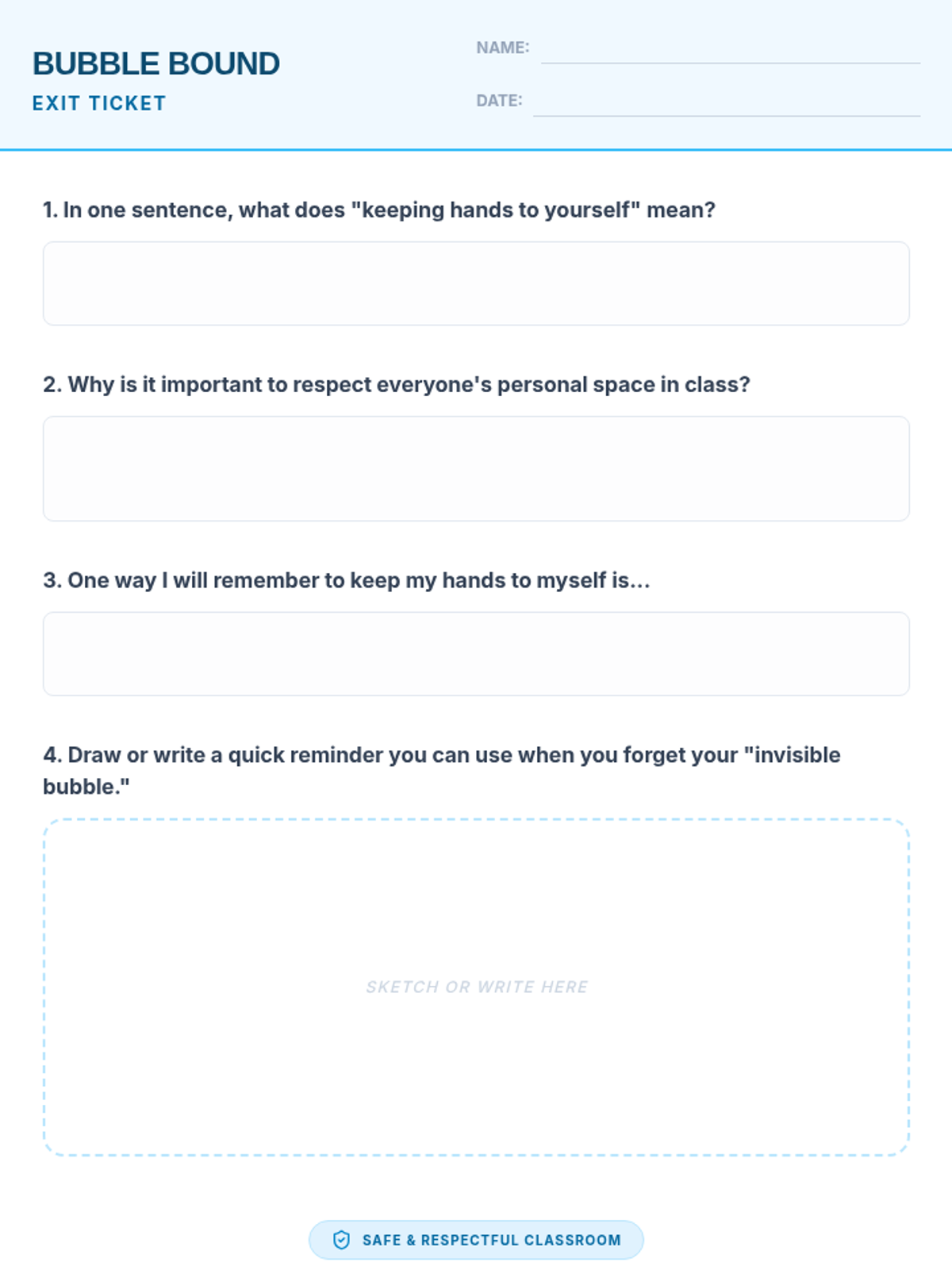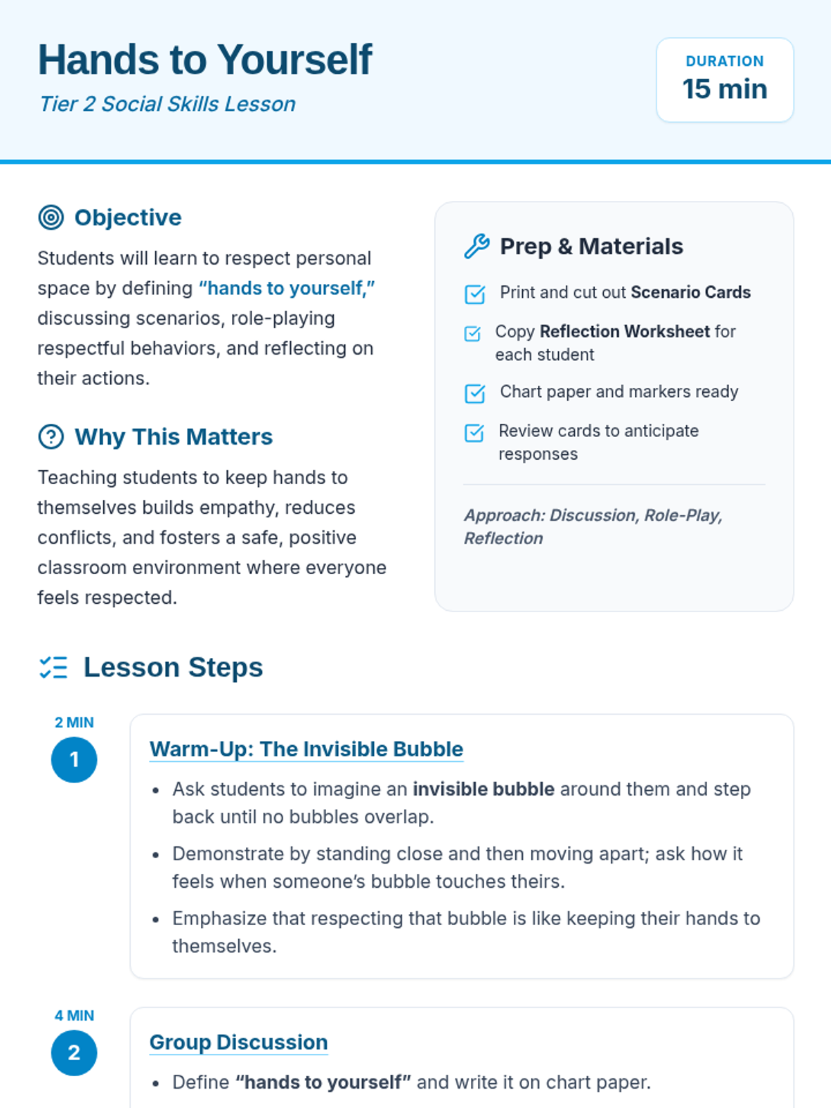 A 15-minute Tier 2 lesson for 5th graders focused on respecting personal space and physical boundaries through the concept of 'invisible bubbles'. Students engage in discussion, role-play, and personal reflection to strengthen social skills and empathy.