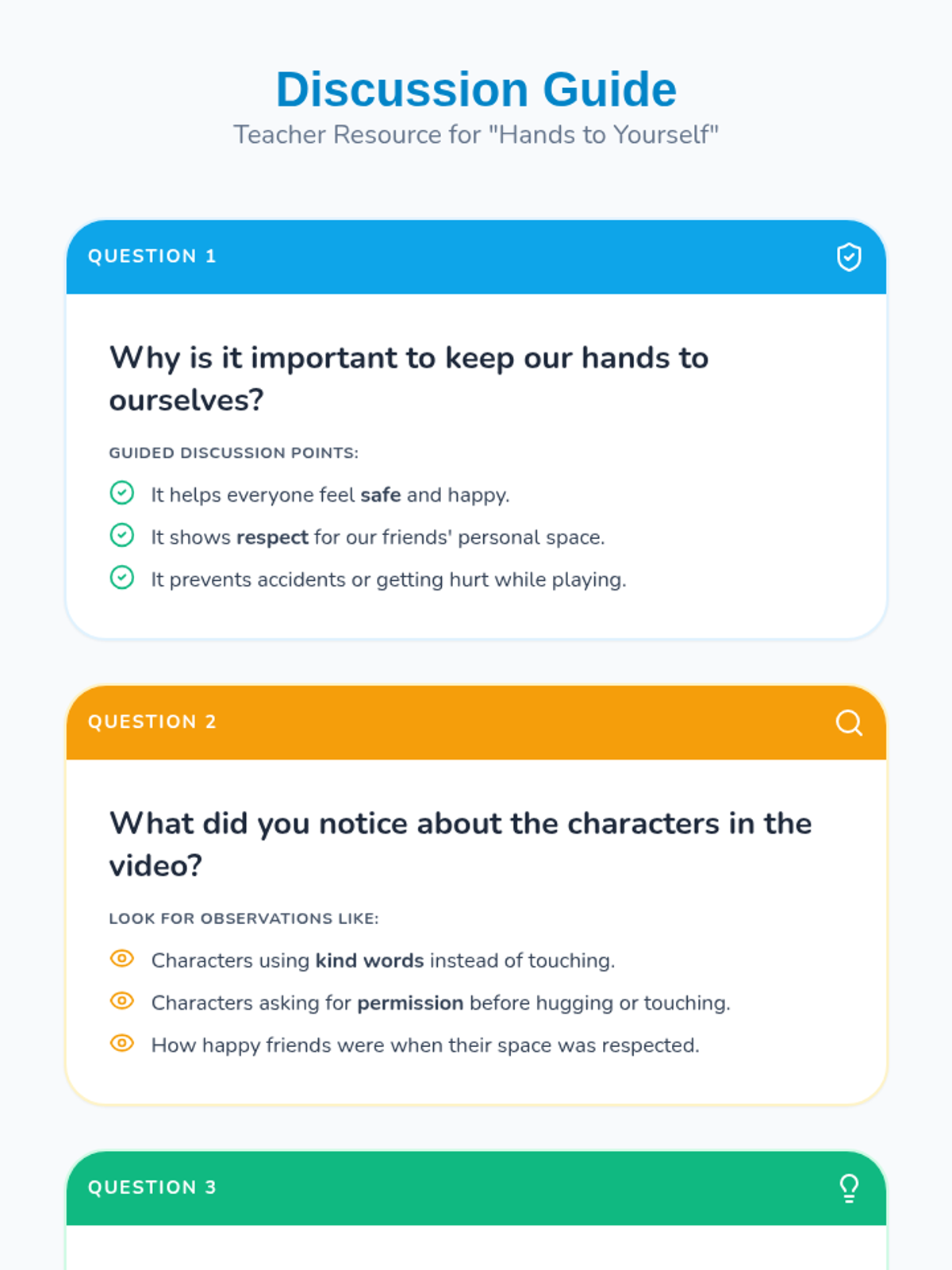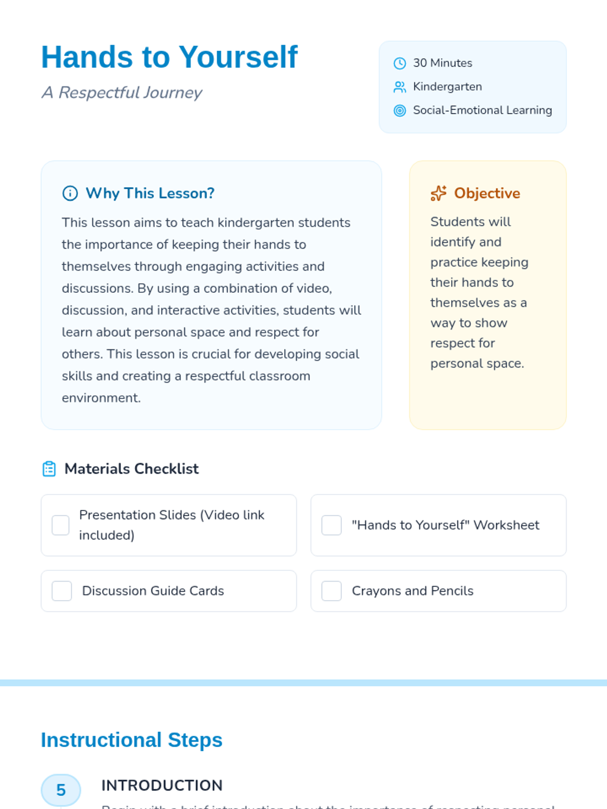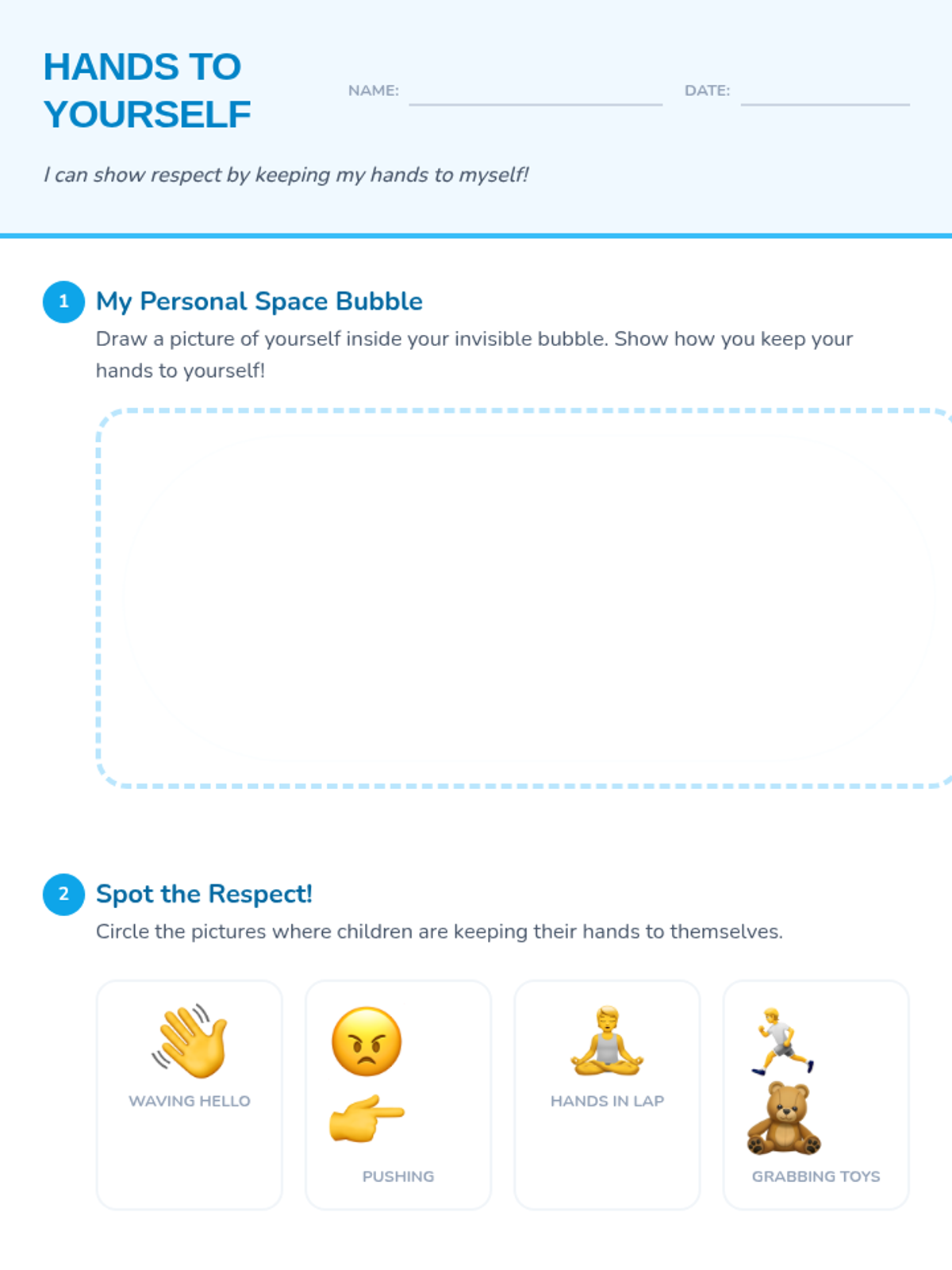 This kindergarten lesson teaches students the importance of respecting personal space and keeping their hands to themselves through the story 'A Little Respectful Spot' and interactive 'Space Bubble' activities.