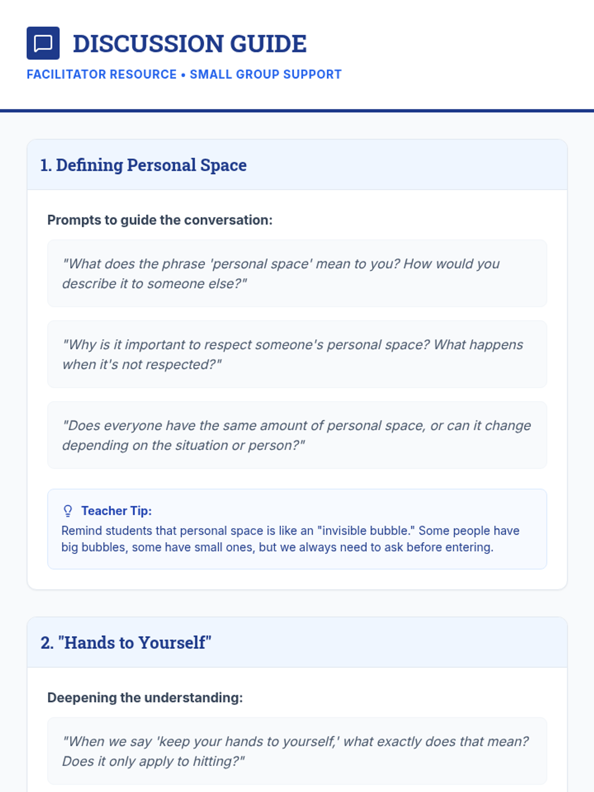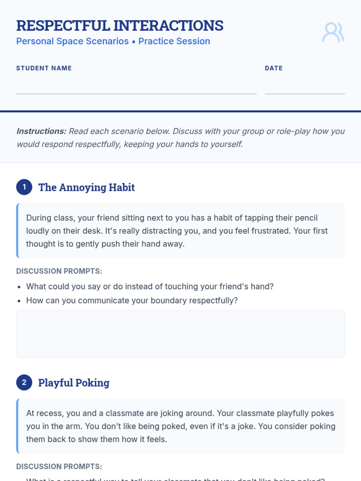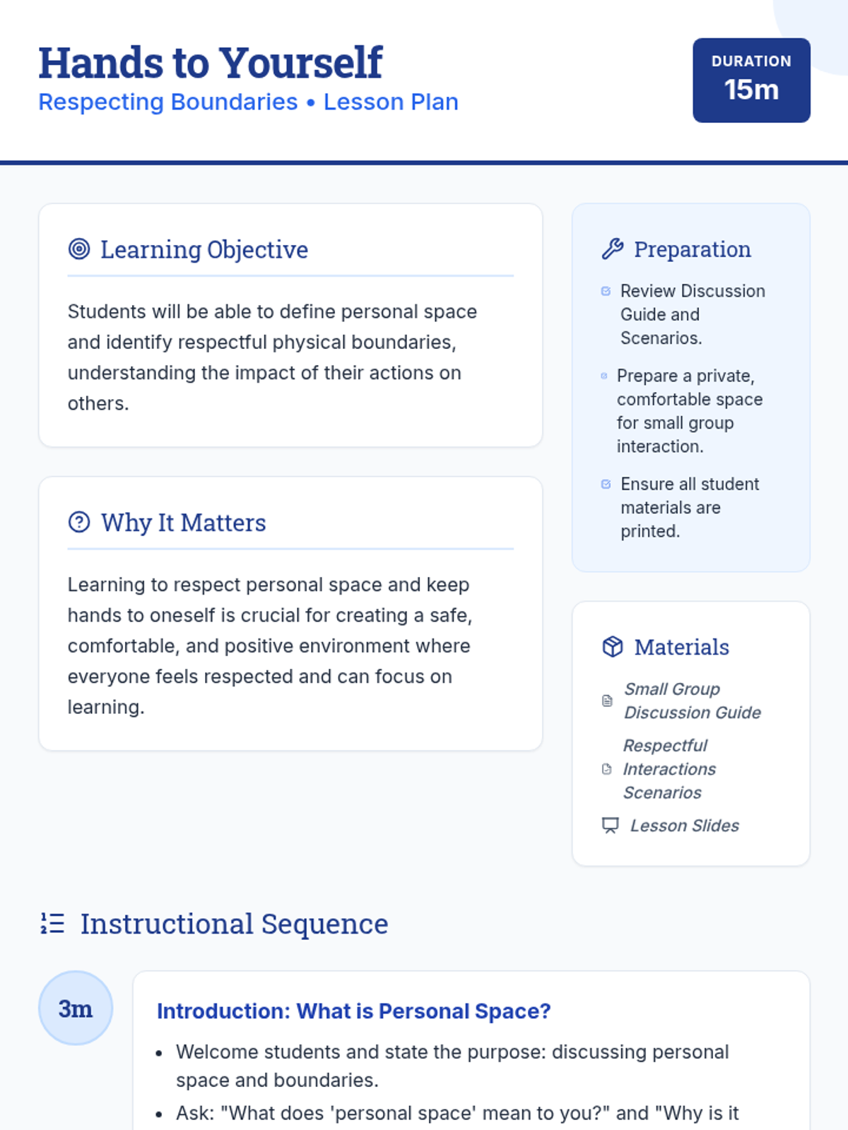 A 15-minute Tier 2 small group lesson for 6th graders focused on understanding personal space and practicing respectful physical boundaries through discussion and scenarios.