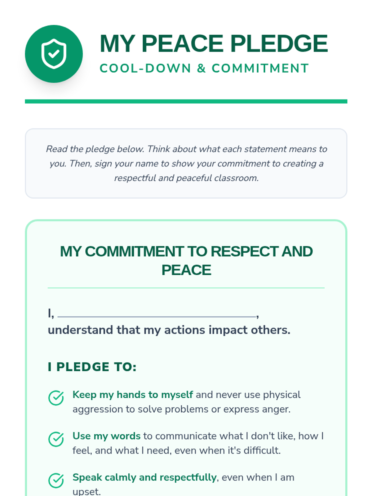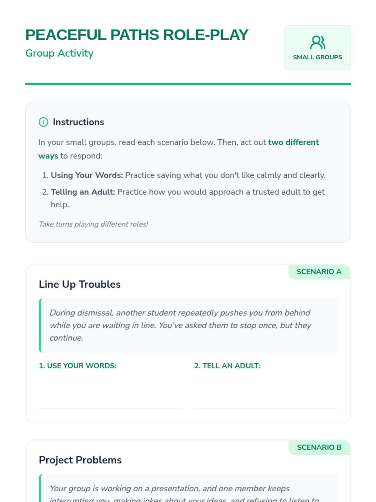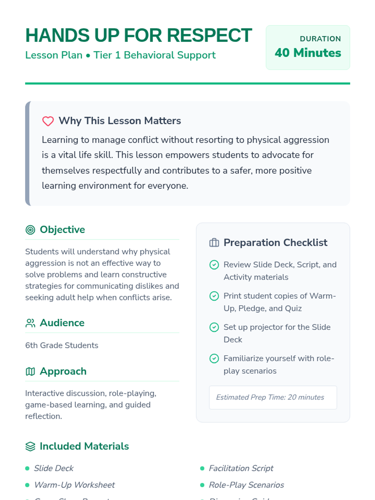 A 40-minute Tier 1 lesson for 6th-grade students focused on resolving conflicts peacefully through communication and seeking adult help instead of physical aggression.