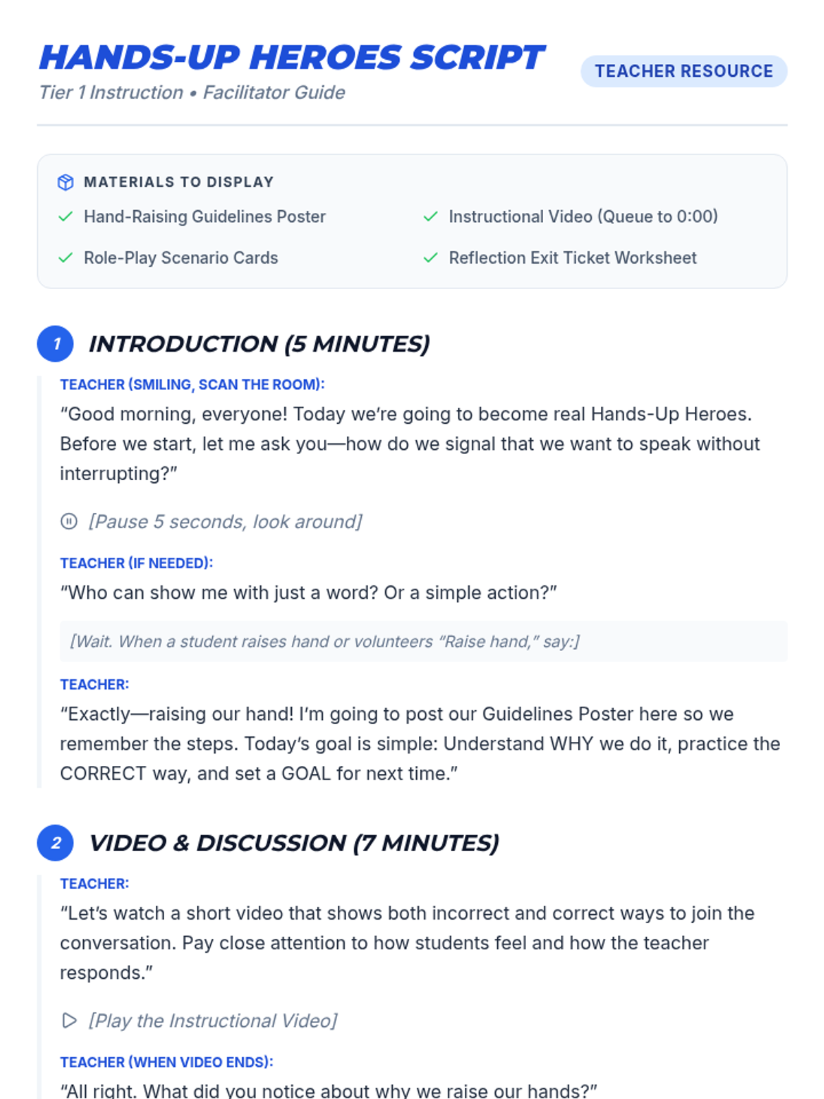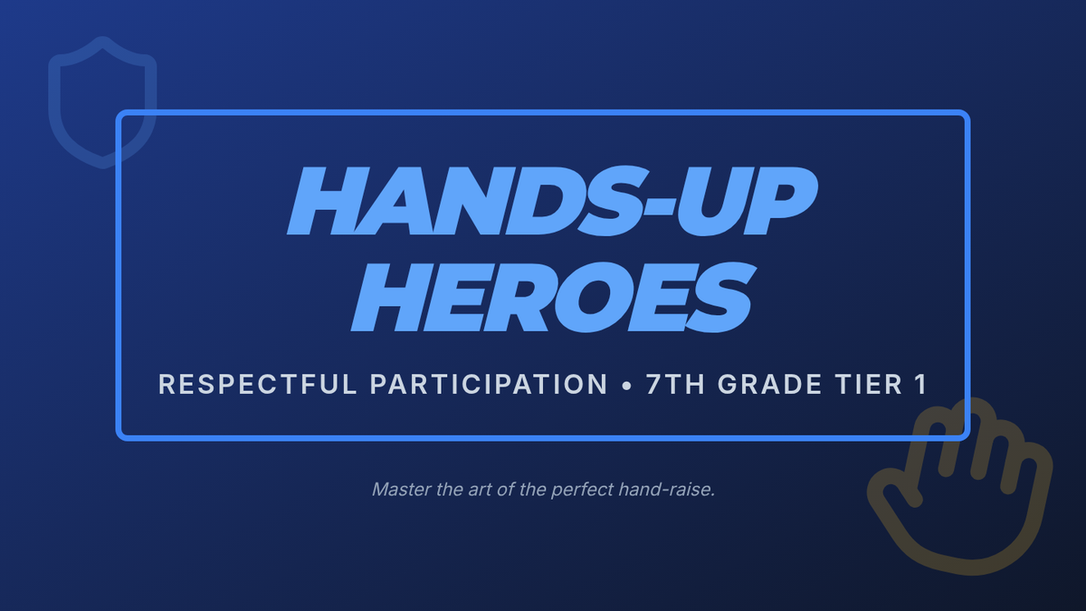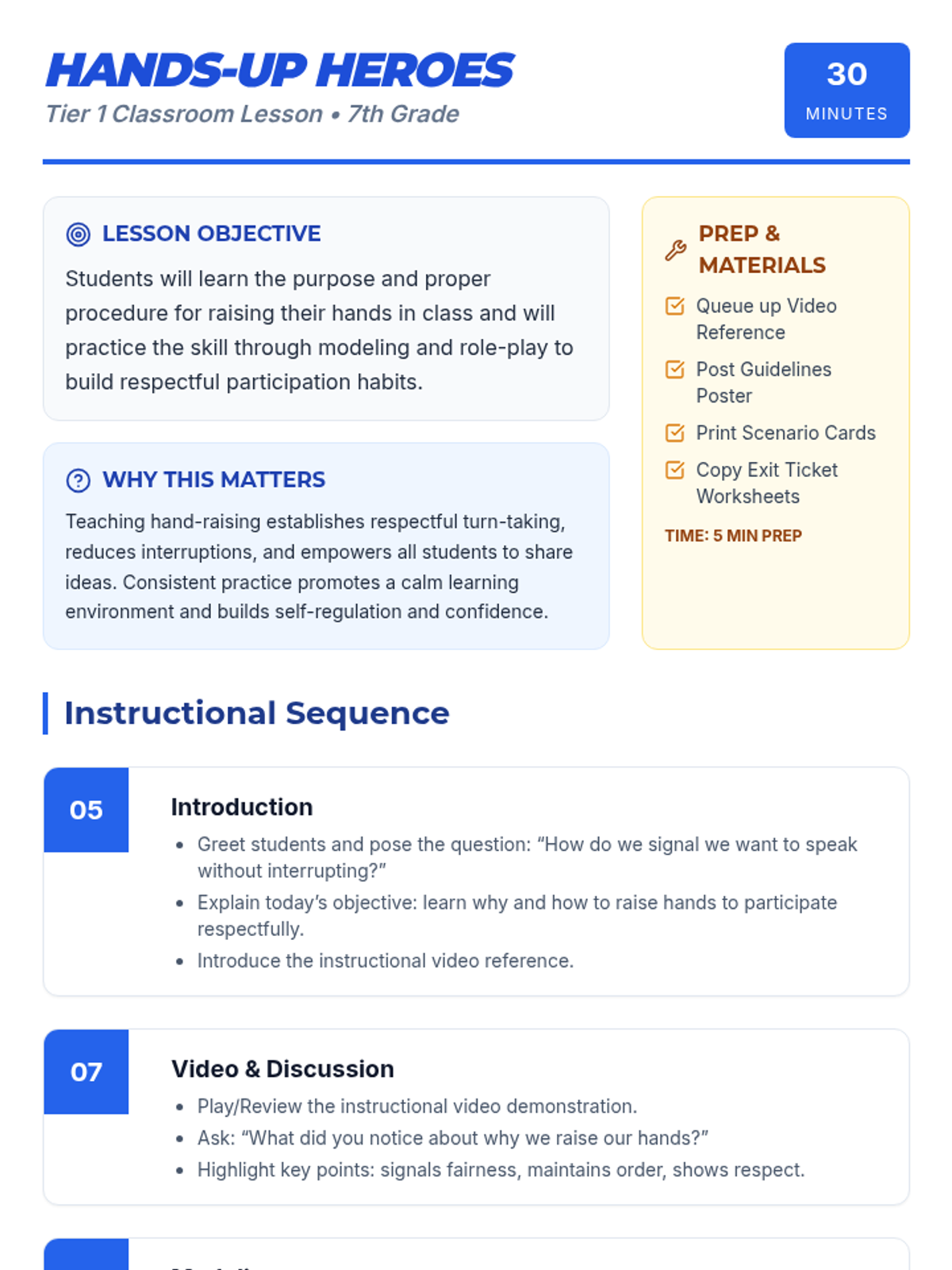 A 30-minute Tier 1 lesson for 7th graders focused on respectful classroom participation through hand-raising. Students engage with modeling, role-play, and reflection to build self-regulation and etiquette.