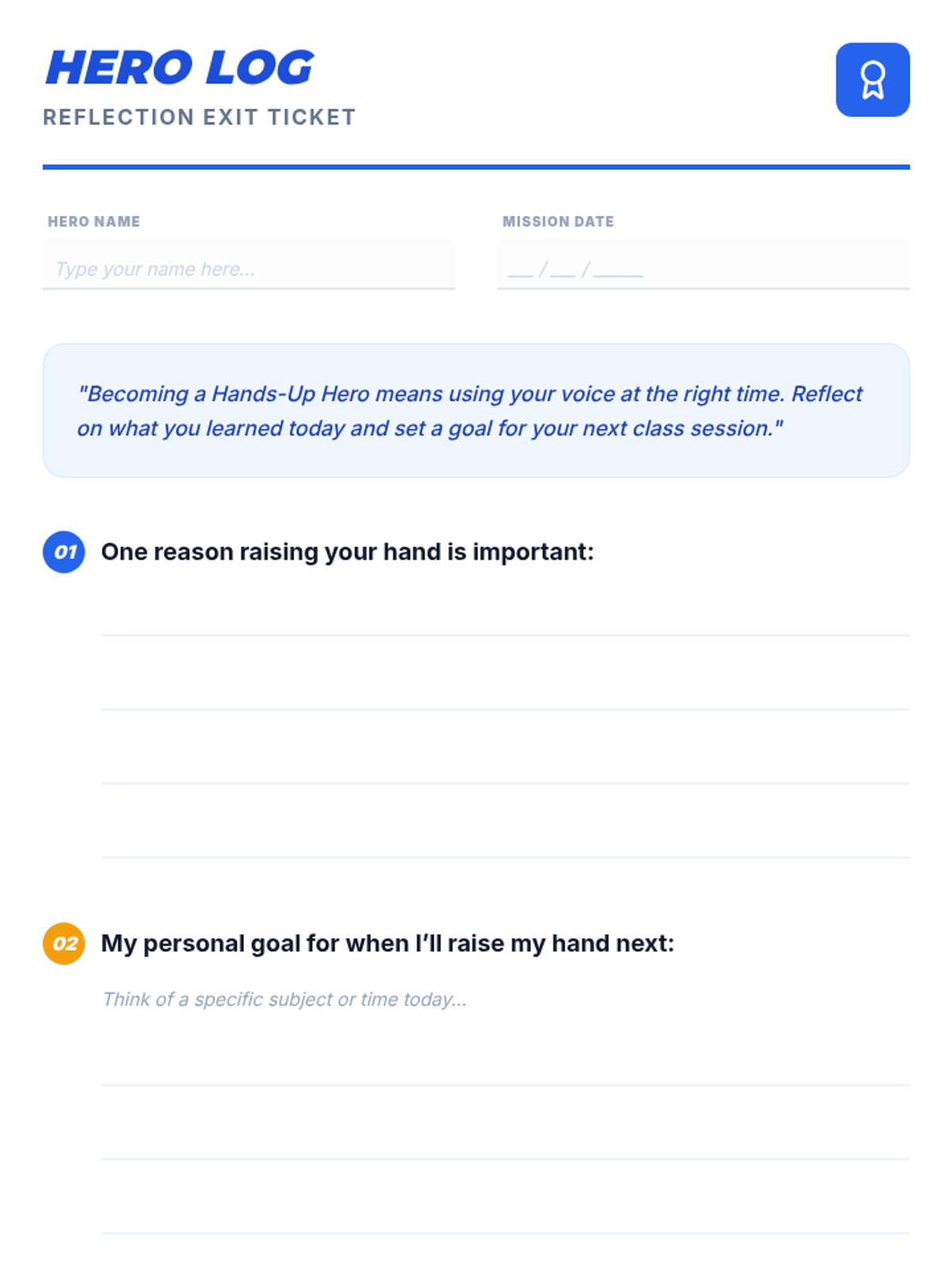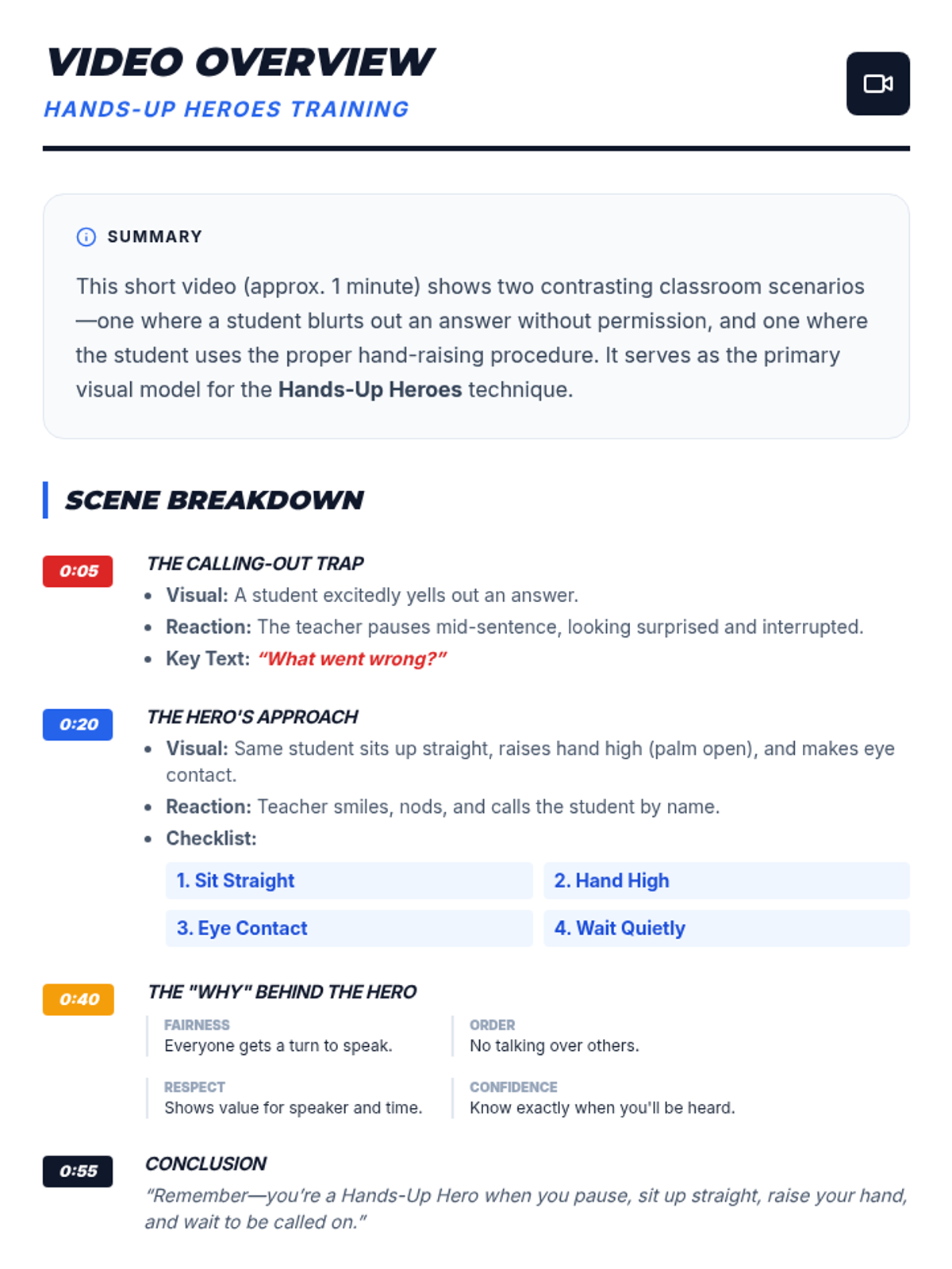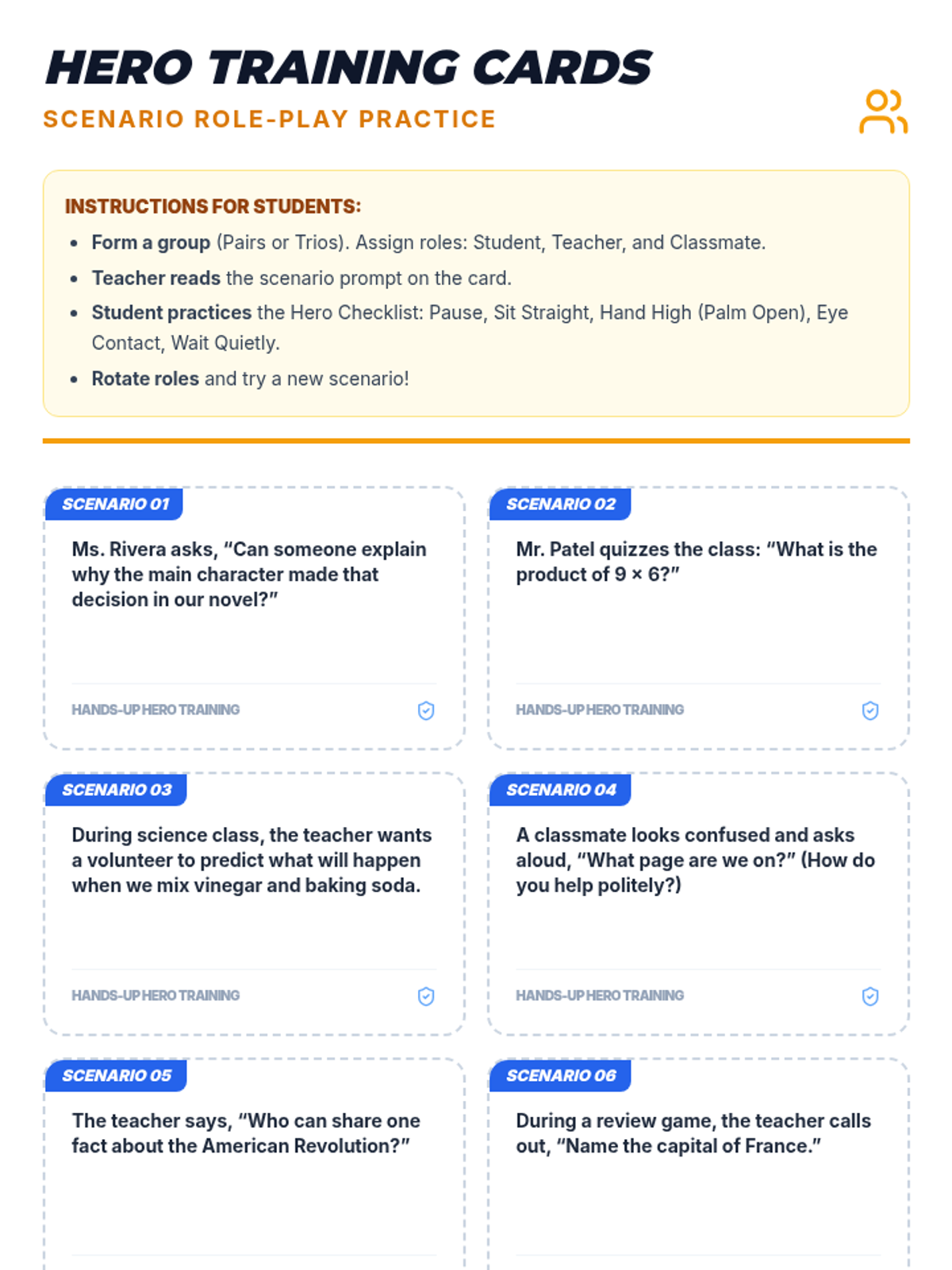 A 30-minute Tier 1 lesson for 7th graders focused on respectful classroom participation through hand-raising. Students engage with modeling, role-play, and reflection to build self-regulation and etiquette.