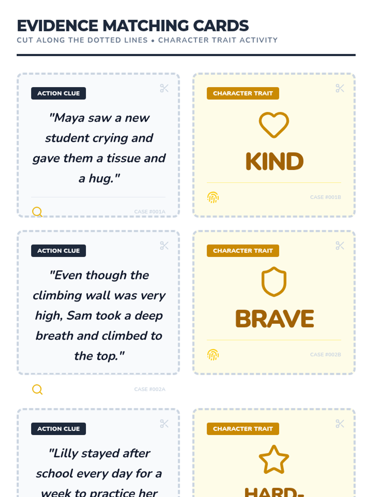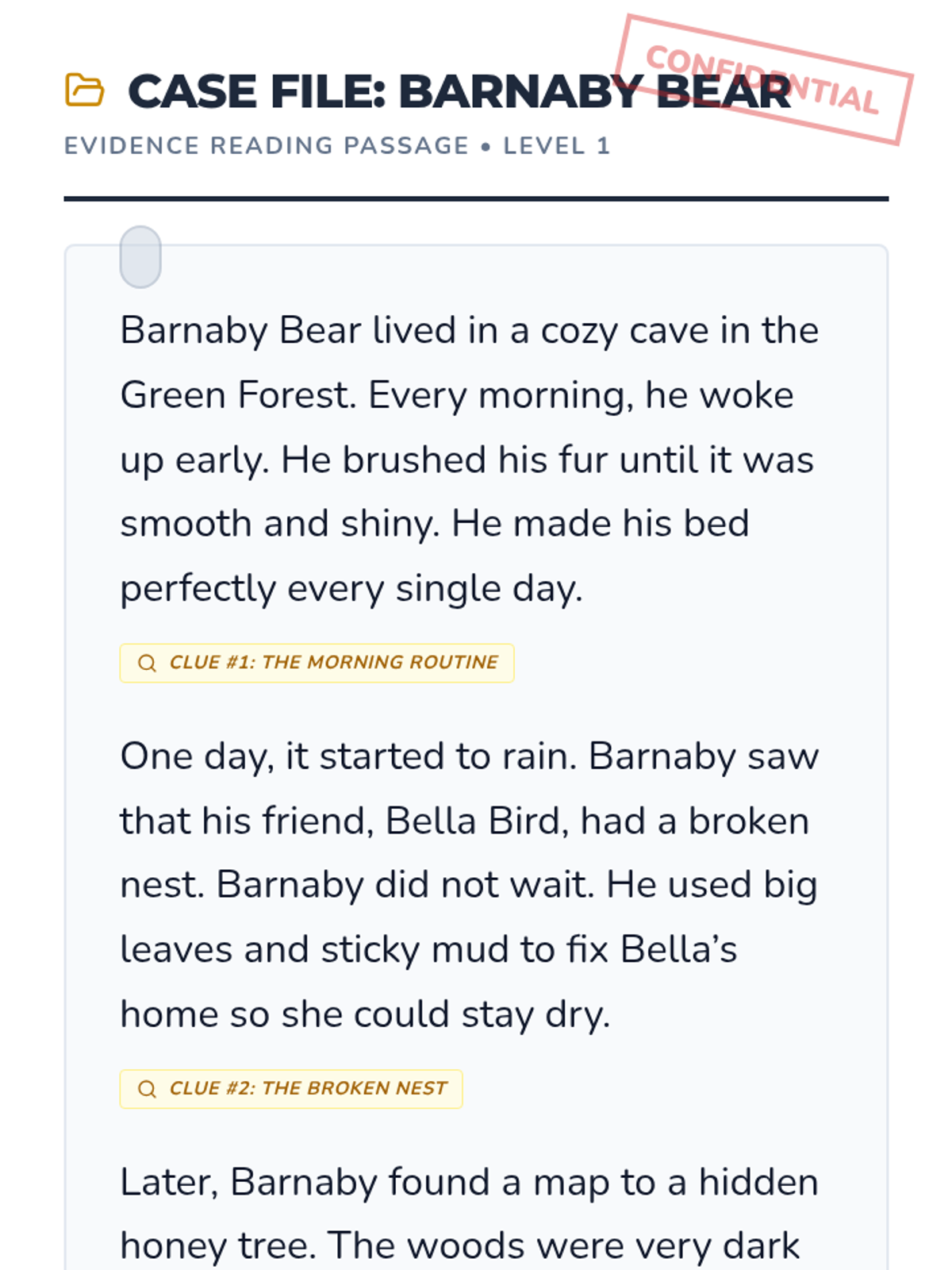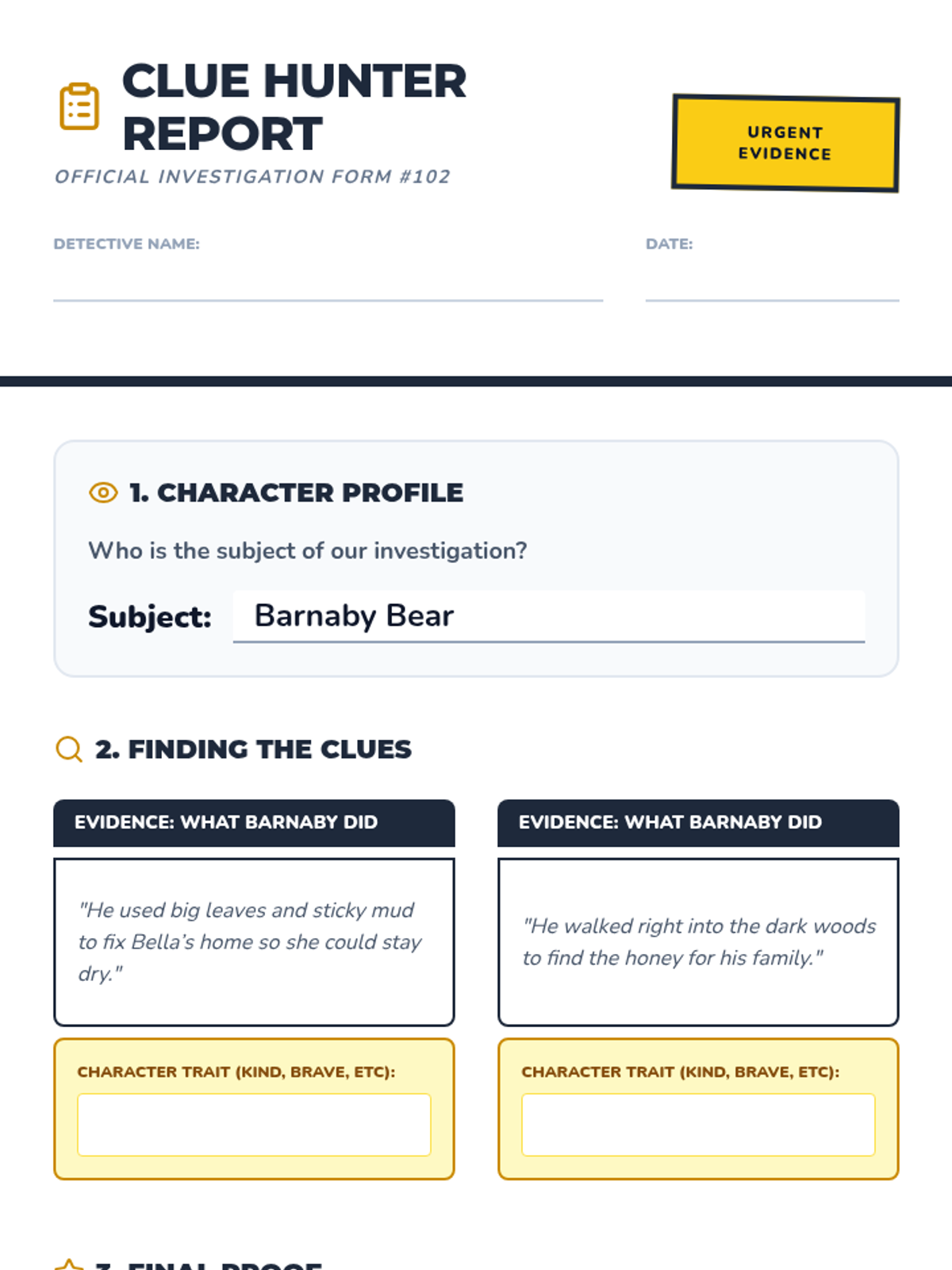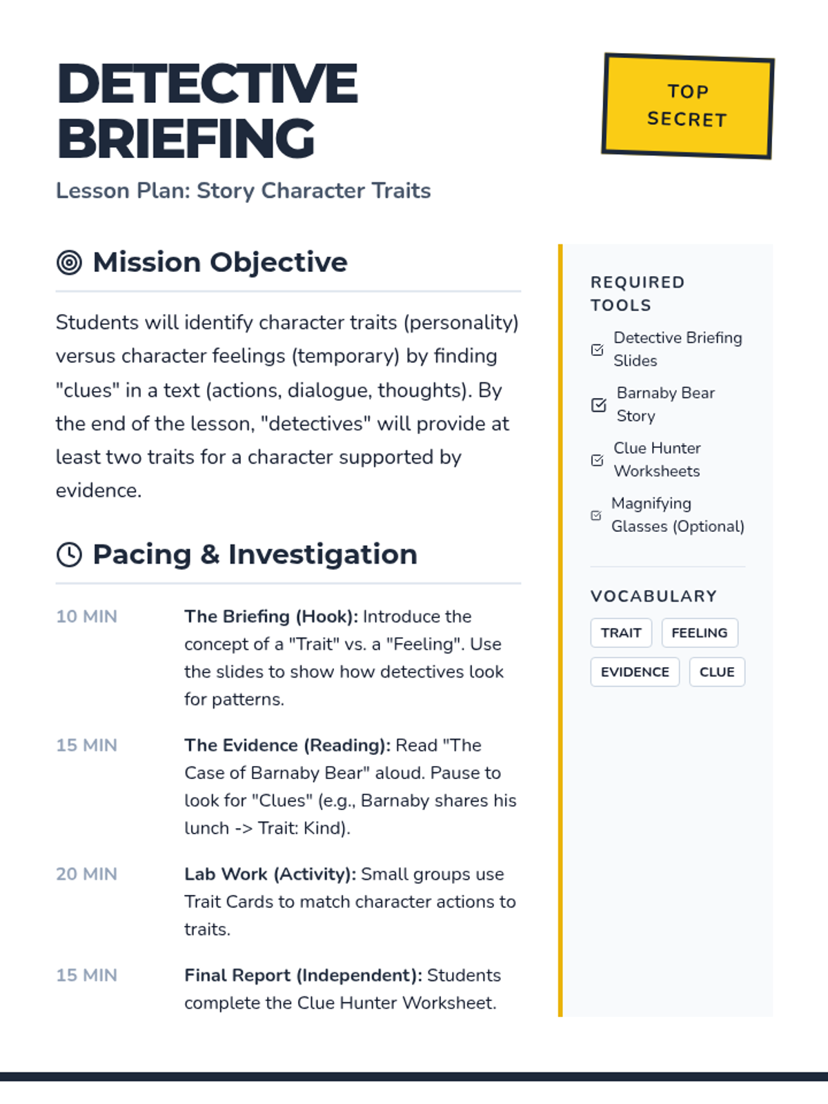 A 1st-grade ELA lesson where students become 'detectives' to identify and describe character traits using clues from a story. This lesson combines interactive slides, a short mystery-style reading, and hands-on investigation activities.
