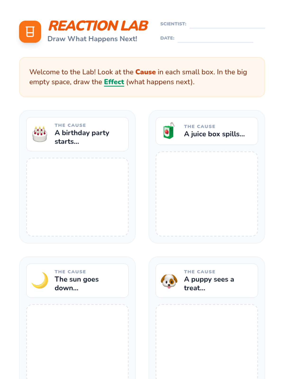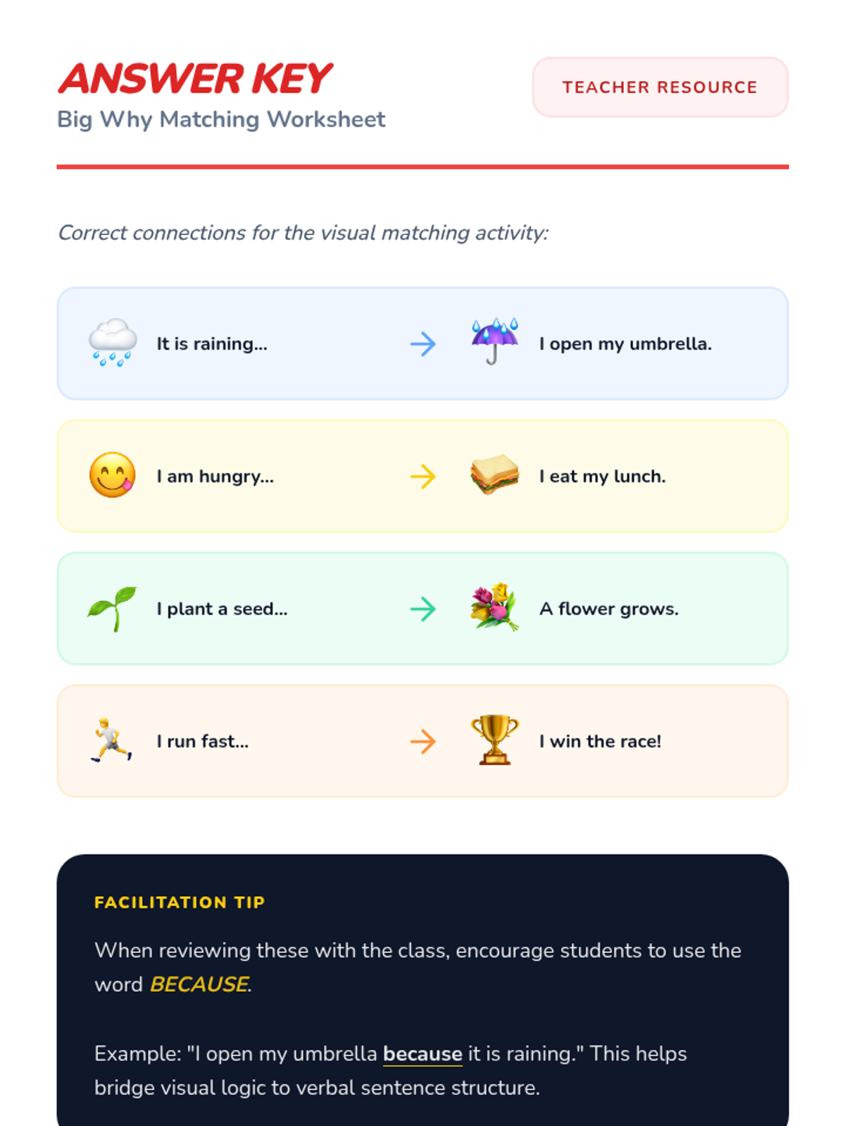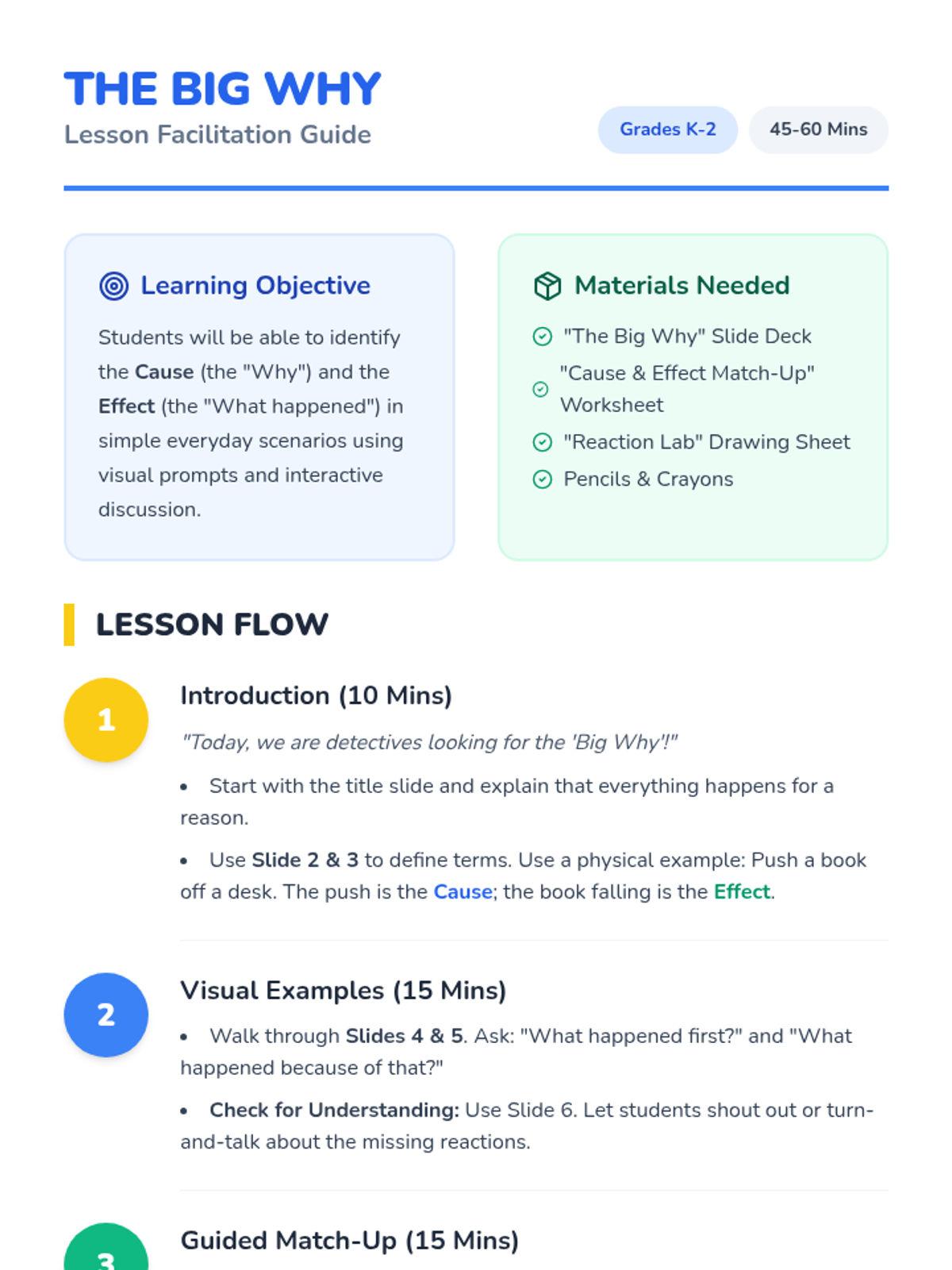 An introductory lesson on cause and effect for K-2 students, using the theme of 'The Big Why' to explore how actions lead to reactions through visual storytelling and hands-on matching.