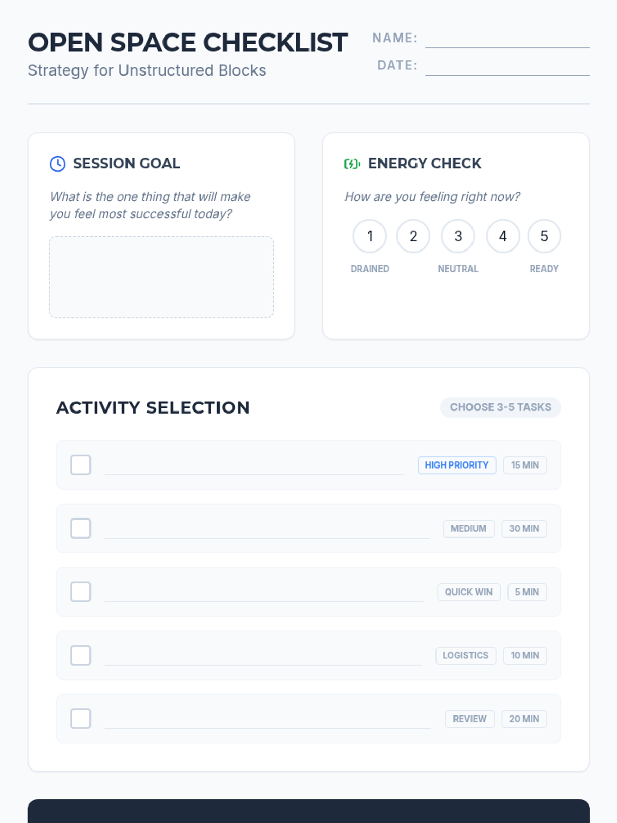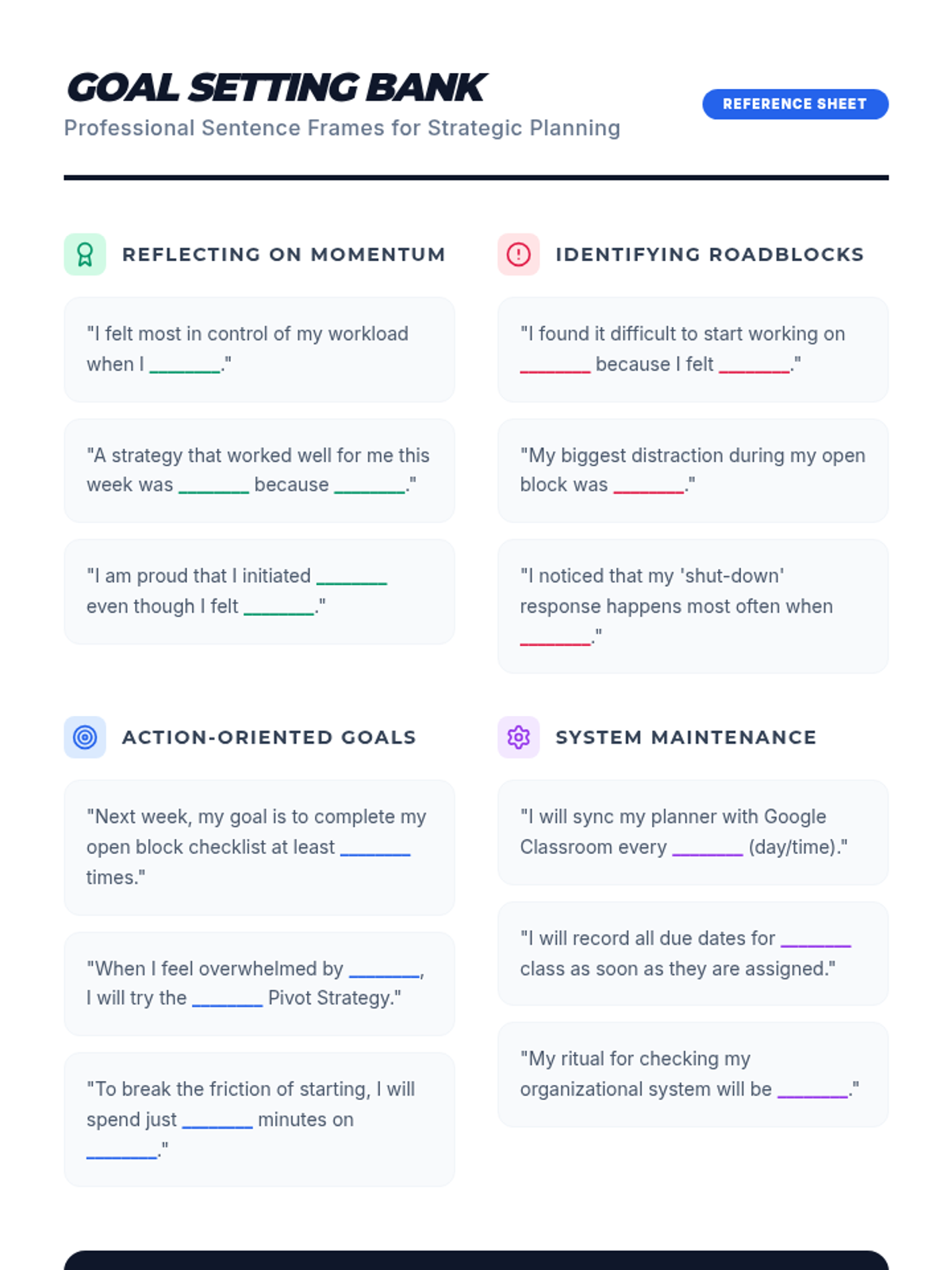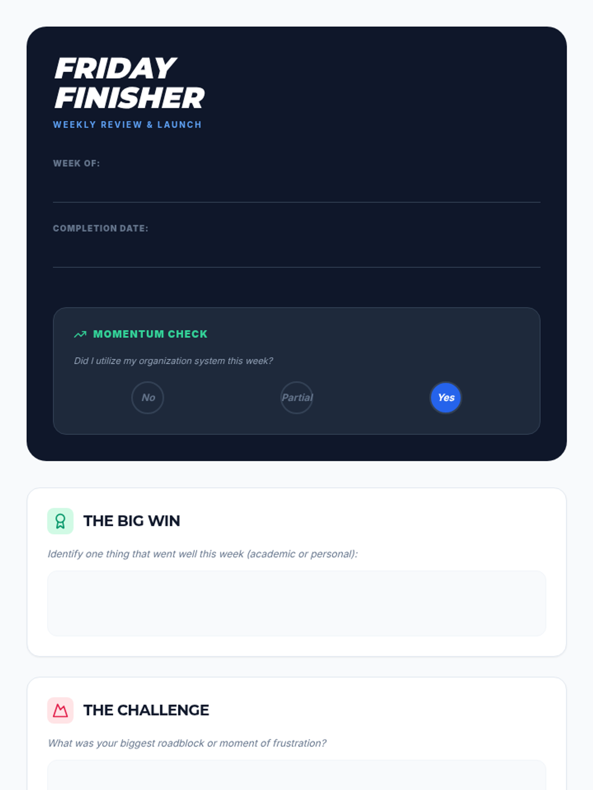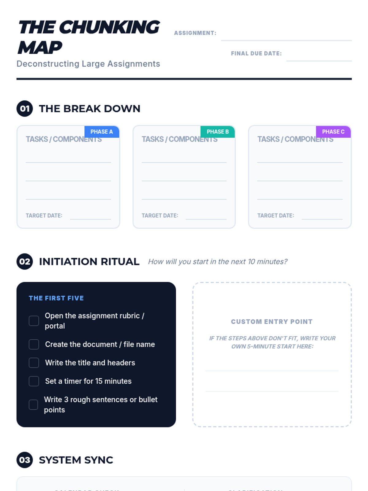 A comprehensive set of executive functioning tools designed for high schoolers to manage unstructured time, break down complex projects, and reflect on academic stressors. These materials use a modern, professional aesthetic to ensure age-appropriateness for an 11th-grade student.