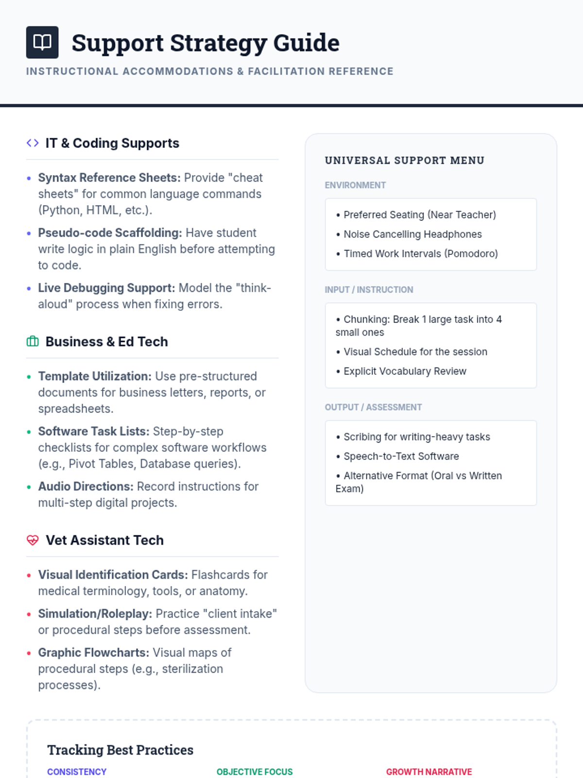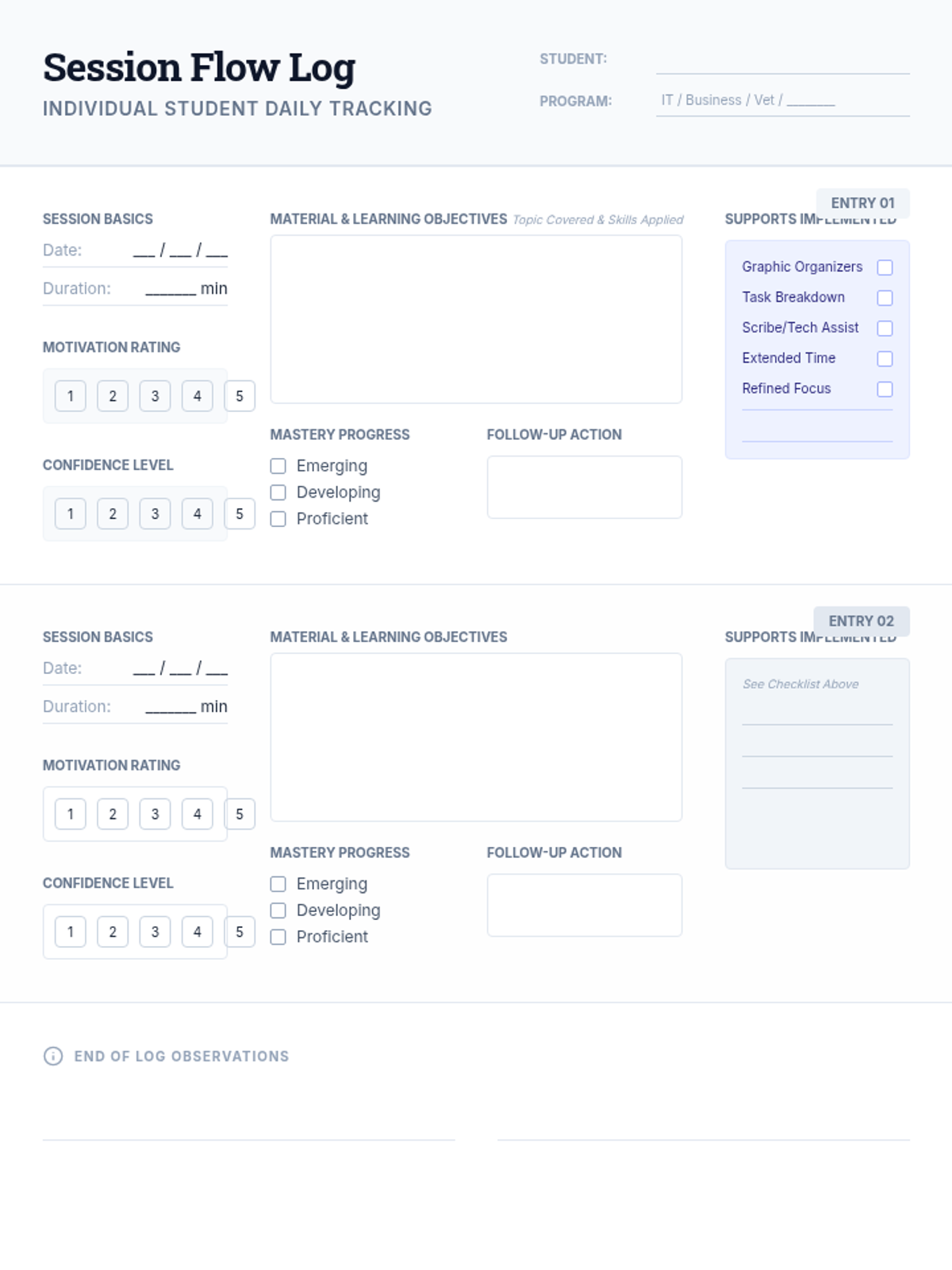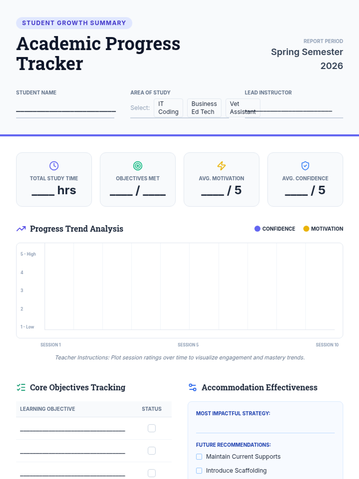 A comprehensive system for tracking individual student progress in supported study sessions, including daily logs and long-term summaries for IT, Business, and Vocational subjects.