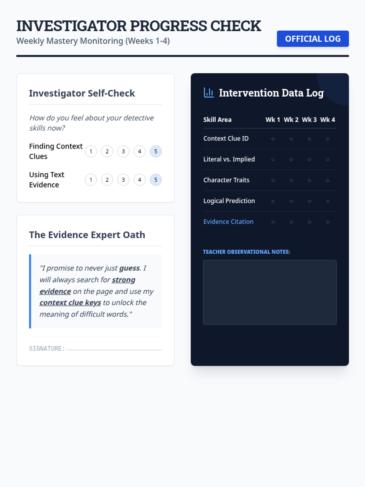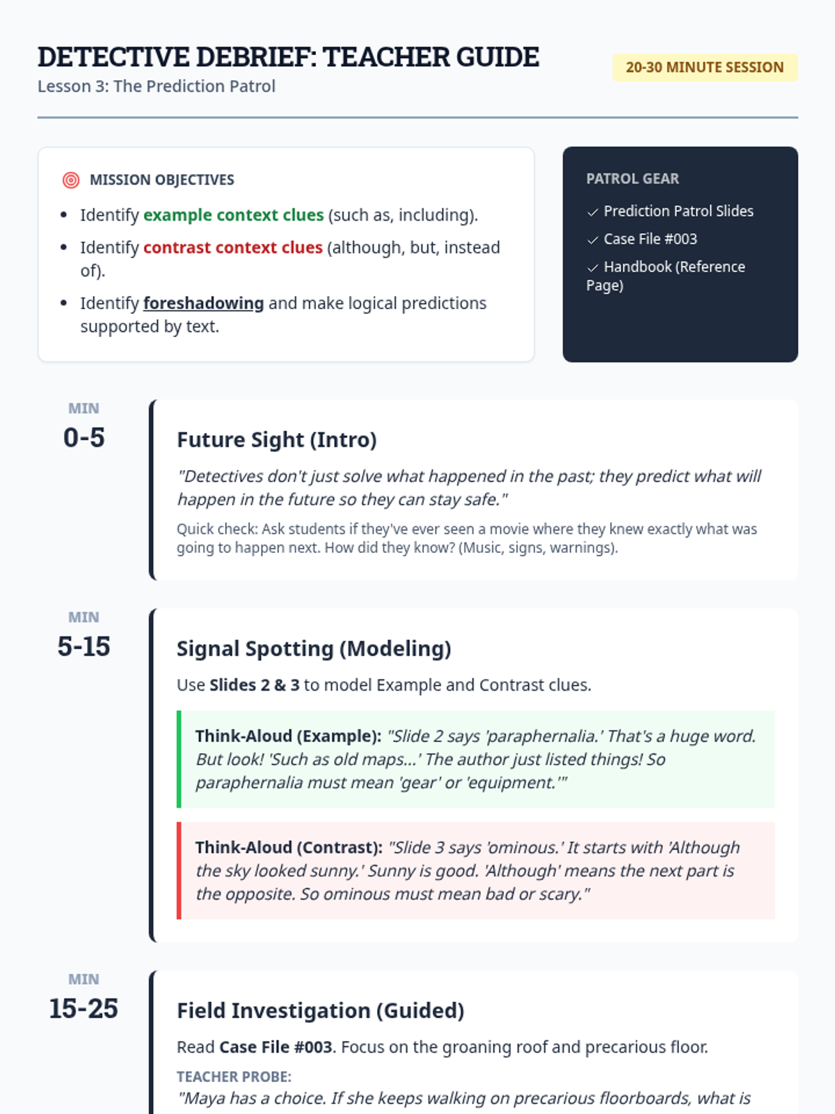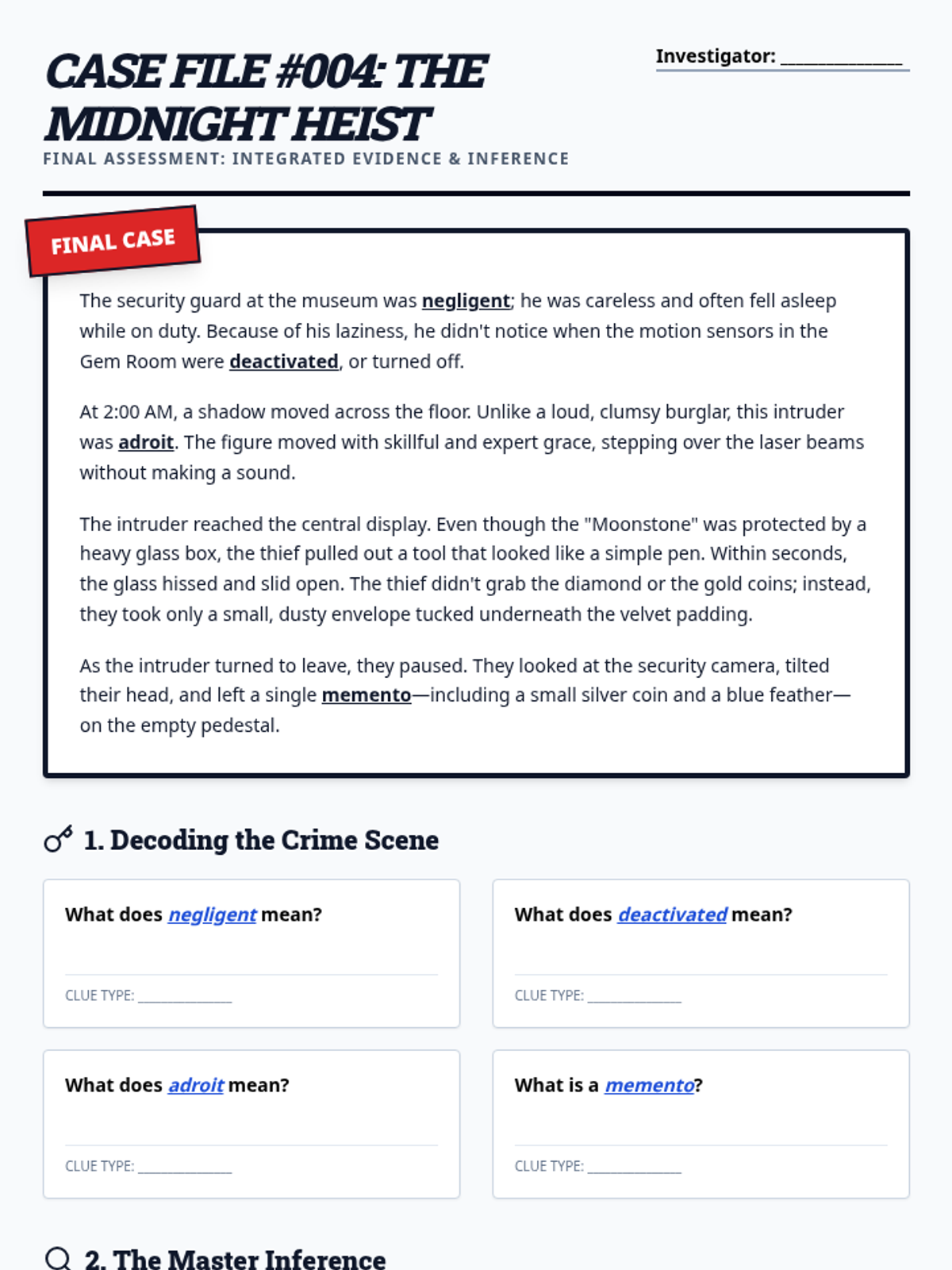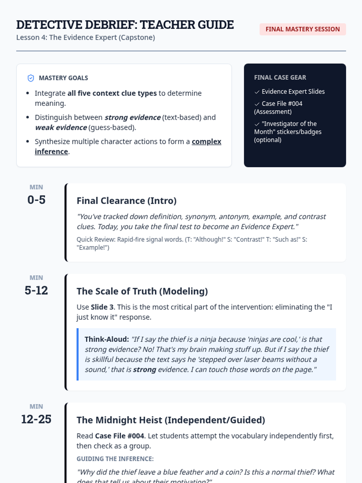 The capstone of the intervention where students integrate all context clue types and focus on selecting the 'strongest' evidence to support complex inferences. Includes a final 'case' to solve.
