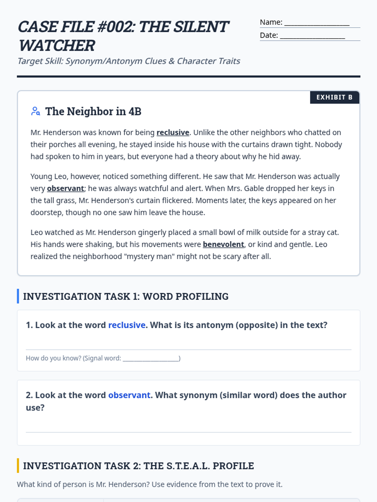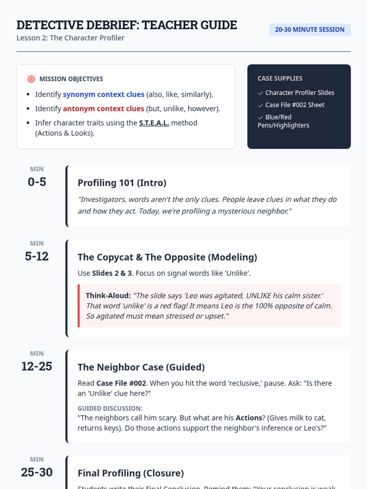 Teaches students how to use synonyms and antonyms as context clues while inferring character traits and emotions from dialogue and actions. Practices focus on identifying 'clues' in a character's behavior.