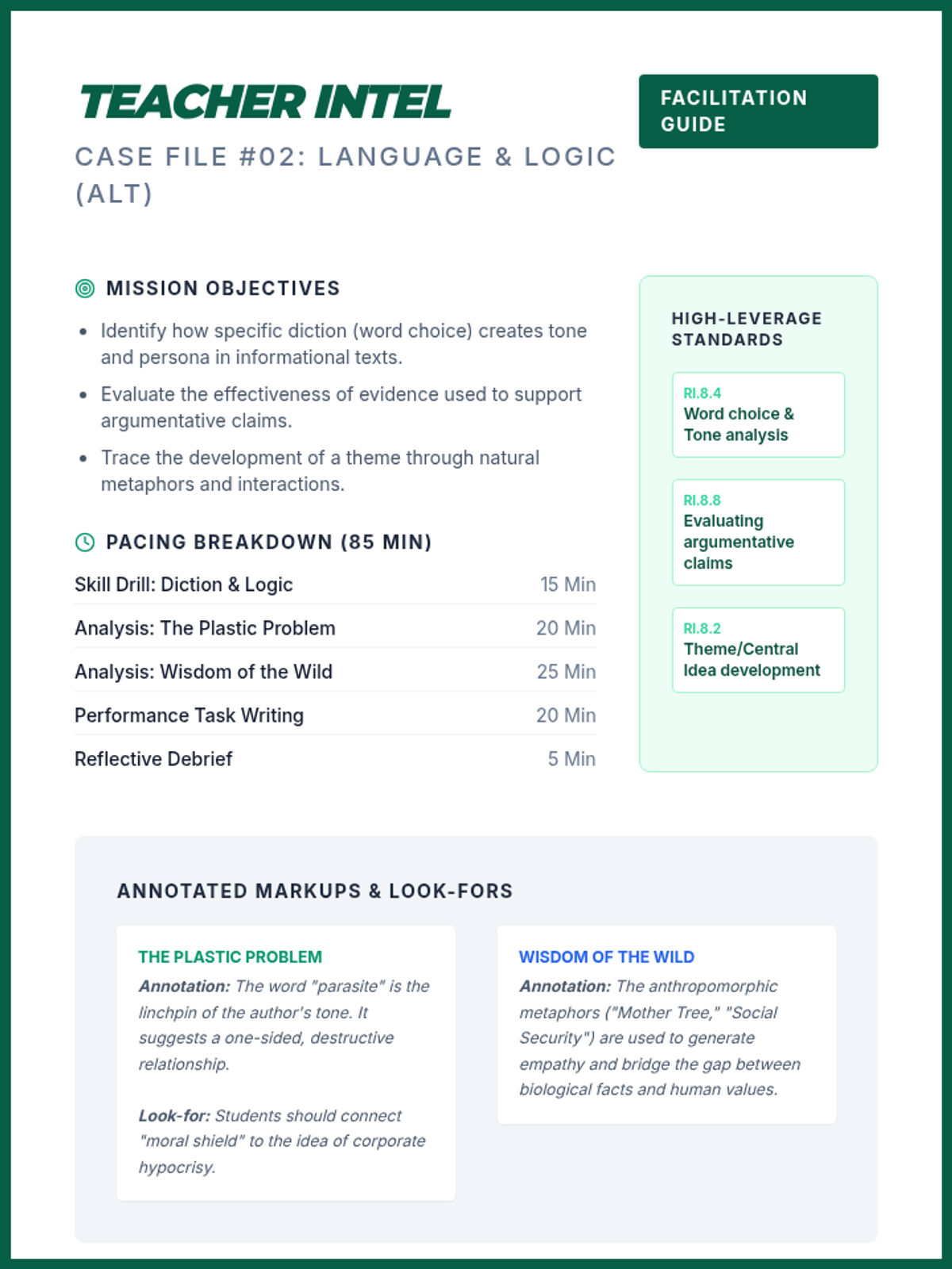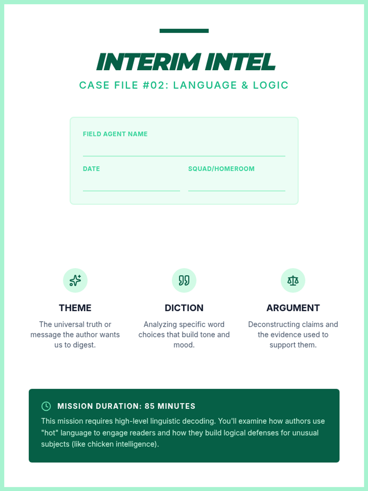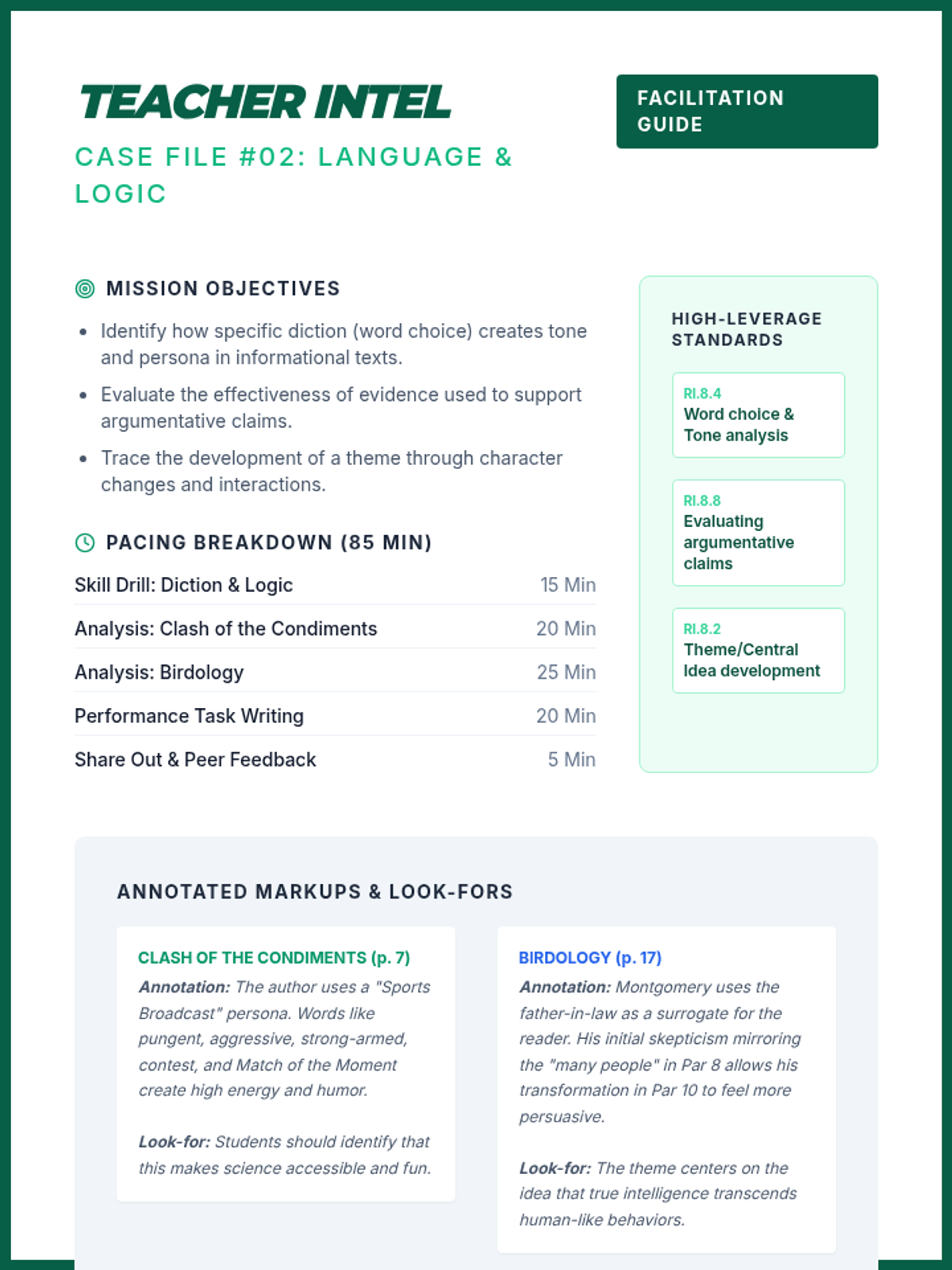 Focused on theme development, diction analysis, and identifying argumentative claims. Uses 'Clash of the Condiments' to explore author's tone and 'Birdology' to examine evidence-based claims.