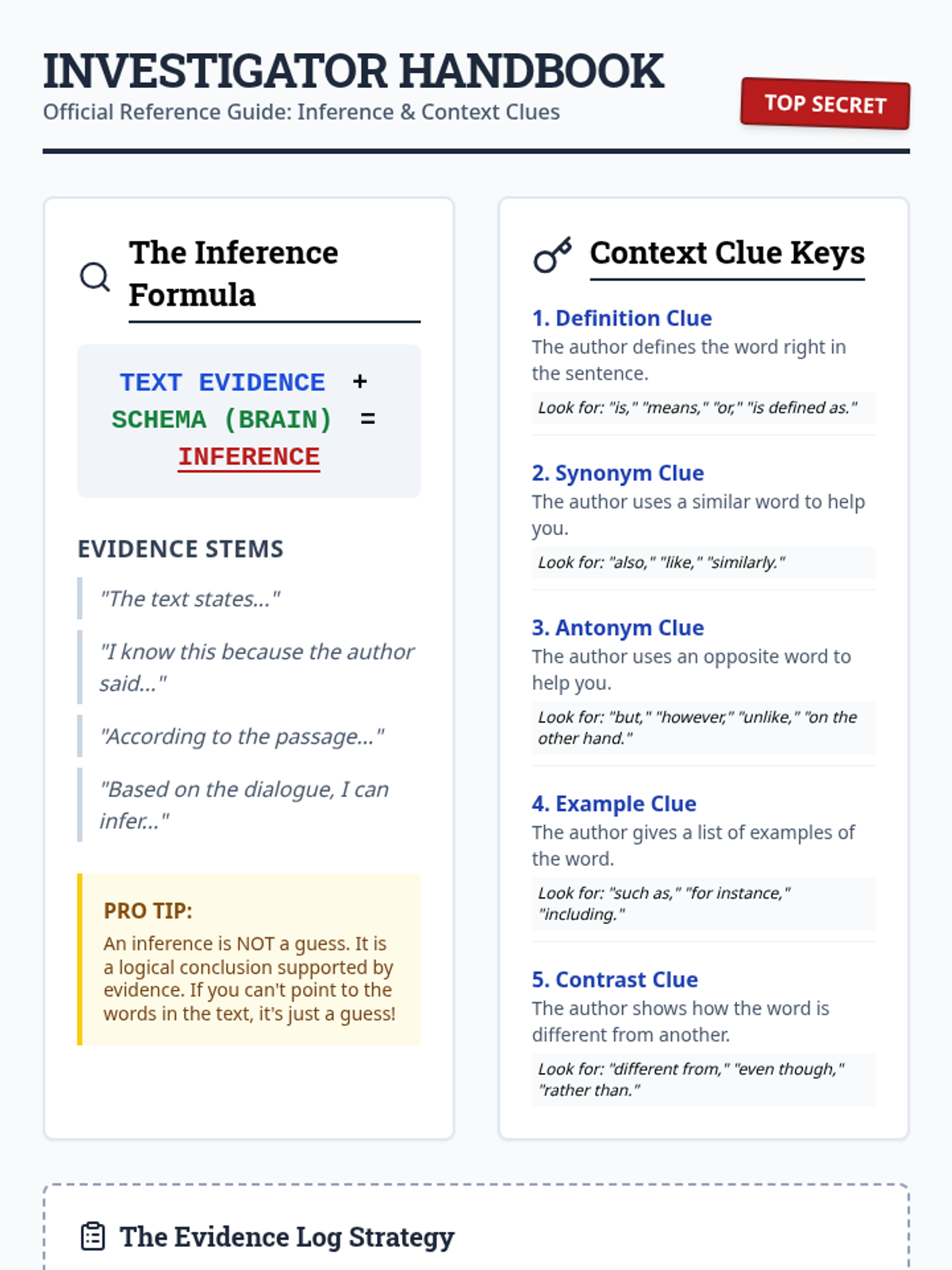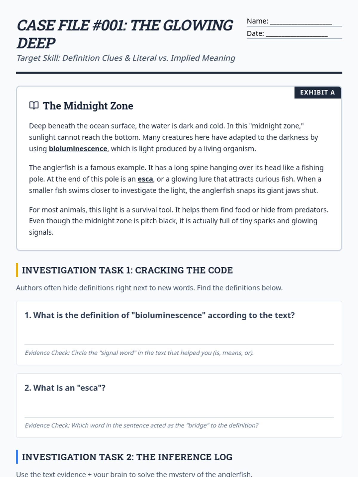 Focuses on identifying explicit definition clues in text and distinguishing between literal facts and implied meanings. Students begin building their 'Investigator Handbook' and practice with a bioluminescence nonfiction text and a mystery fiction text.