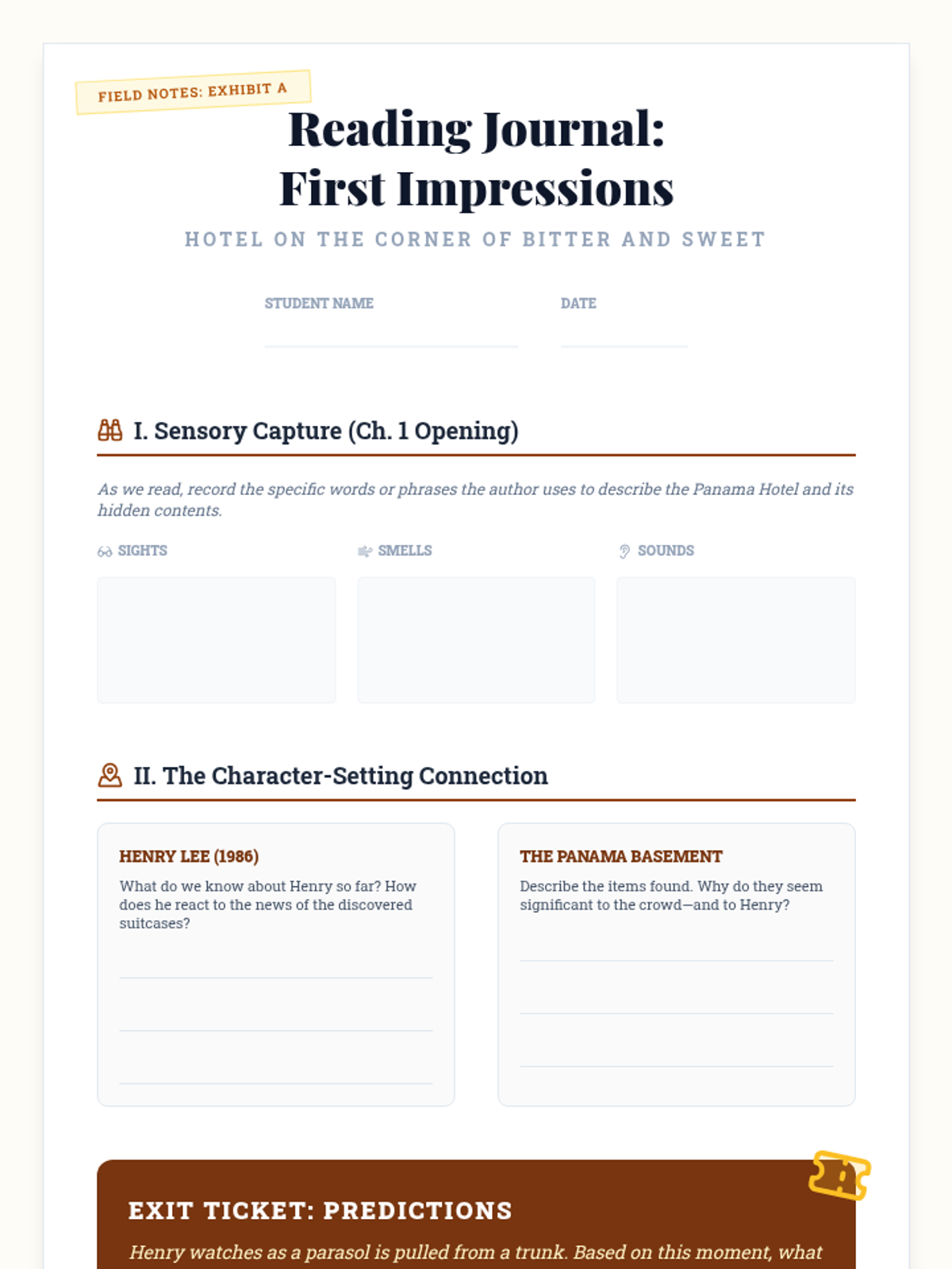 An introductory lesson to the novel 'Hotel on the Corner of Bitter and Sweet', focusing on the historical setting of the Panama Hotel and initial character impressions through an anticipation guide and guided reading.