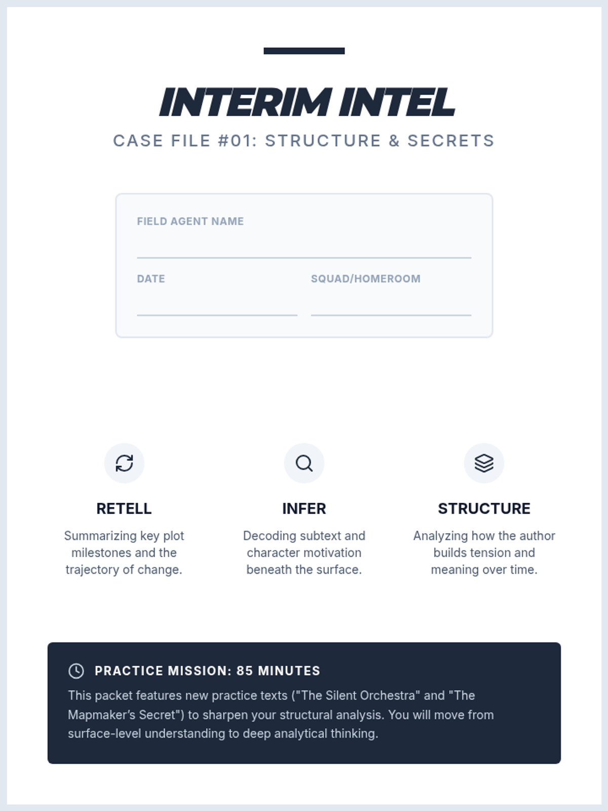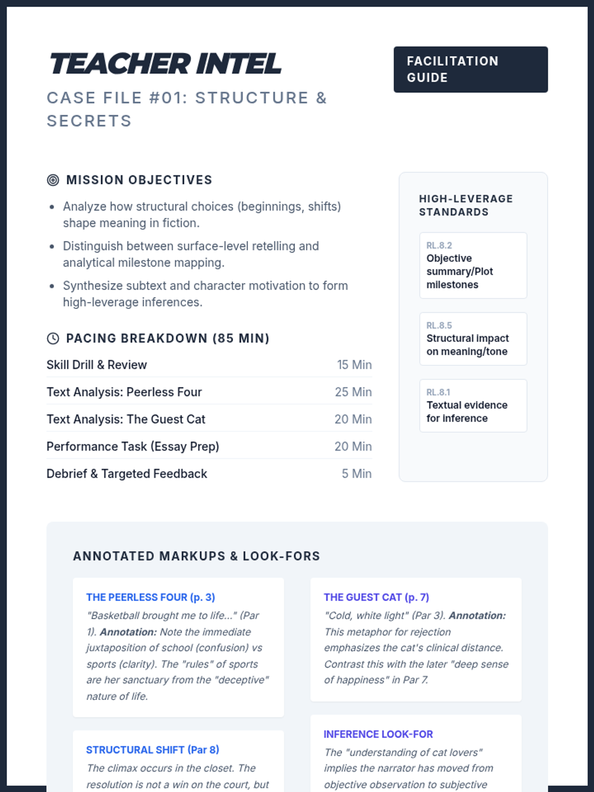 Focused on retell, inference, and structure analysis using 'The Peerless Four' and 'The Guest Cat'. Students practice identifying plot milestones and how structural choices affect meaning.