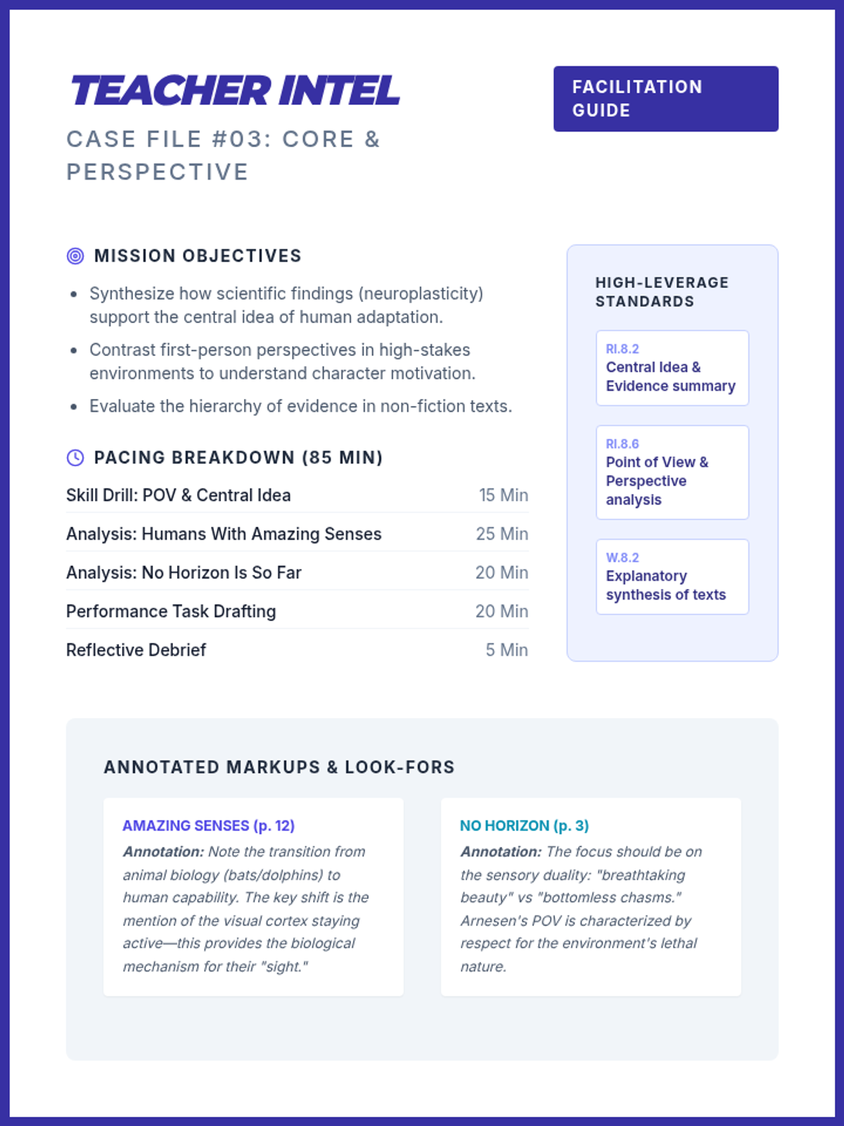 Focused on identifying central ideas in informational texts and analyzing how point of view shapes a narrative. Uses 'Humans With Amazing Senses' to study scientific concepts and 'No Horizon Is So Far' to explore personal perspective in extreme environments.