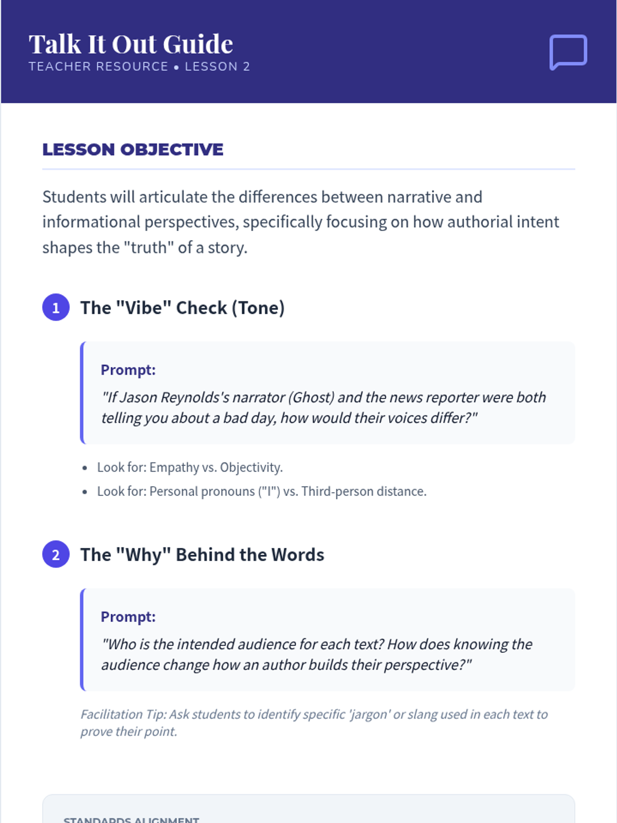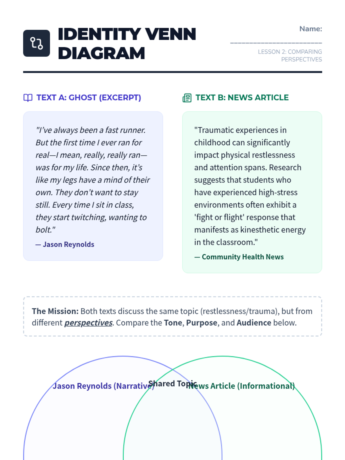 Students compare different perspectives on the same topic by analyzing a narrative excerpt from Jason Reynolds and a paired news article. The lesson focuses on how purpose and point of view change the delivery of information.
